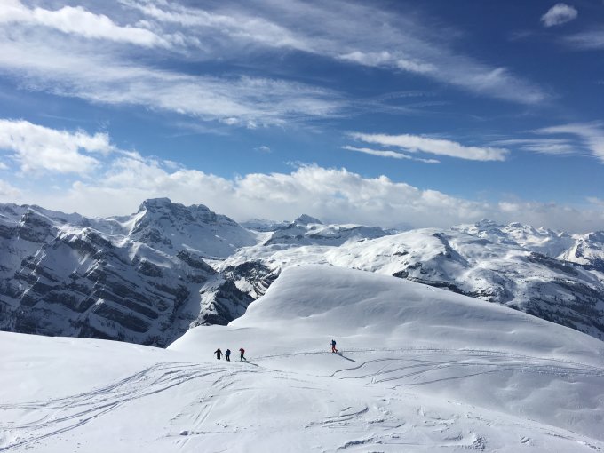 Aufstieg: zwei Tragepassagen im Wald, sonst dank ordentlicher Spur schnelles vorankommen möglich (in 2.5h am Gipfel). Abfahrt: oberhalb 2000Hm bzw. in der NW Flanke Presspulver, Mitte angesulzter aber tragender Deckel, unten nass.