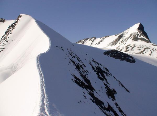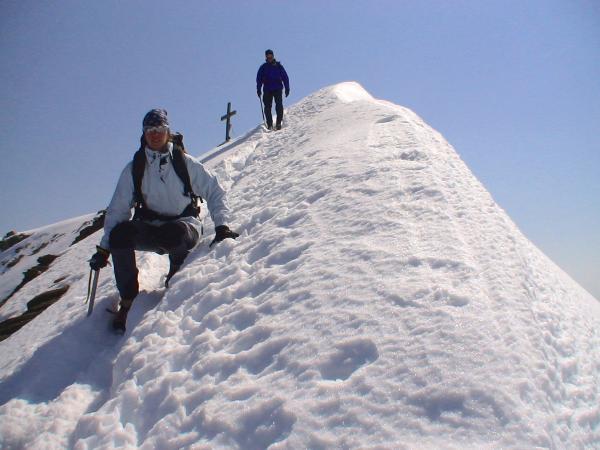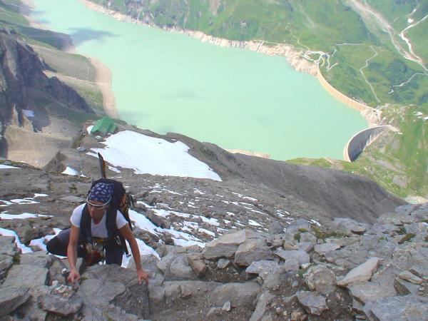 Diese eindrucksvolle Hochtourenwoche vom 17.-24. Juli 2005 werden wir wohl nie mehr vergessen. Wir sind kreuz und quer durch die Alpen gedüst und waren stets unter wolkenlosem Himmel unterwegs. Die Touren im Detail. So/Mo: Kaindlgrat-Grosses Wiesbachhorn 3564 m (Hohe Tauern). Di/Mi: Überschreitung der Dömes de Miage 3673 m (Mont Blanc Gruppe). Do/Fr: Castor 4228 m (Zentraler Walliser Grenzkamm). An allen Gipfeln herrschen derzeit fantastische Verhältnisse. Der Aufstieg vom Stausee Mooserboden zum Heinrich-Schwaiger-Haus gestaltet sich steil und mühsam über einen abweisenden Geröllhang. Dafür werden wir auf der Hütte mit einer herrlichen Aussicht belohnt. Während in den Westalpen bereits eine Front angekommen ist, geniessen wir am Montag im Osten noch strahlend schönes Wetter. Hinter der Hütte geht es bald in einem gesicherten Kaminle aufwärts und wir erreichen abschüssiges Gelände, das mit entsprechender Trittsicherheit zu begehen ist. Wir überschreiten den Unteren- und Oberen Fochezkopf, ehe der schönste Teil der Tour beginnt. Die elegant geschwungene Schneide des Kaindlgrates, die jetzt im Frühsommer, vollständig im Firn zum Gipfel zieht. Die Begehung ist ein Traum und erinnert an die grossen, berühmten Firngrate der Westalpen. Im oberen Teil wird der Grat einmal breiter und gleicht eher einer steilen Flanke, ehe wir wieder schmal und luftig das Gipfelkreuz erreichen. Das Wiesbachhorn findet Platz, in der Reihe grosser österreichischer Gipfelziele. Seine Ostflanke ist mit einer Wandhöhe von 2420 m, die höchste der gesamten Ostalpen.