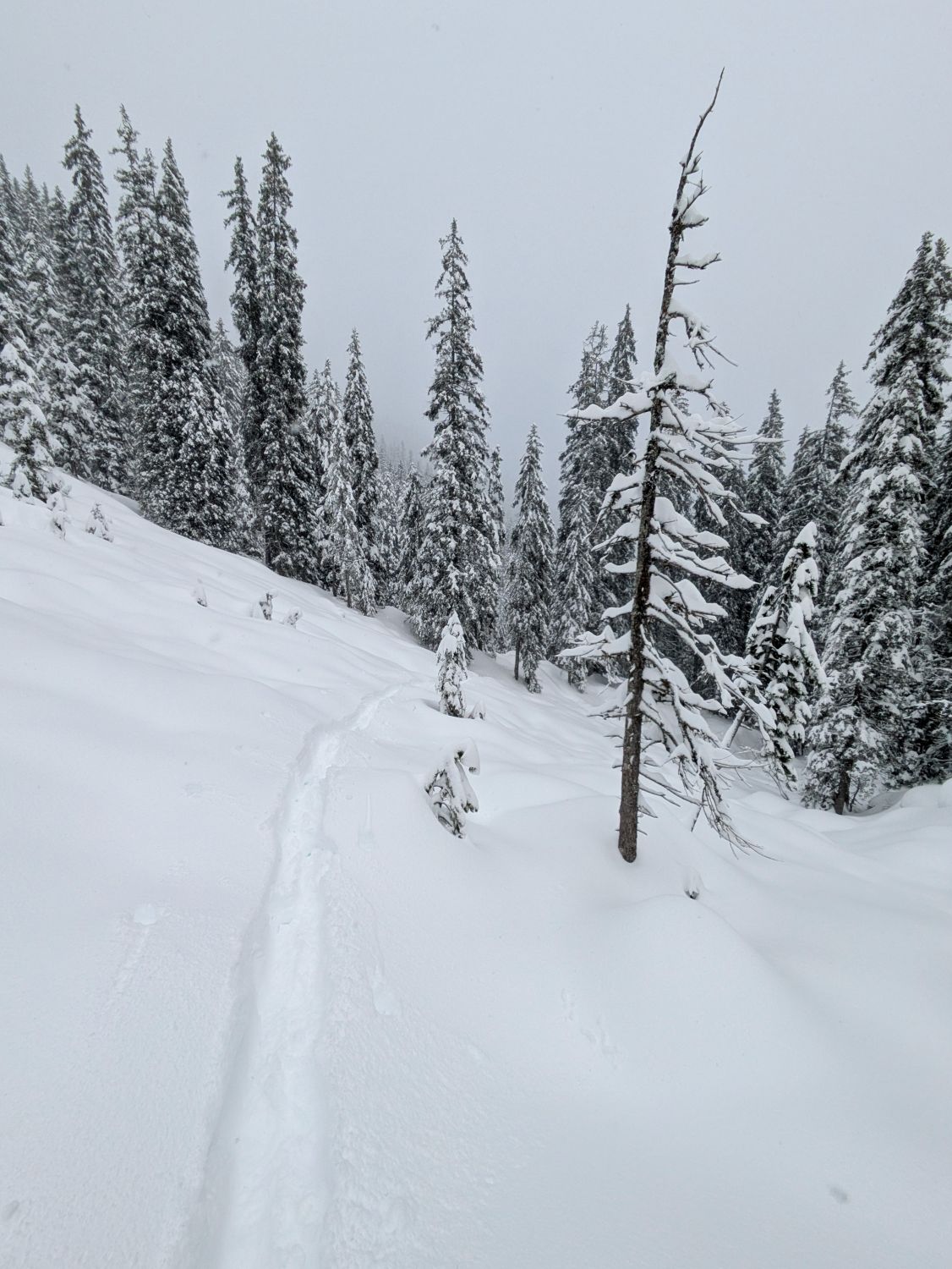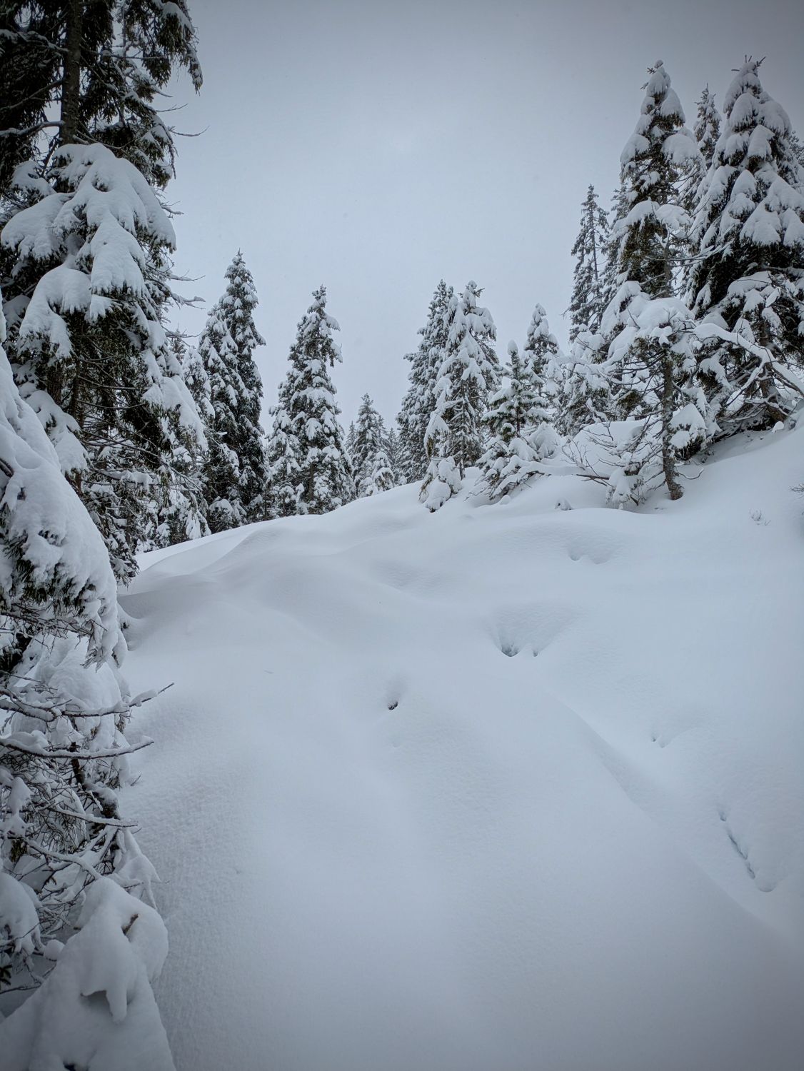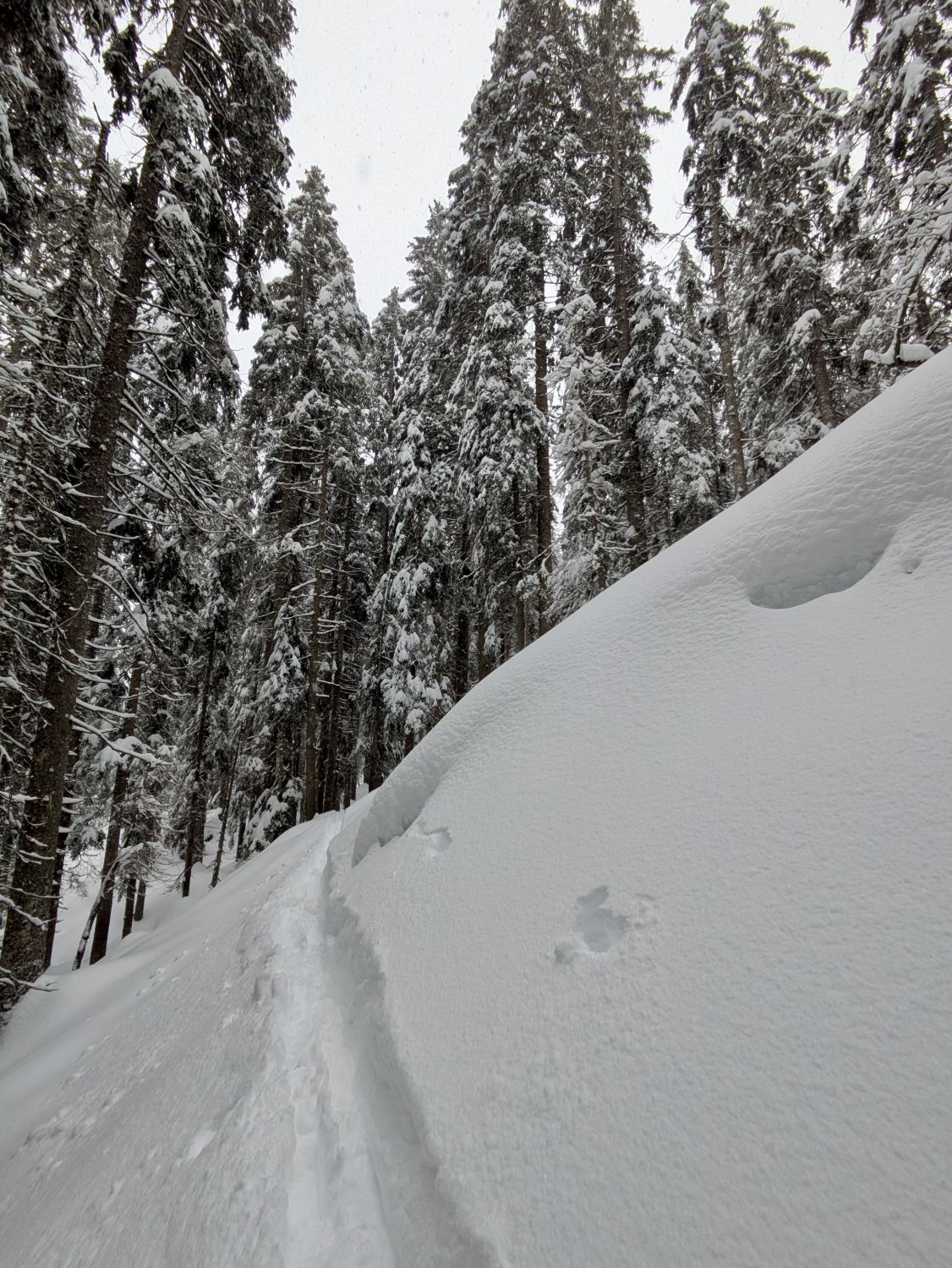 ab öV-Haltestelle "Kemmeribodenbad", Teerstrasse schwarz geräumt aber dank Schneefall mit Skifellen ok. Schneehöhe mit dem Anstieg schnell anwachsend, die kurze, steile Stelle im Wald auf ca. 1200m problemlos mit Ski. Danach im Steiniwald knapp knietiefer, lockerer Pulver = Schwerarbeit :-) Mit Wind und starkem Schneefall etwas Routensuche nötig, die Markierungen liegen weiter auseinander als die Sichtweite. Weiter oben dann etwas schwererer Schnee und ausserhalb des Waldes leicht windgepresst.