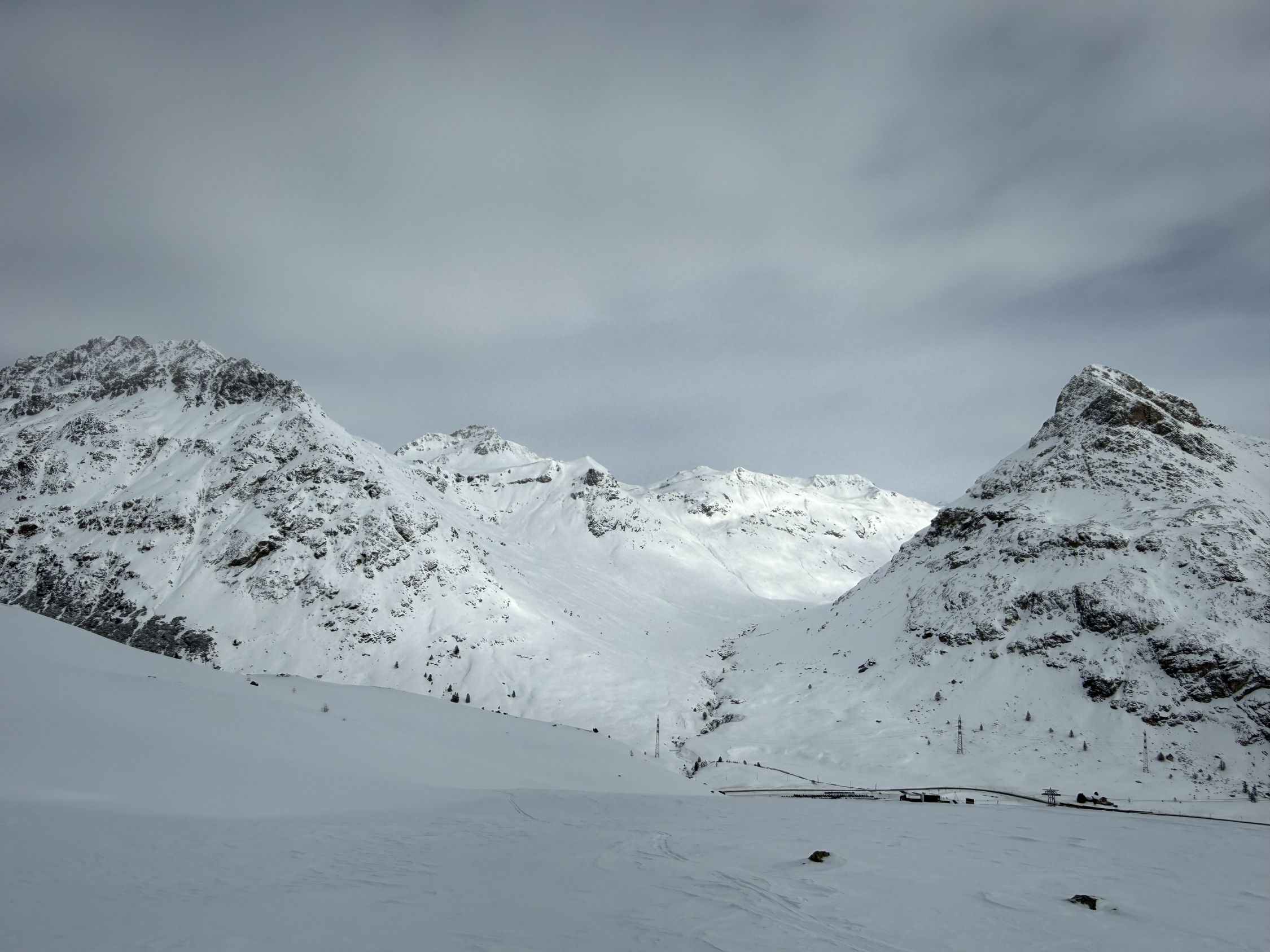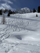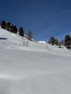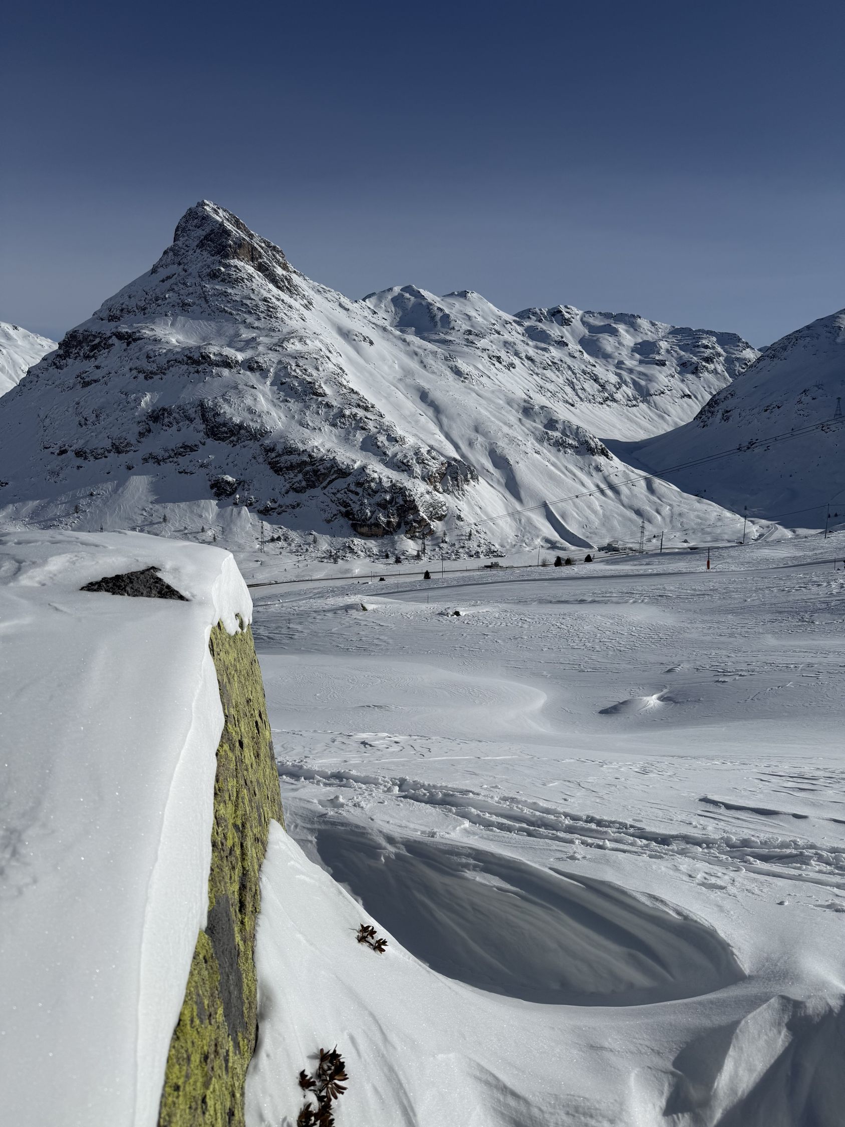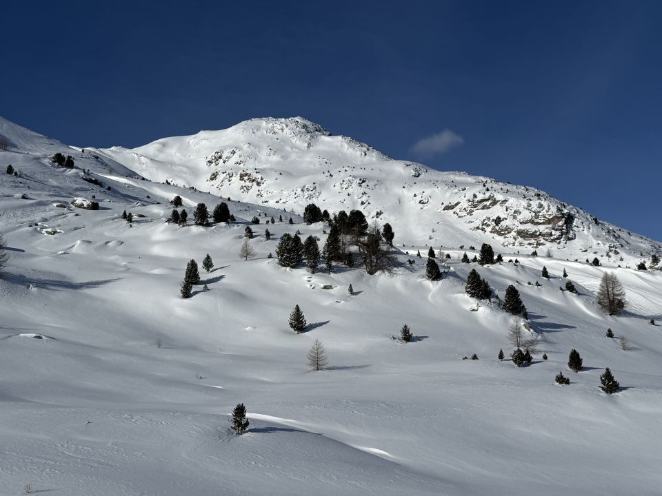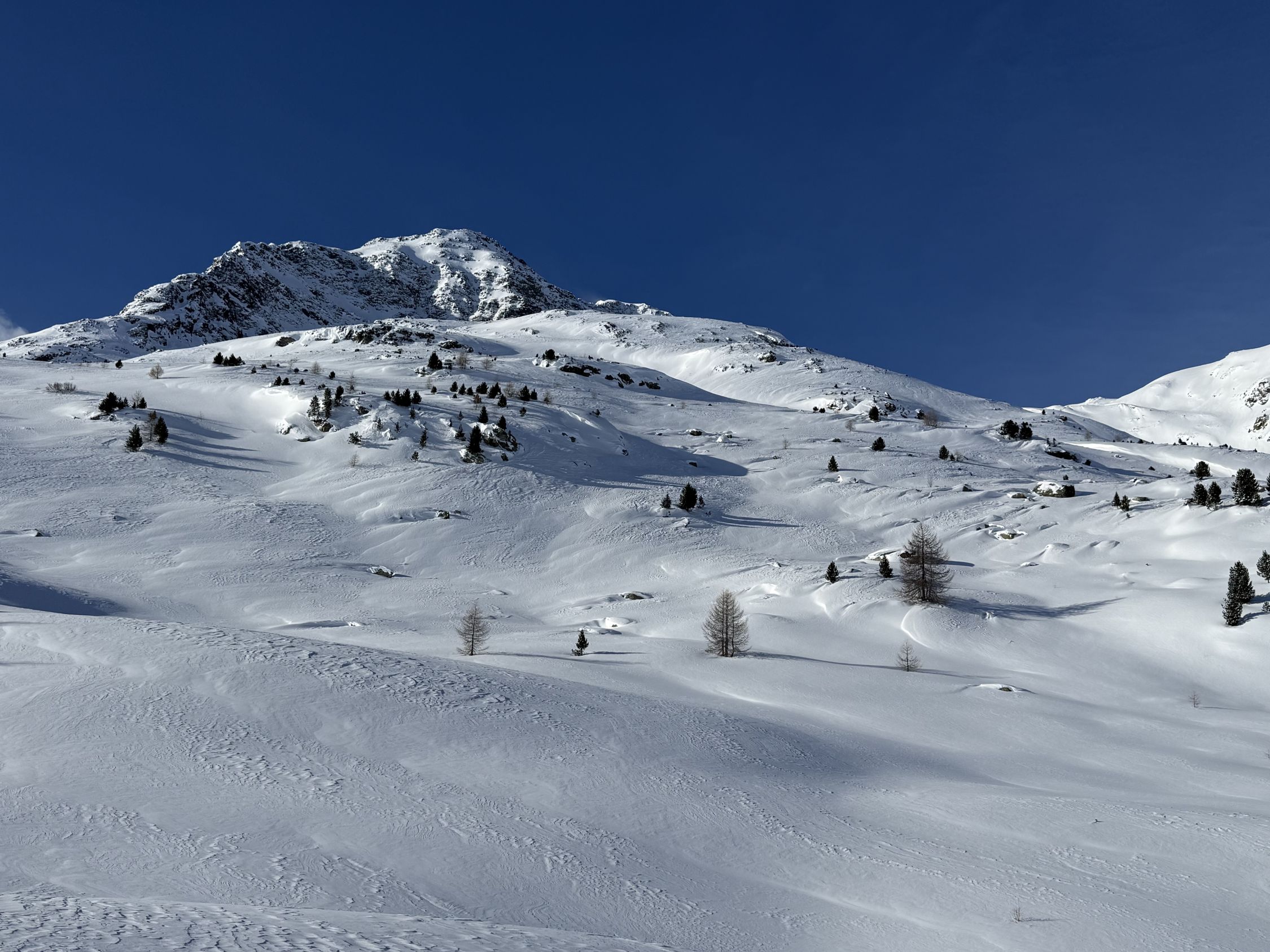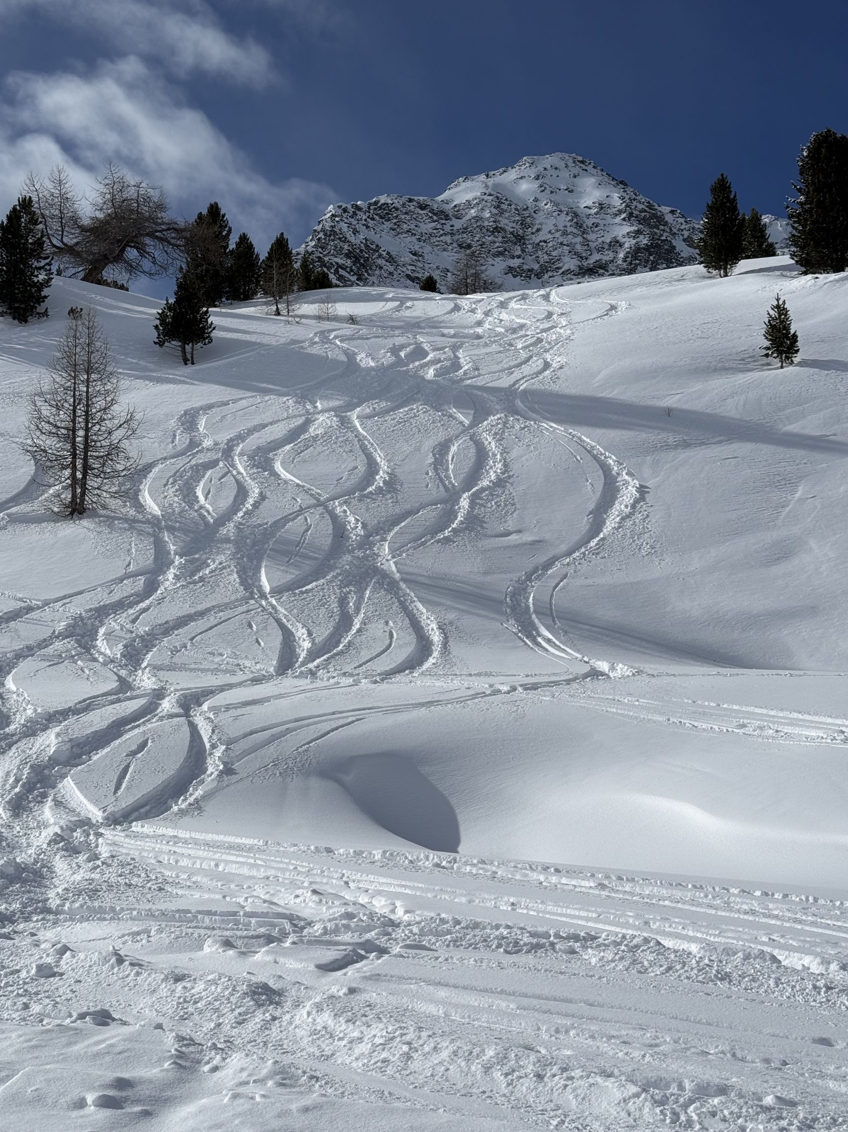 Schnee - und Skitest Nordostflanke Las Collinas abseits Pistengelände Diavolezza, WS-, ÖV Tour. Start Bernina Diavolezza RhB 8.30 Uhr, minus 10 Grad, windstill, wolkenlos. Habe im Neuschnee eine Spur gelegt abseits präparierter Piste zuerst westlich Richtung Wald und später in der Nordostflanke Las Collinas P. 2616. Im oberen Teil der Neuschnee teilweise vom Wind bearbeitet. Bin dann noch bis Höhe 2475 m, die Sicht wurde etwas schlechter und bei SLF „gross“ ist Vorsicht geboten. Abfahrt auch im Neuschnee, im oben Teil etwas Windeinfluss, unten schöner Pulverschnee.