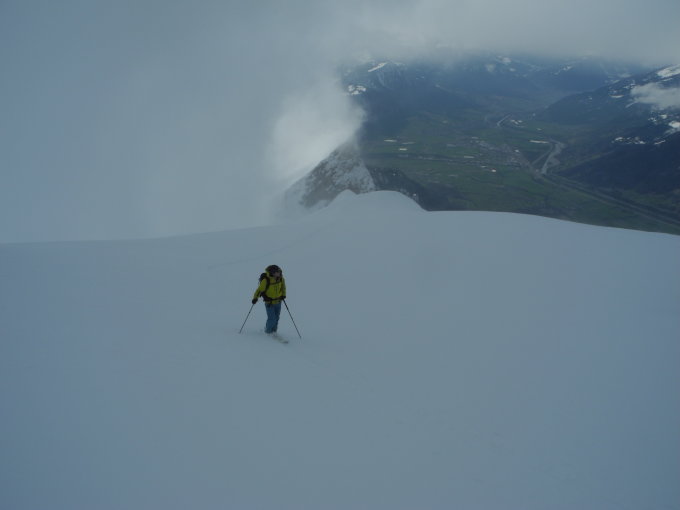 Ski getragen bis 1300m. Sehr viel Schnee im Gebiet, der bis weit hinauf durchfeuchtet ist. Stark wechselhaftes z.T. stürmisches Föhn-Wetter. Trotz "erheblich" bei richtiger Routenwahl gut machbar.