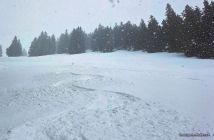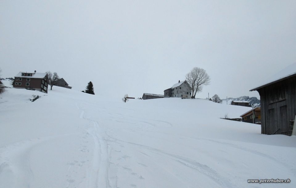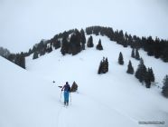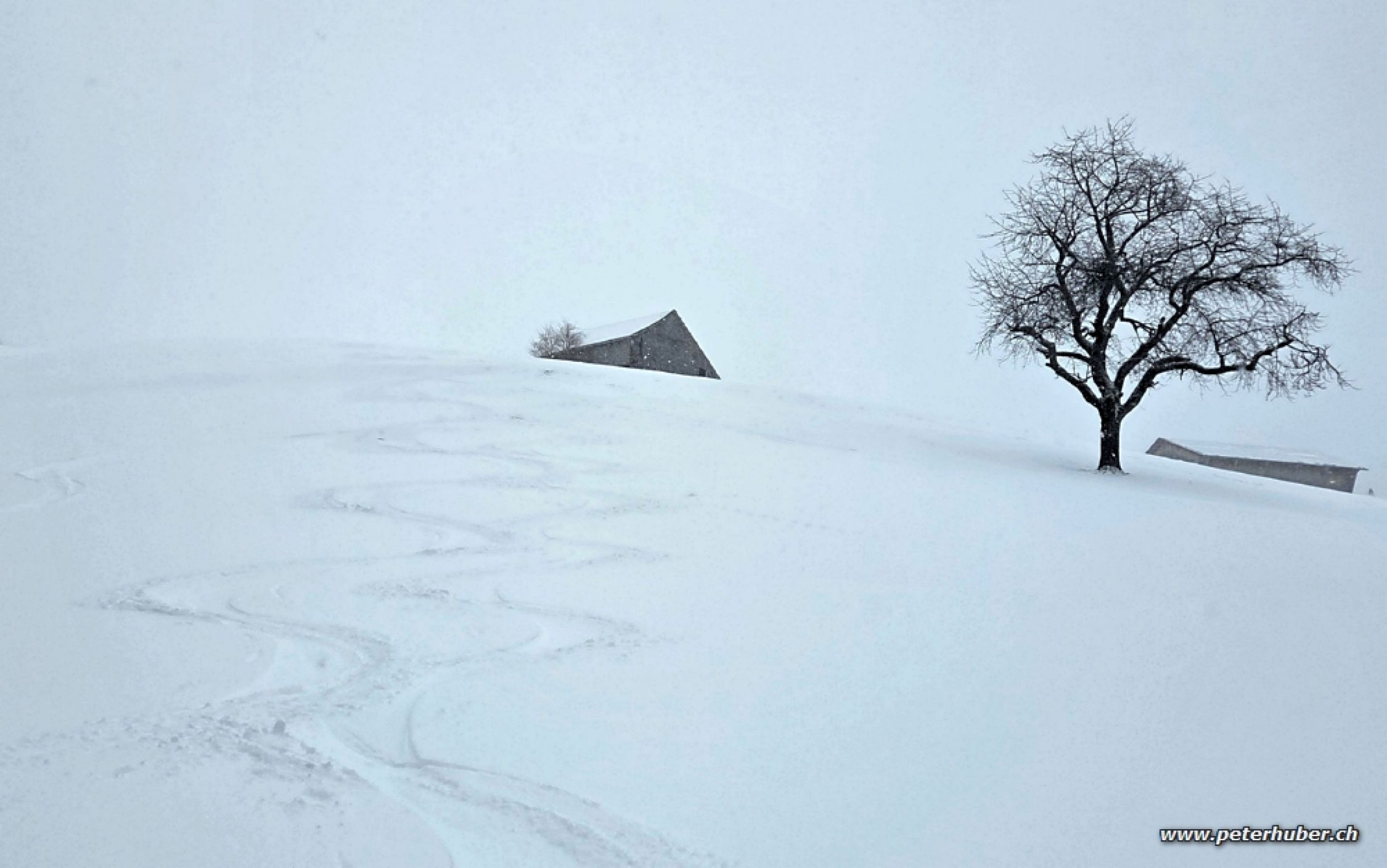 Es hat ab dem Parkplatz durchgehend Schnee. Unten zirka 3 cm Neuschnee auf gut gesetzter Unterlage. Wenige Kuppen sind abgeblasen und nur knapp mit Schnee bedeckt. Ab der Mitte zirka 10 cm Neuschnee auf lockerer Pulverschneeunterlage. Zu oberst im Gipfelhang hörten wir ein kräftiges Wummgeräusch.