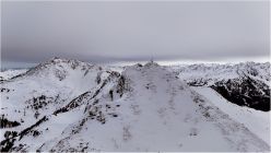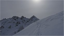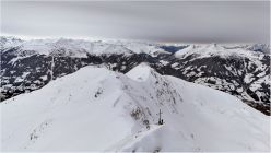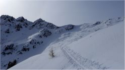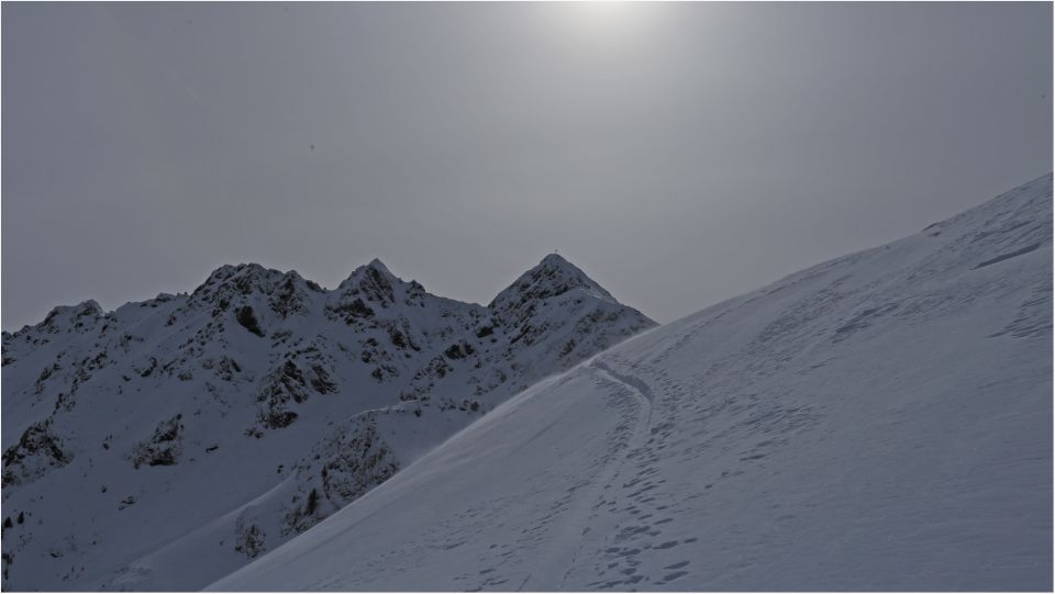 Ab dort dann unterschiedlich tief zu spuren, direkt am Grat nur wenig Neuschnee, deshalb die letzten 20 HM zu Fuß.