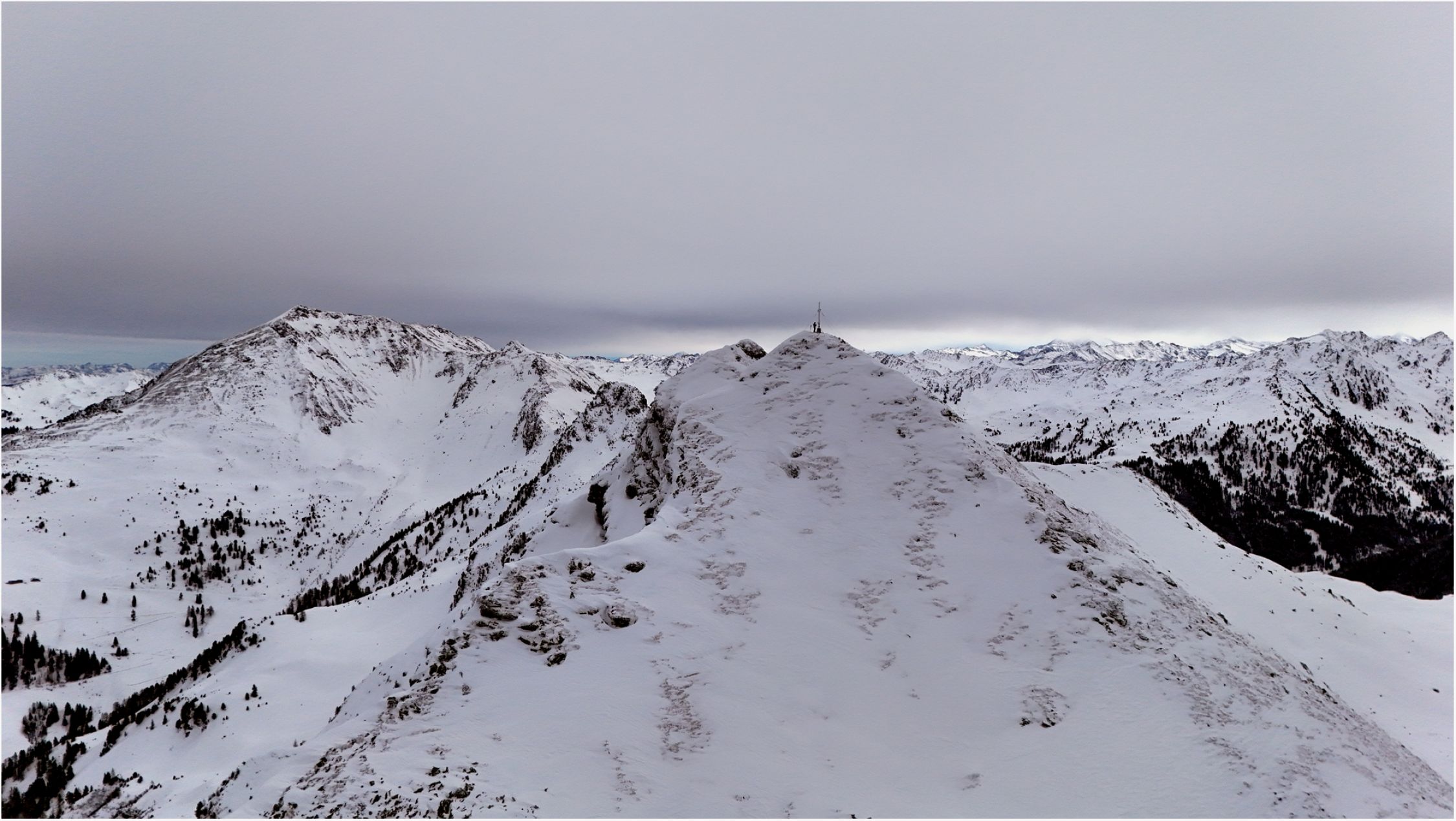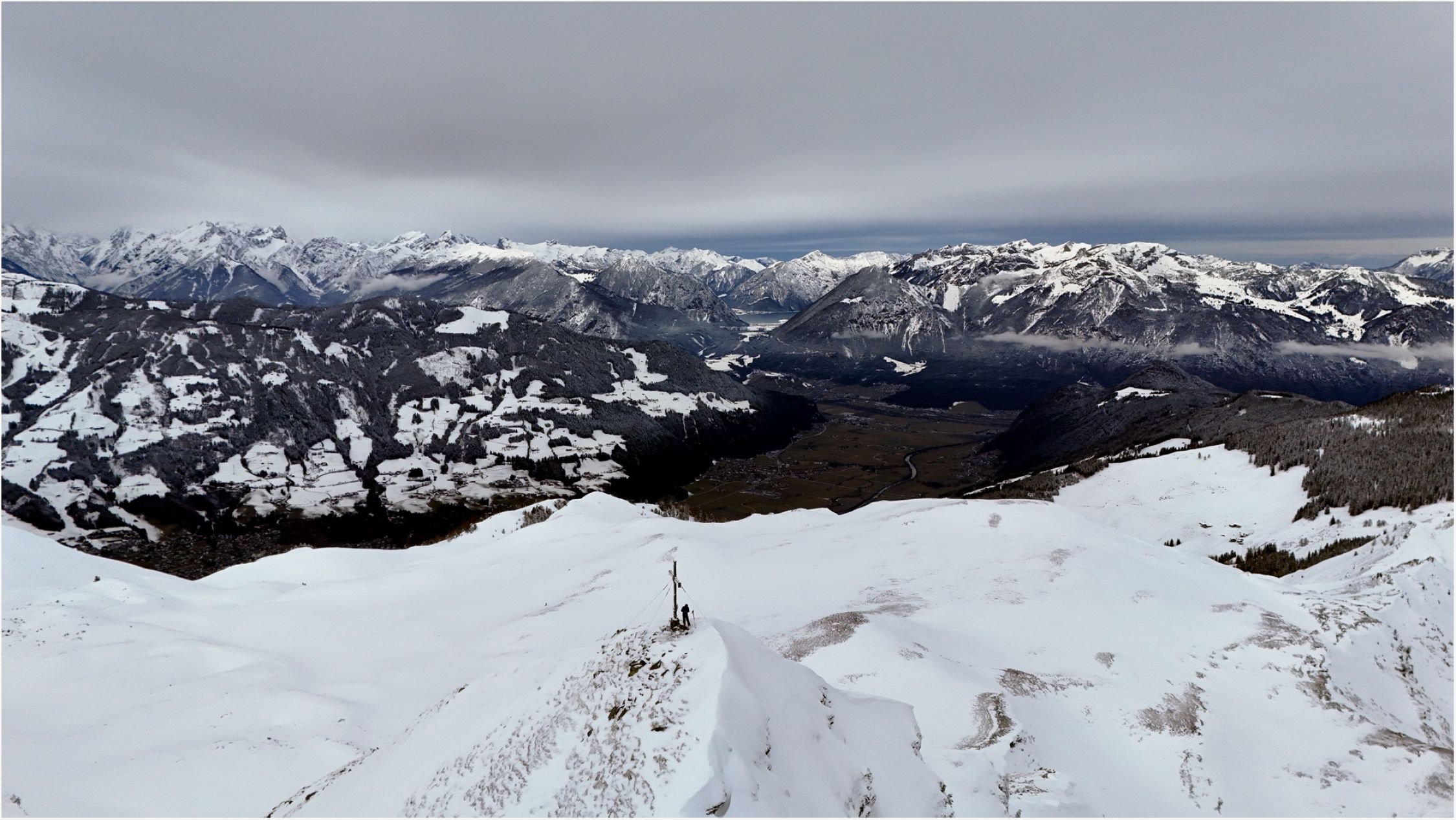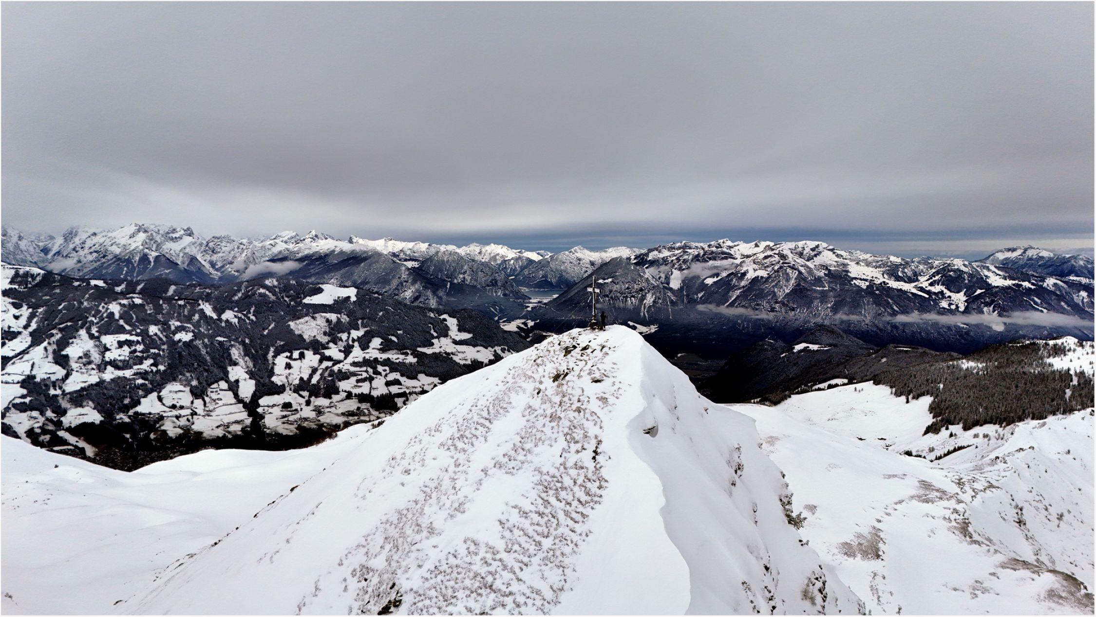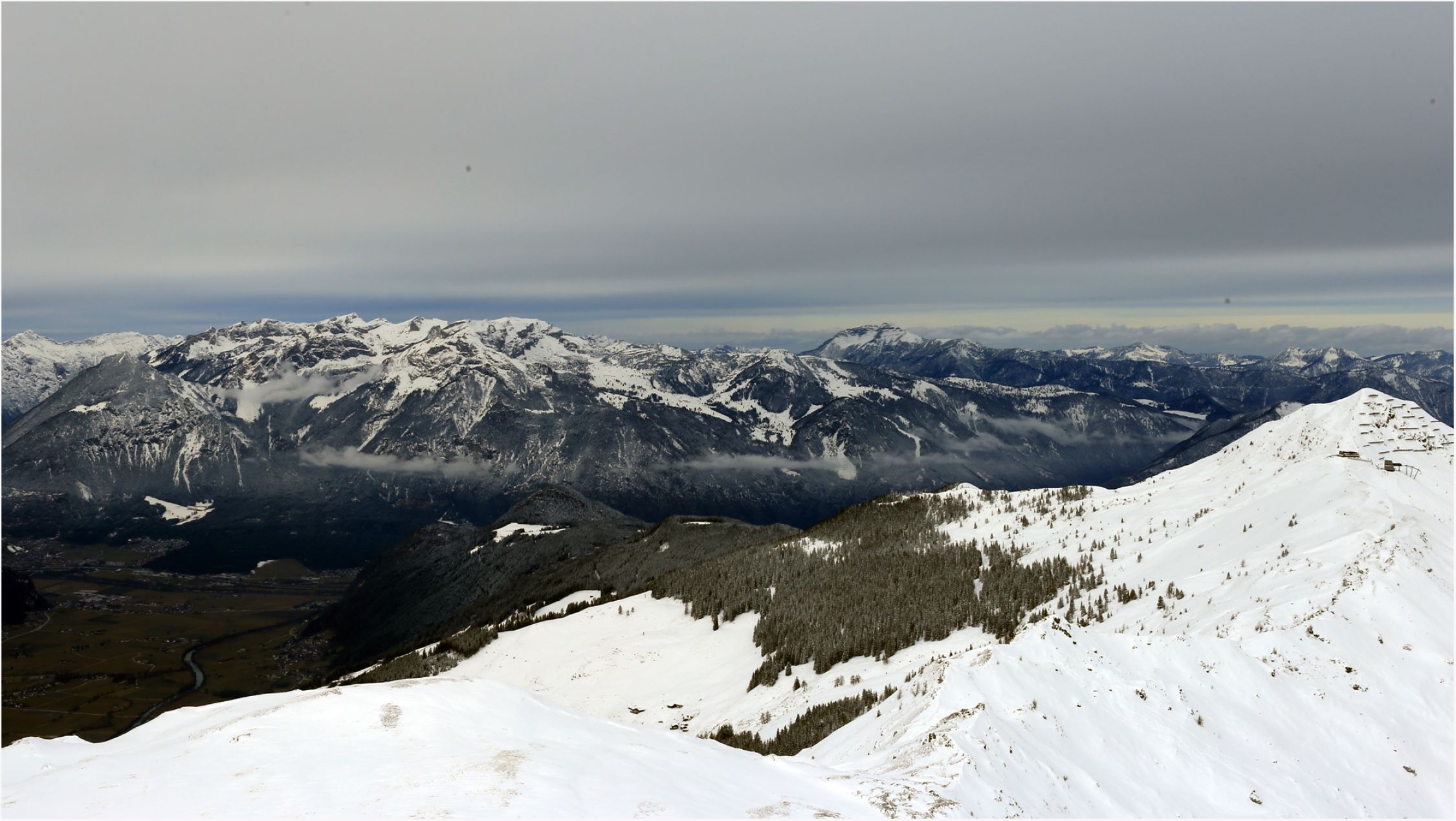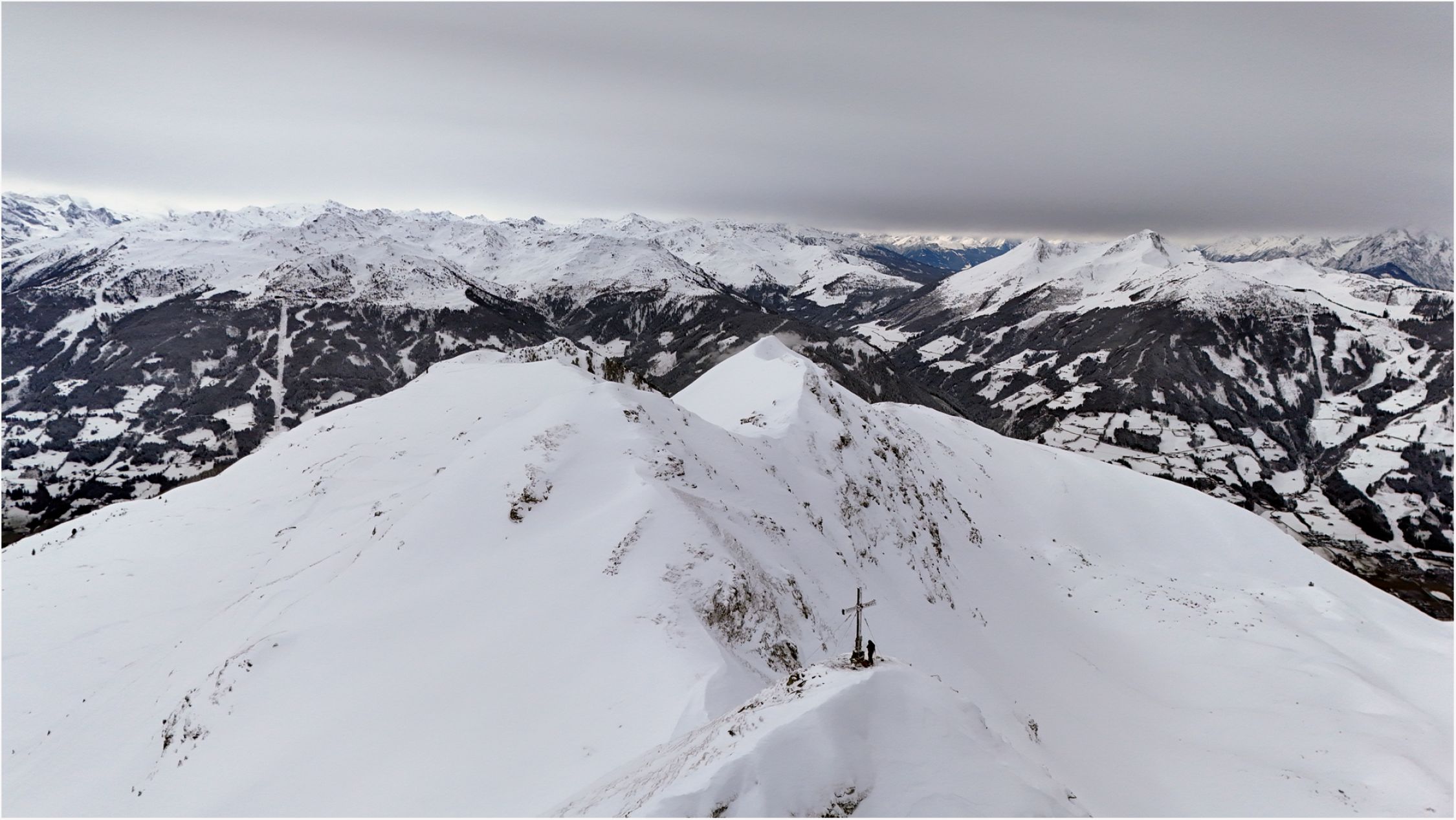 Blick in die Runde: Der Neuschnee täuscht, die Gesamtschneemenge dürfte weiterhin weit unter dem Durchschnitt liegen. Galtenberg stark abgeweht.