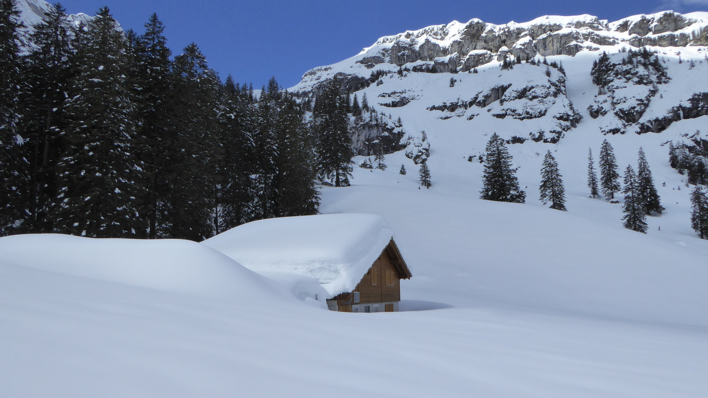 Ab Brunni-Beizli dann alles der top eingeschneiten Strasse hinunter nach Bielen, jedoch von Beginn weg schwerer, bremsender Nassschnee - da durfte auch abwärts gestöckelt werden :-)