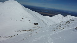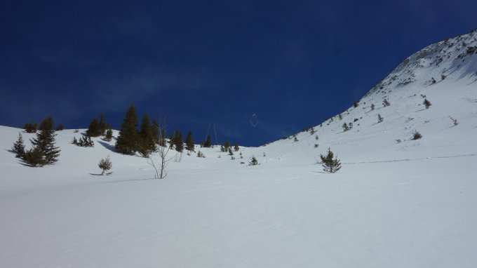 Verhältnisse in der Abfahrt: Vom Gipfel den Schnee suchend im Westhang-kein Steinkontakt, die flacheren Hänge vom Sattel Firn, weiter unten nasser Pulver, Sulz. Mehrmals abschnallen am Wanderweg.