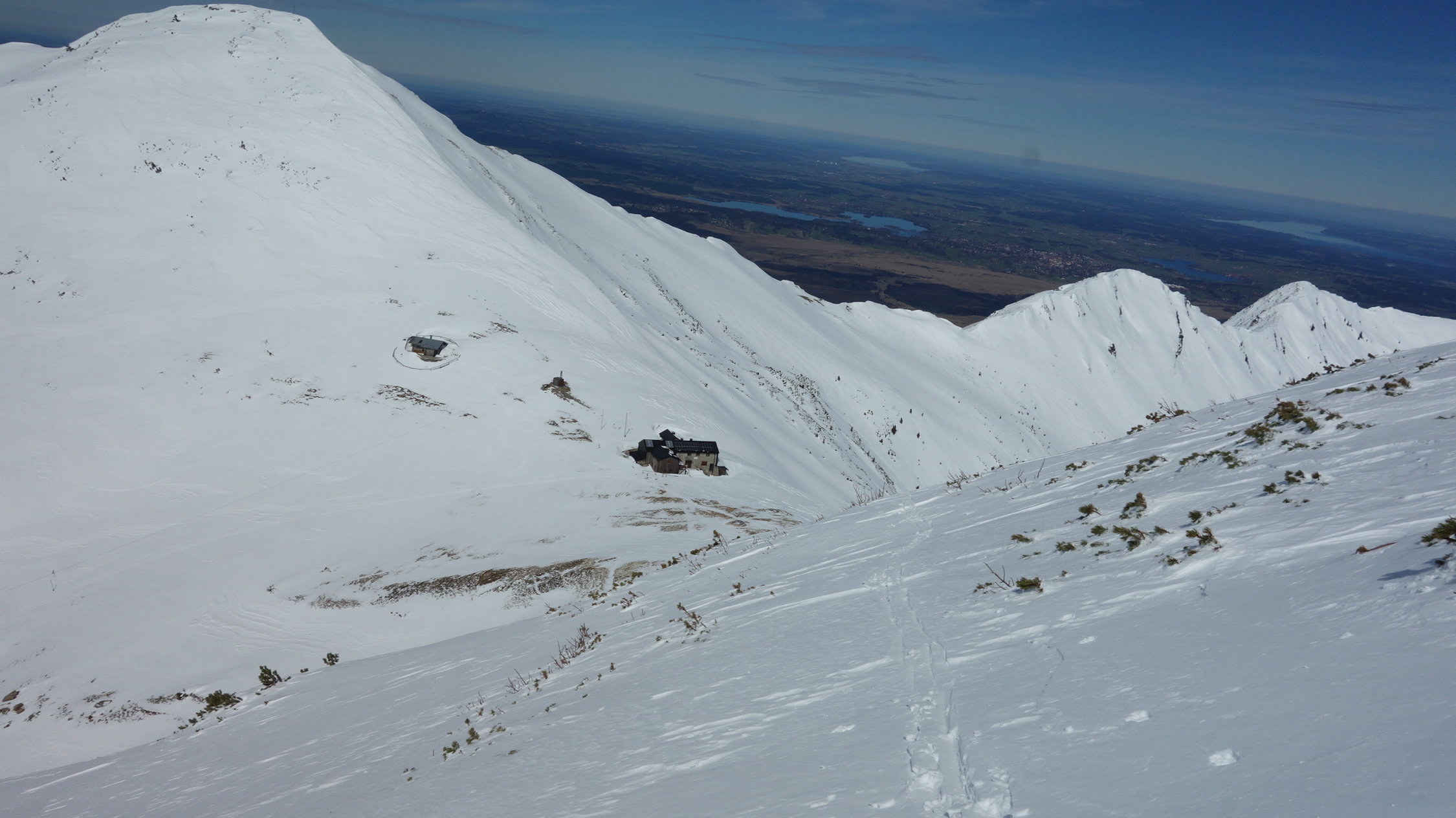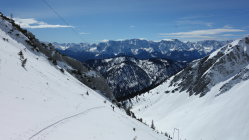 Abfahrt vom Wank morgens mit ein paar cm pulvrigem Neuschnee. Aufstieg Richtung Weilheimer Hütte war dann heute noch durchgehend mit Ski möglich -abgesehen von ein/zwei kleineren Bächen. Auf gut angelegter Spur in Sattel zur Weilheimer hÜtte. Bin dann mit Harscheisen am Ski noch zum Gipfel (etwas in den steilen Westhang ausweichend).