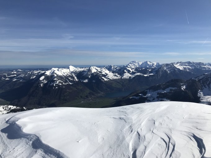 Beim Tritt stark eingesunken, dann weiter bis zum Sattel auf ca. 20cm gepresstem Pulverschnee. Vom Sattel bis zum Gipfel ist der Grat stark abgeblasen. Grandiose Aussicht, war warm und windig.