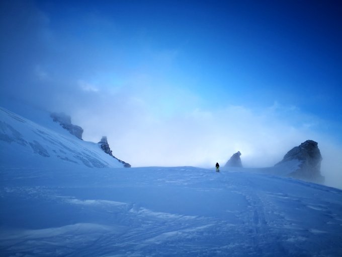 Der Hüttenzustieg ist etwas heikel da der Schnee an manchen Stellen Bock Hart ist (mit Harscheisen aber relativ gut machbar) Der Gletscher ist an vielen Stellen komplett Blank. Teilweise nur mit Steigeisen machbar und Ski auf den Rücken. Die letzten Meter am Grat zur Madonna sind relativ gut machbar, teilweise aber etwas ausgesetzt.
