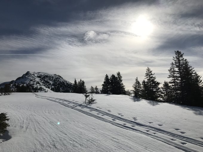 Frühmorgens noch sehr gute Verhältnisse. Ein kleines Stück durch den Wald müssen die Skier getragen werden. Anschliessend schöne Aussicht und ein angenehmer Aufstieg.
