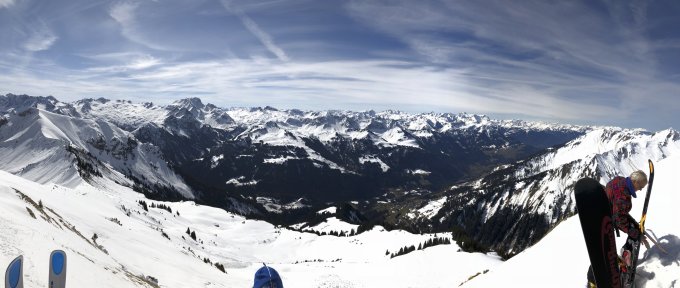 feiner Firnschnee am Gipfelhang, der von sehr vielen Grundlawinen durchsetzt ist. Breite Fischmäuler gebieten Vorsicht beim Abfahren.