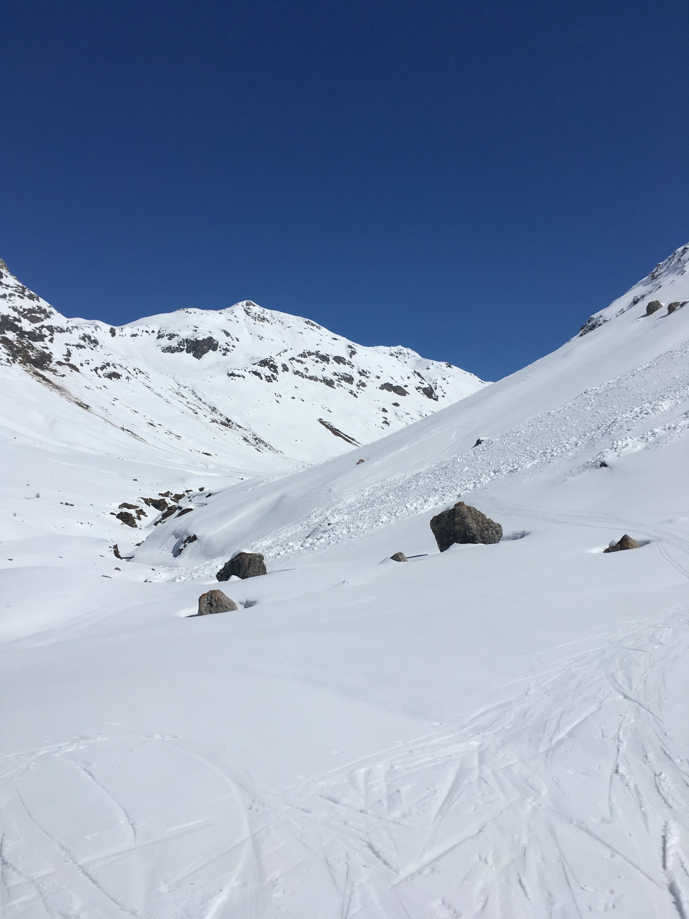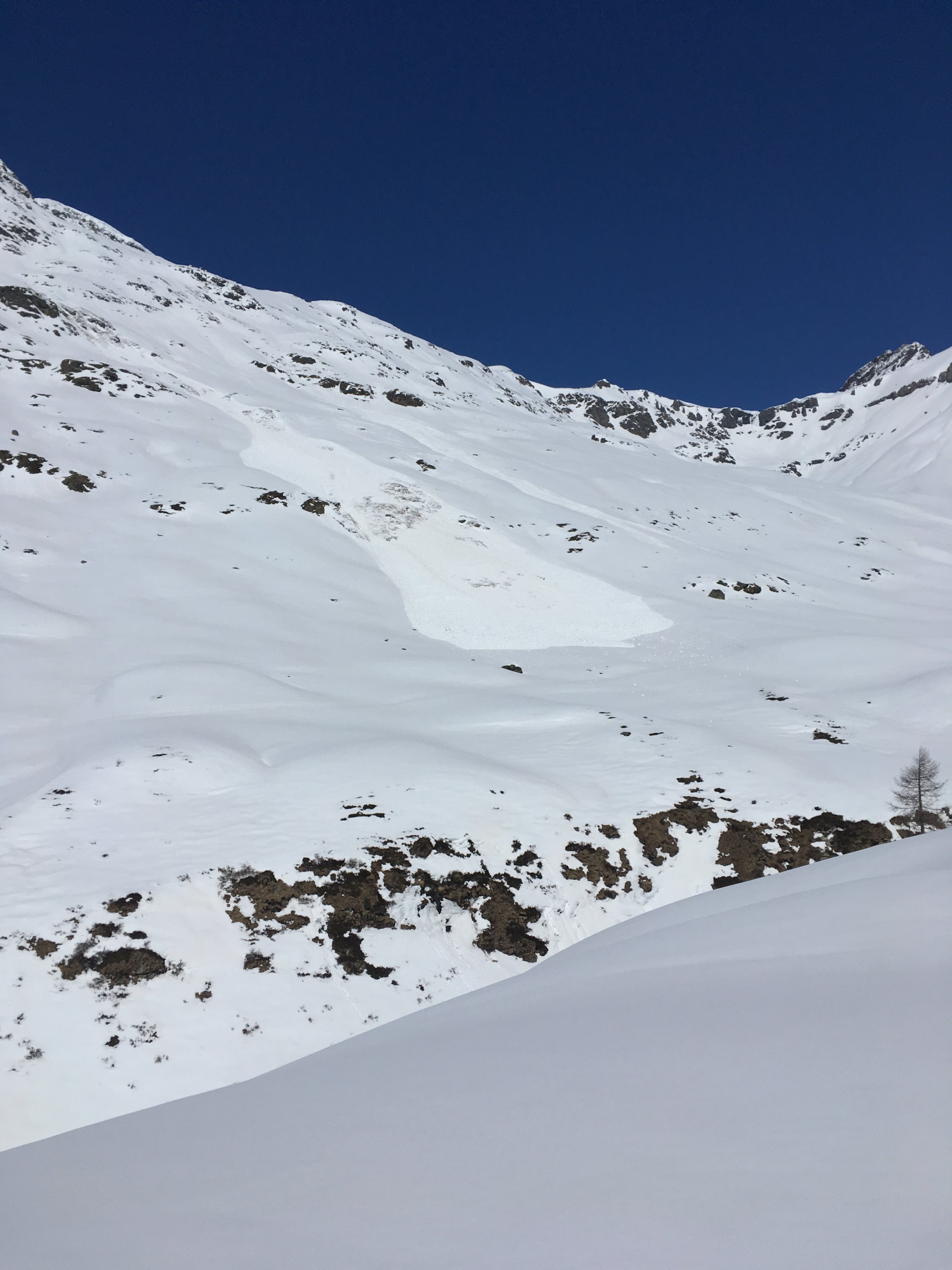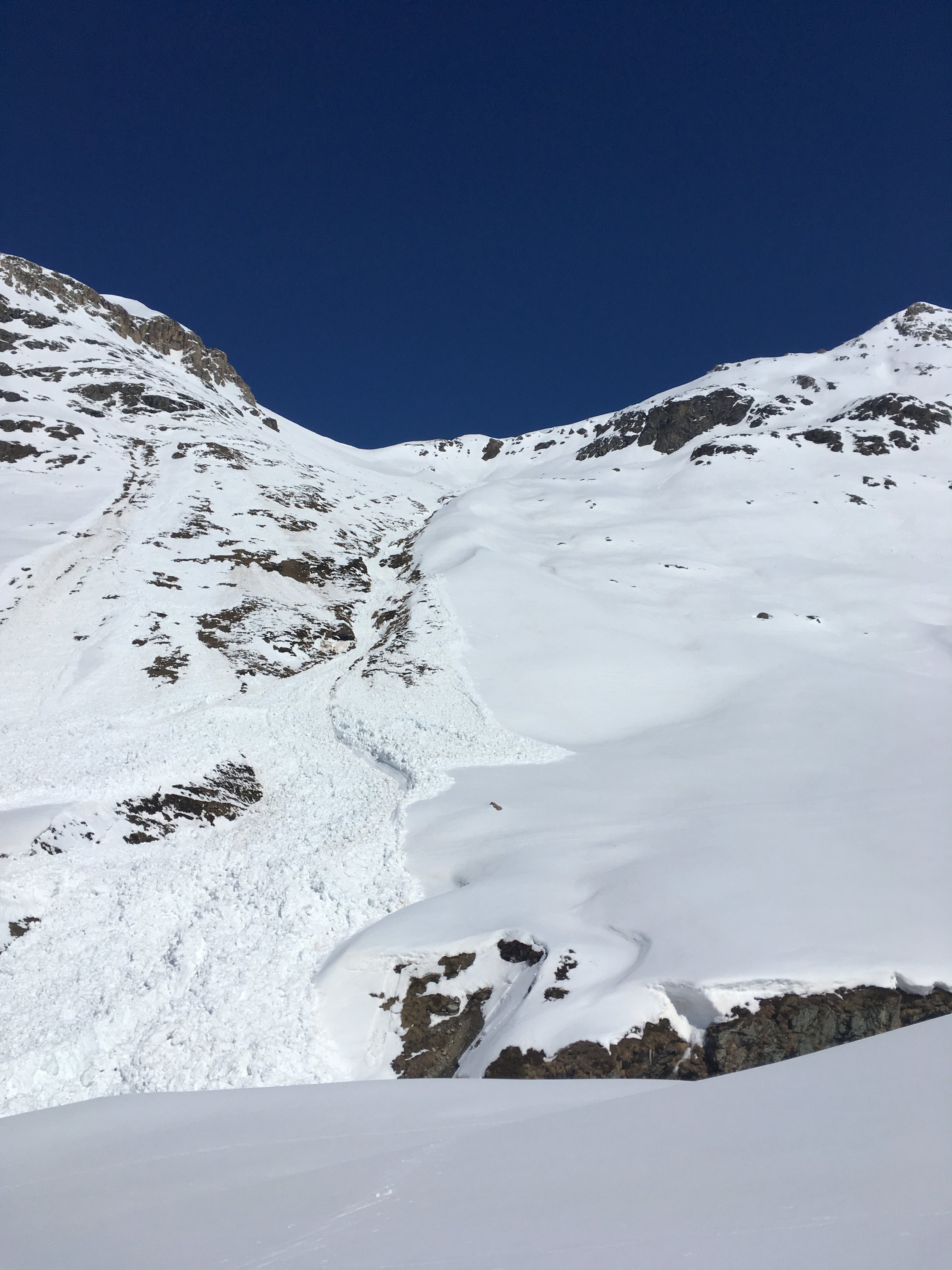 Grössere Lawine Valetta d Albris um 11.30 Uhr fast bis Aufstiegsroute rechte Talseite.