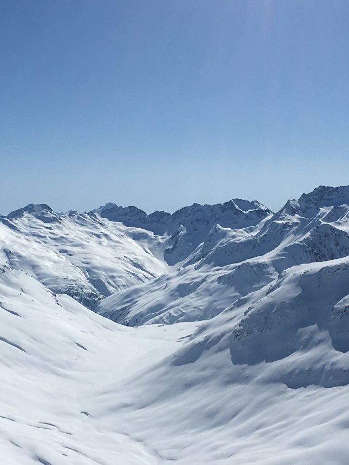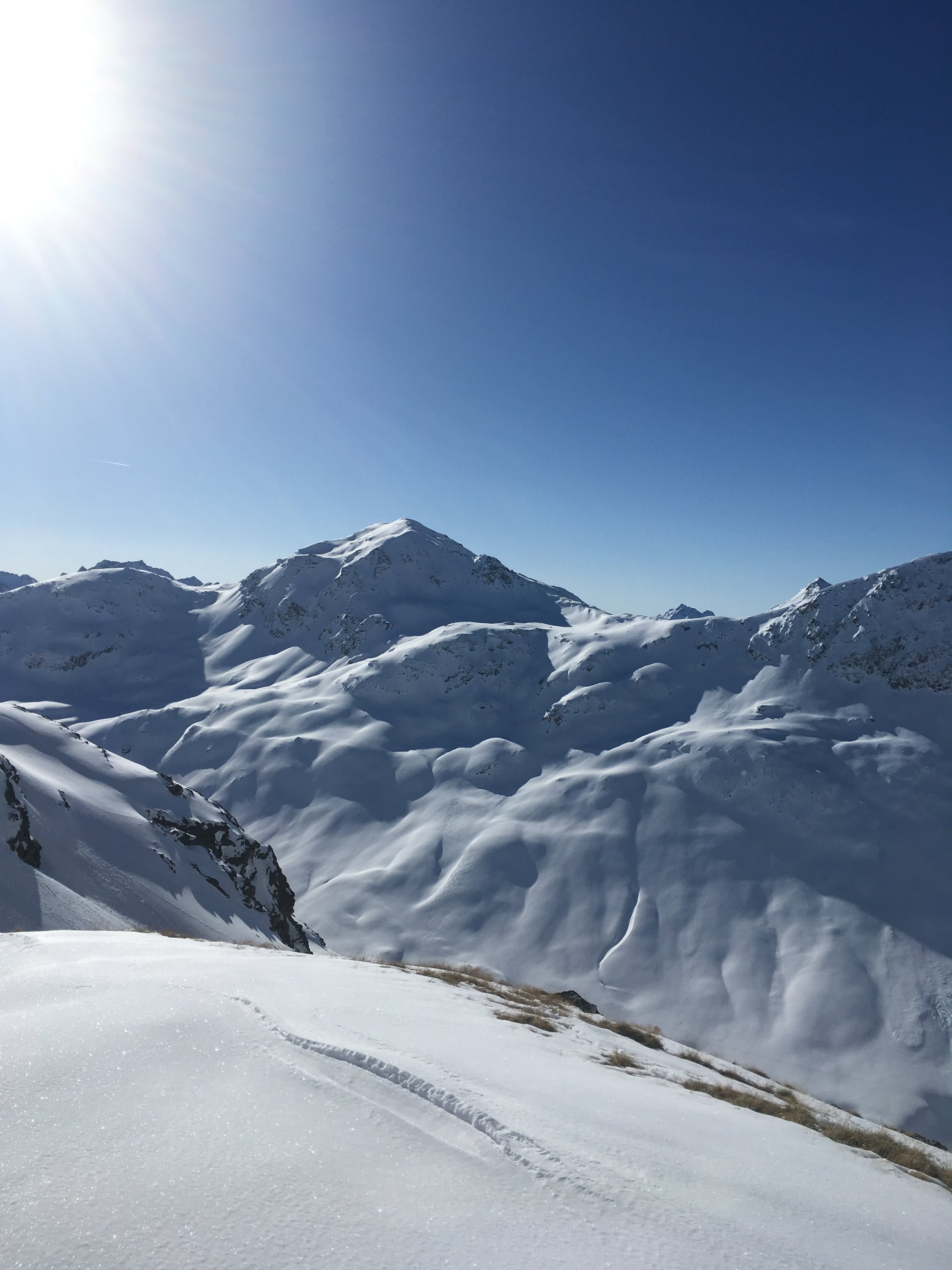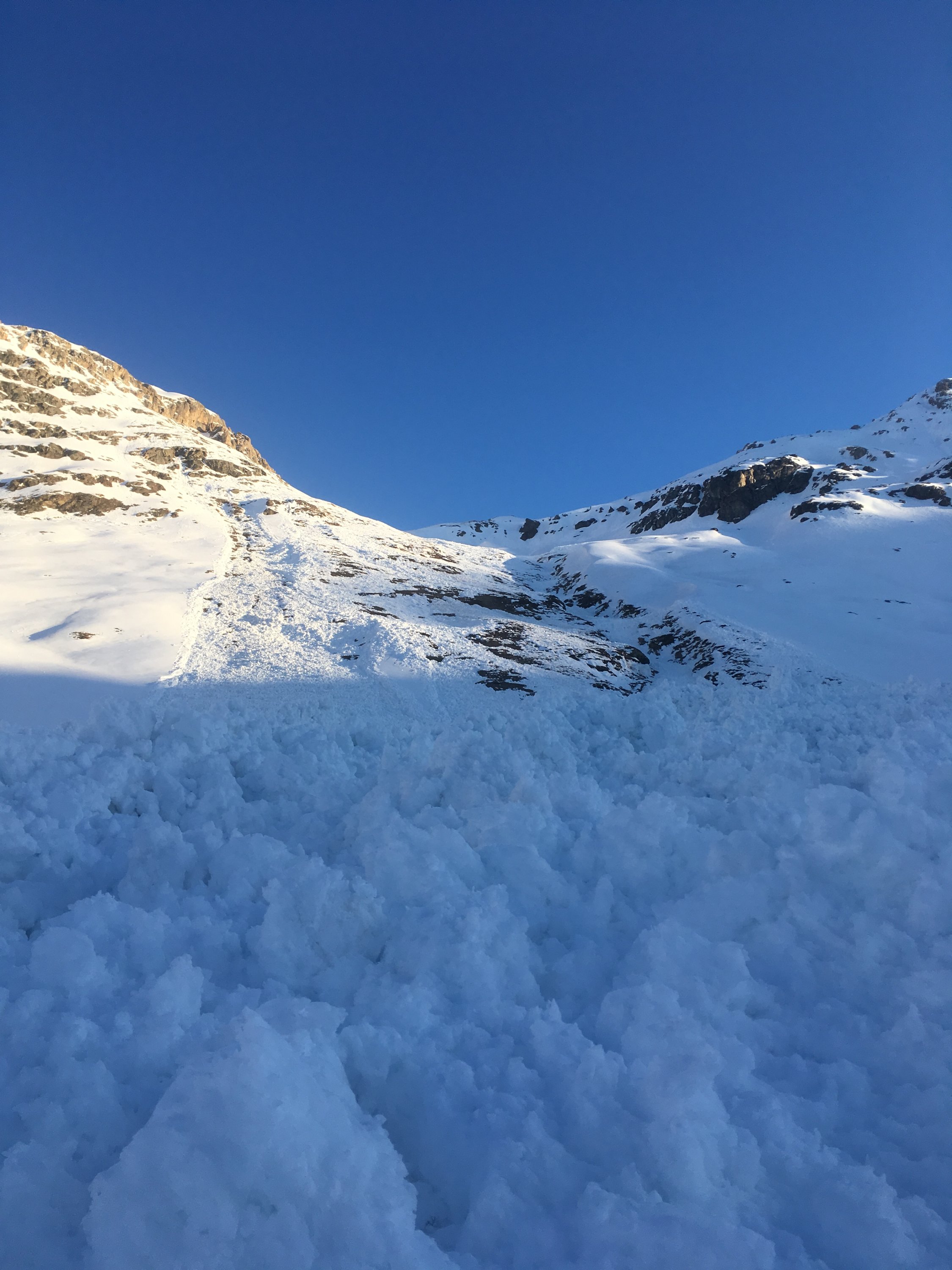 Grössere Lawine Valetta d Albris um 11.30 Uhr fast bis Aufstiegsroute rechte Talseite.
