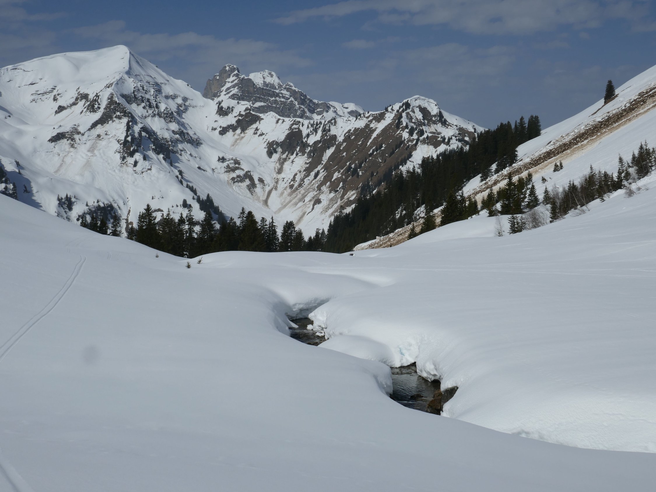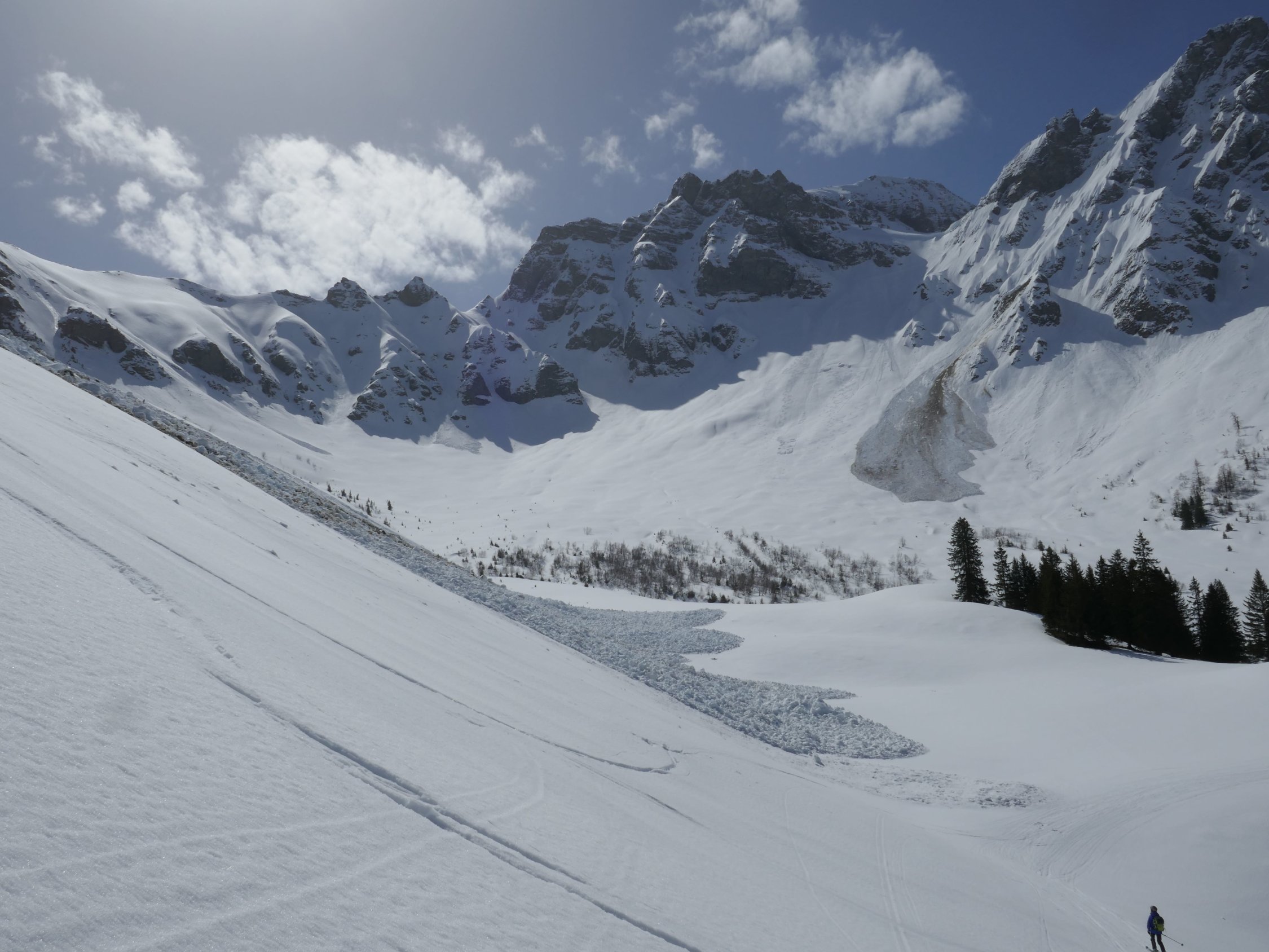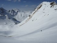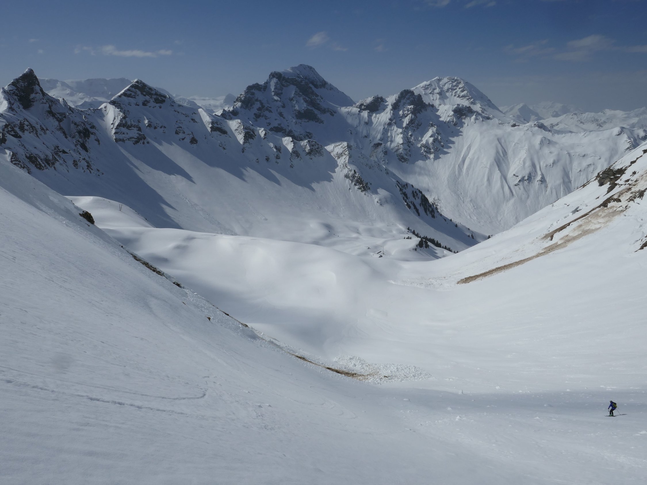 Frühlingsverhältnisse, Abfahrt vor 11 Uhr optimal, Sulzschnee, im Mittelteil noch dünne Kruste, mehrheitlich aber sehr gute tragende Schneedecke.