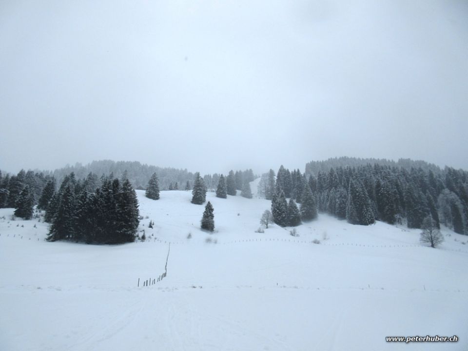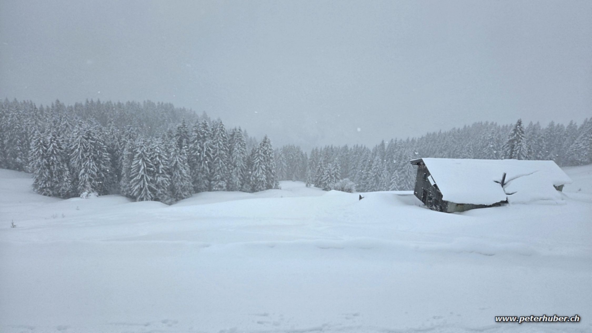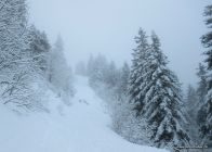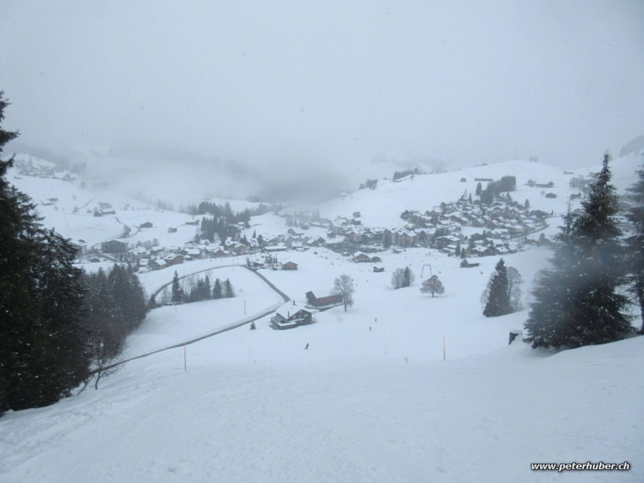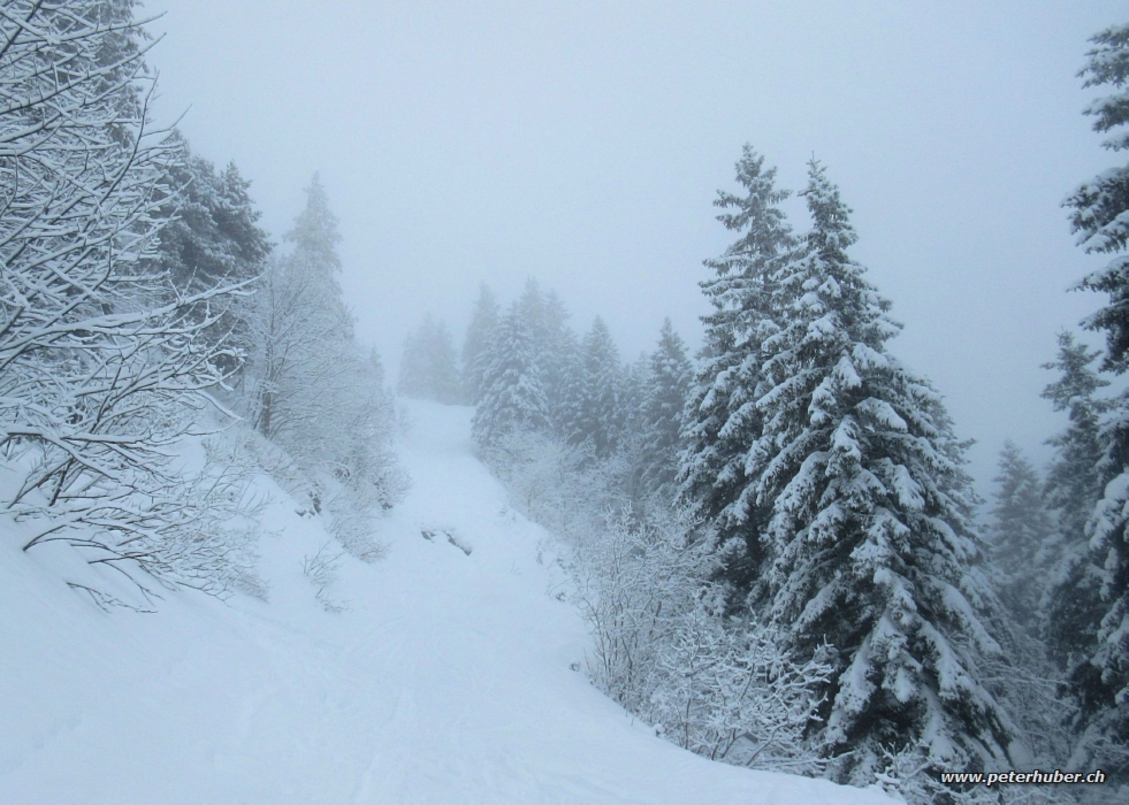 Bedeckt und anhaltender Schneefall. Temperatur unten beim Start 0°C. Unten schon fast Regen. Unten hat es zirka 3 cm sehr feuchten Neuschnee auf guter Unterlage. Ab der Mitte zirka 15 cm Neuschnee auf pulveriger Unterlage, aber auch noch feucht.