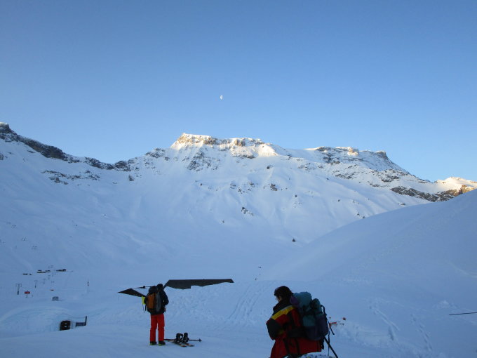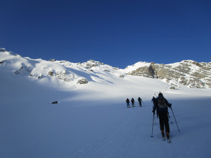 Am Morgen beim Start schon recht warm, jedoch der Schnee bis zuhinterst der Ebene hart, dann an der Sonne anfangs etwas Firn, später schwerer Pulverschnee. Problemlos ohne Harscheisen machbar.