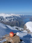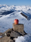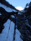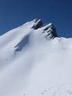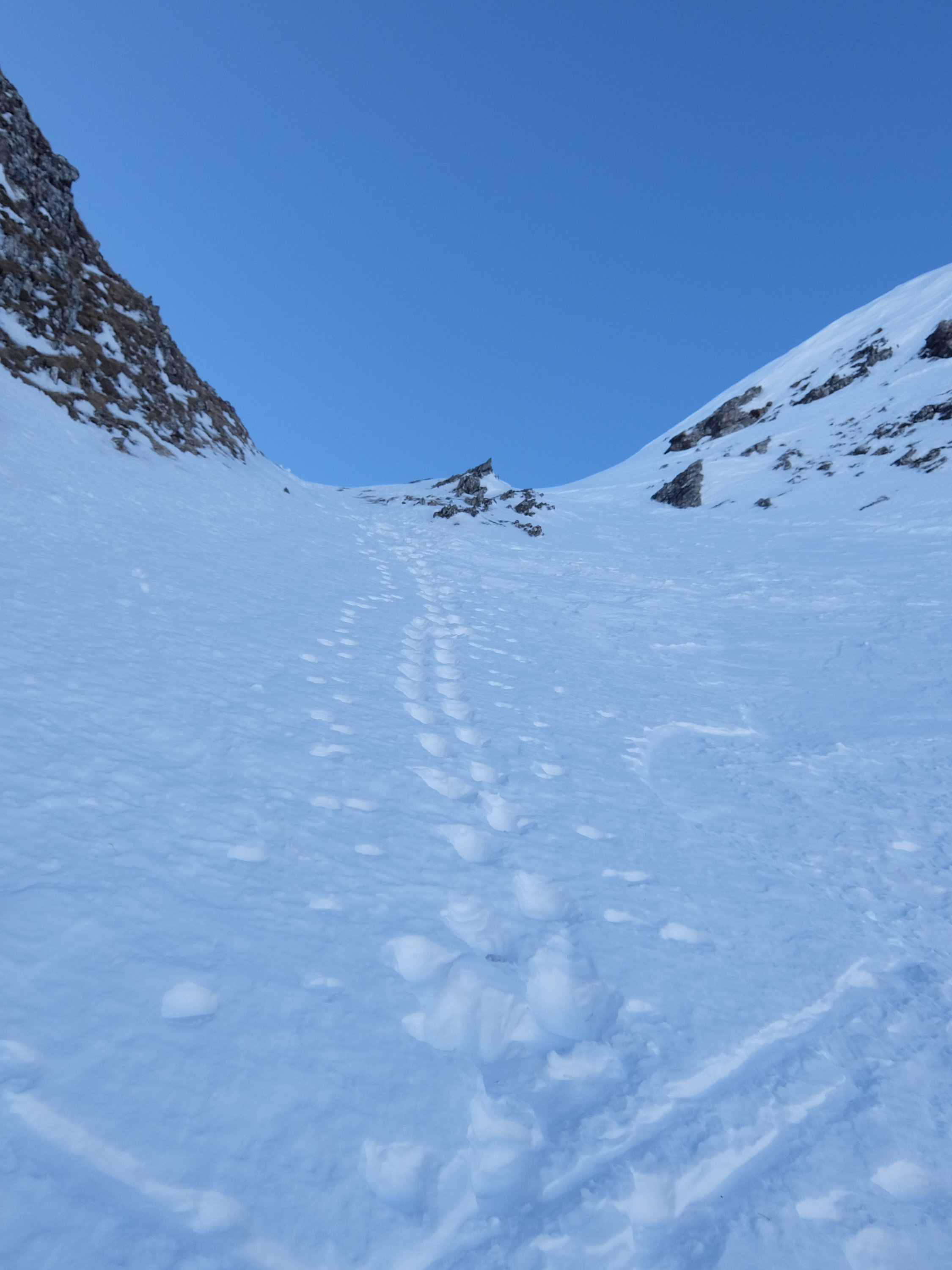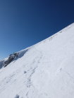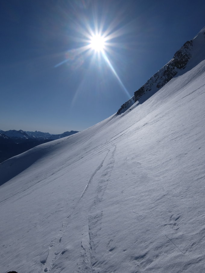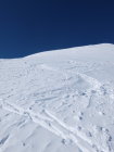Ich bin kein Harscheisen-Fan, ich gehe oft lang ohne und steige dann ev. auf Steigeisen um. Heute hatte es aber nahezu perfekte Harscheisen-Verhältnisse und ich entschied mich auf ca. 1850 m diese zu montieren. An einer sehr flachen Stelle legte ich sie etwas ungeschickt auf den Schnee und das eine fing, langsam aber sicher, an zu rutschen. Beim Versuch dieses aufzuhalten kam das zweite ebenfalls in Bewegung... in einem Sekundenbruchteil entschied ich mich gegen einen improvisierten Rettungsversuch und sah nur zu als sie in der plötzlichen Windstille an Fahrt nahmen. Das erste fand ca. 50 Hm weiter unten in einer Geländemulde seinen Platz, das zweite verschwand hinter einer Kuppe. Die Abfahrtsroute stand somit fest, wobei ich nur das erste wieder finden konnte...