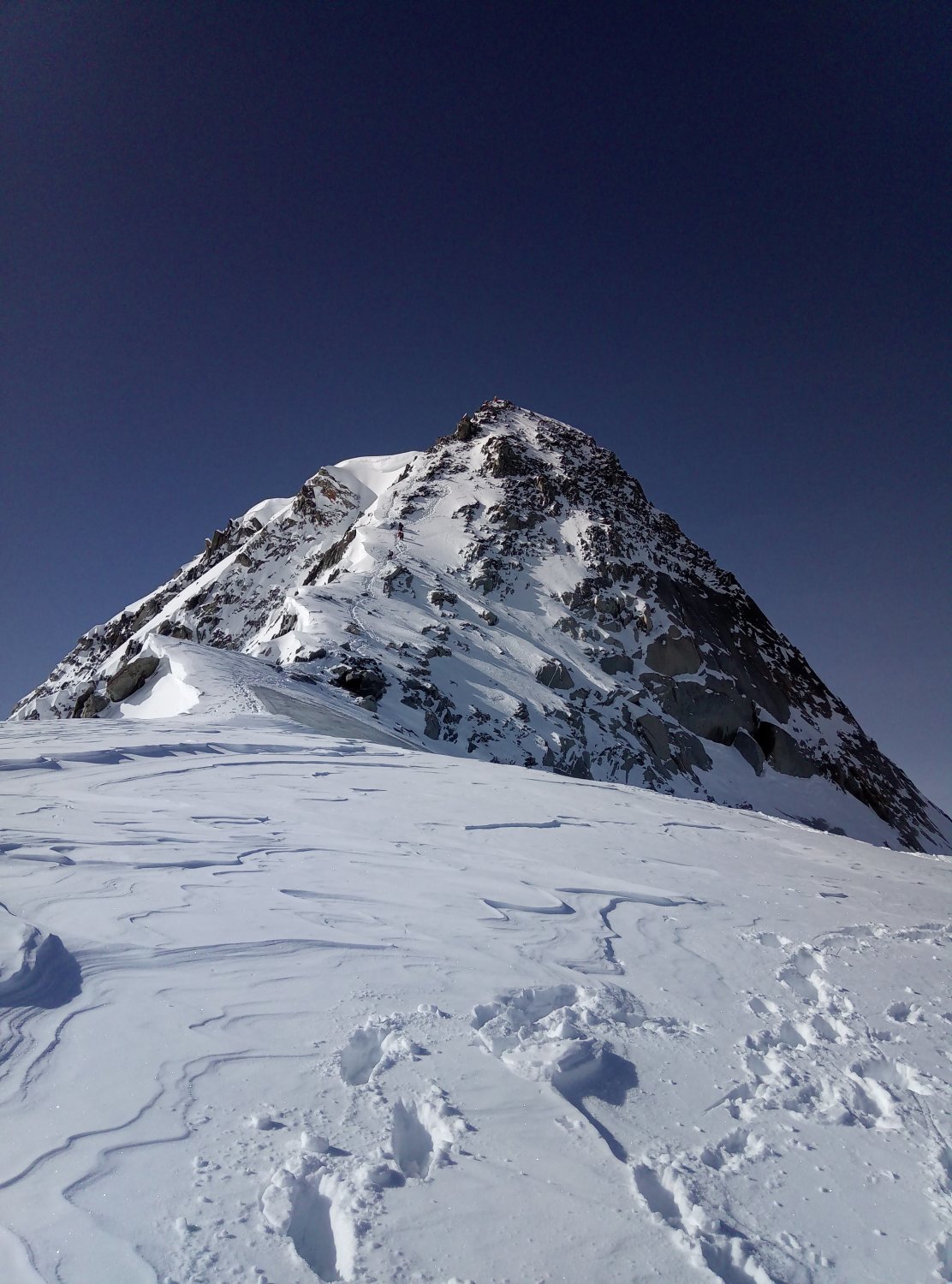 Fussaufstieg zum Gipfel ist über die Sommerroute oder auch direkt die Schneeflanke hoch eingespurt. Schneeflanke geht sehr gut (Trittschnee), oben am Ausstieg sind wenige Meter ziemlich steil. Der weitere Aufstieg zum Gipfel ist sehr gut eingeschneit und daher meist ein hochstapfen im Schnee. Erst kurz vor dem Gipfel gibt es noch zwei kurze (einfache) Kletterstellen. Die untere Davon ist sogar mit einem Fixseil ausgerüstet.