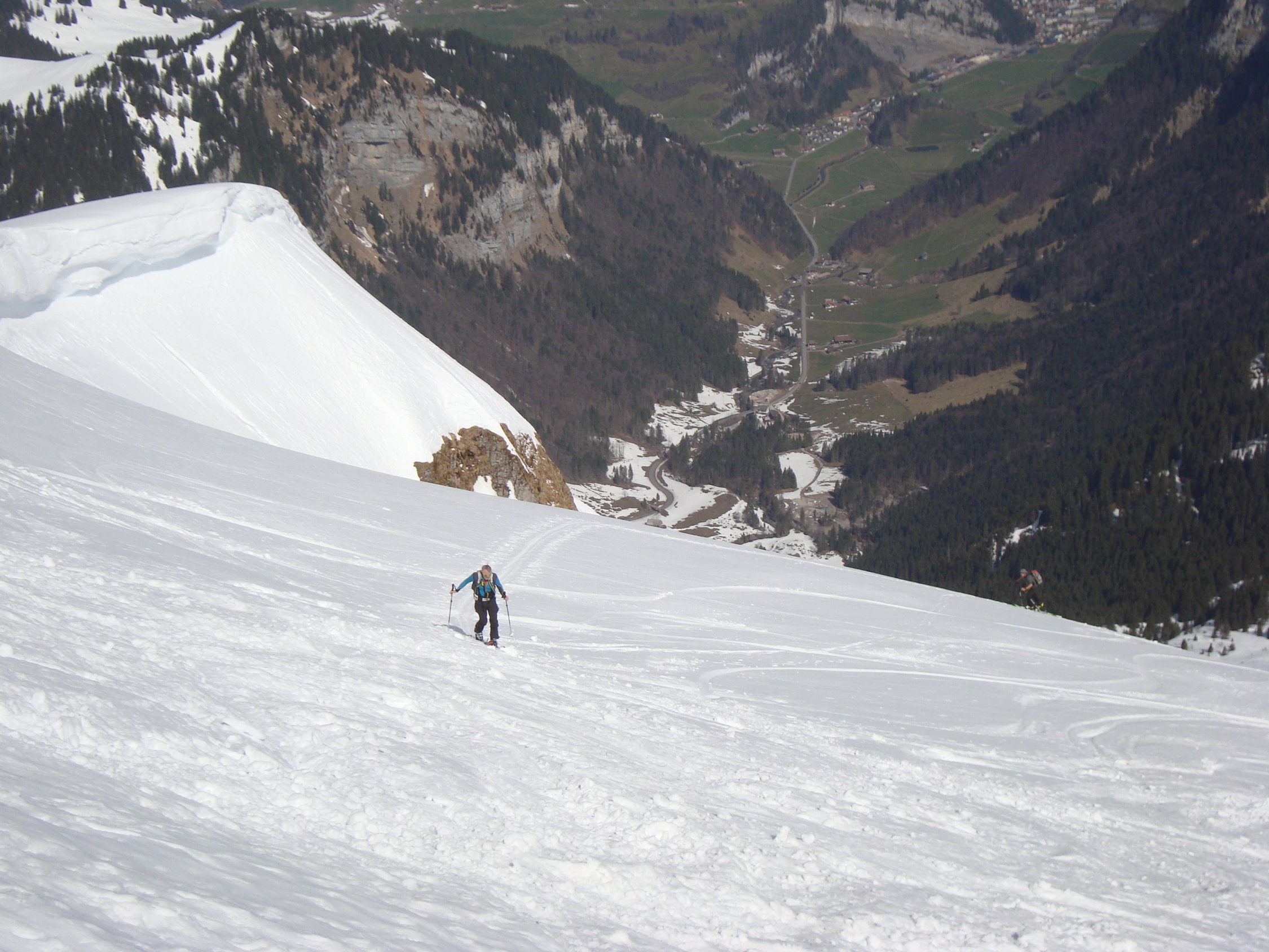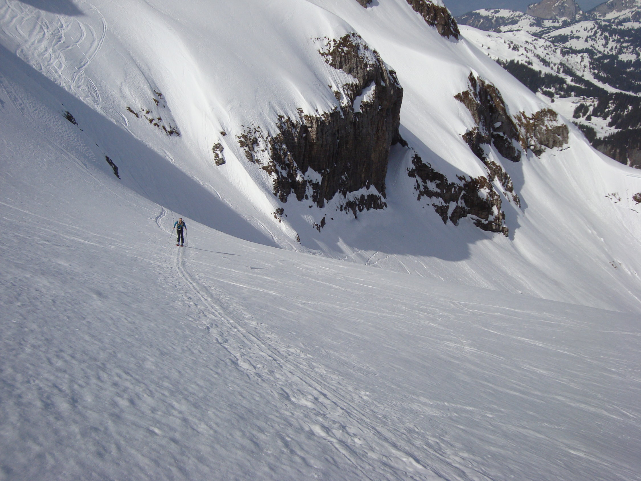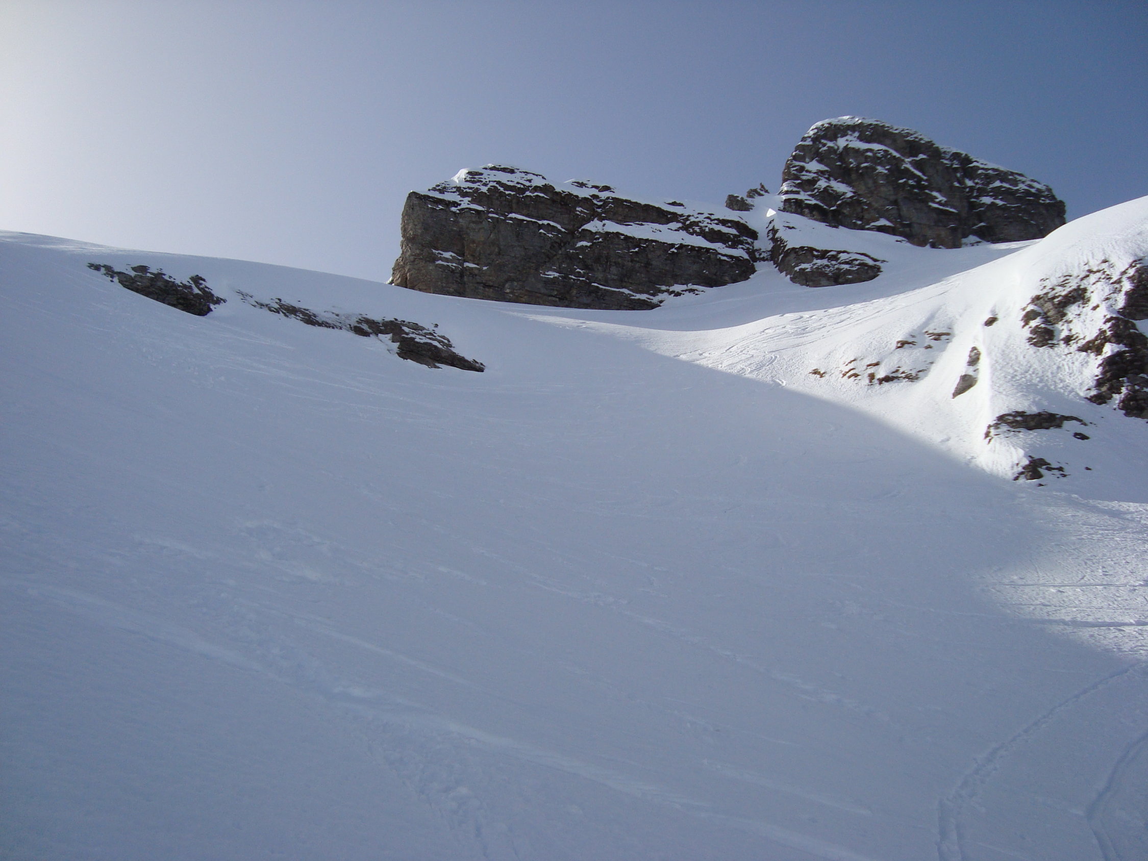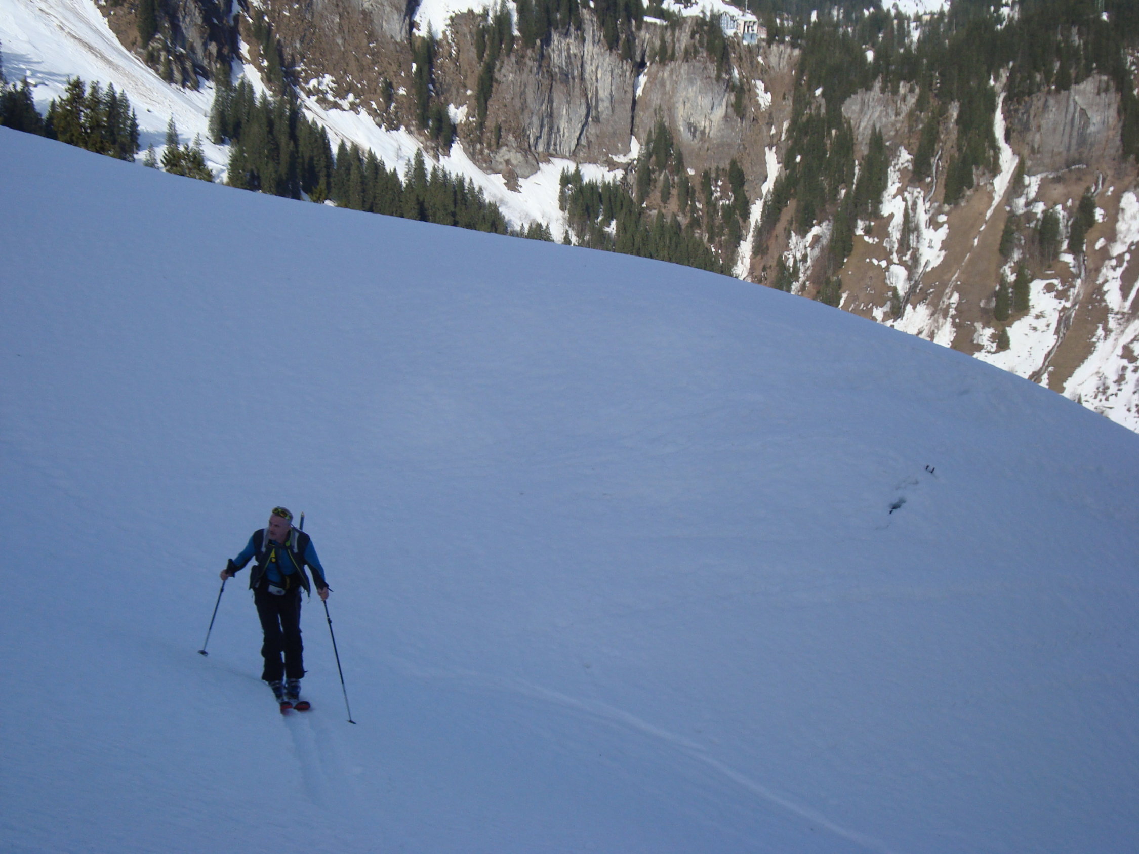 Die langen Traversierungen waren heute problemlos zu begehen. Der schon früh "sonnenverwöhnte" Gipfelhang war schon sehr stark aufgesulzt.