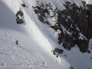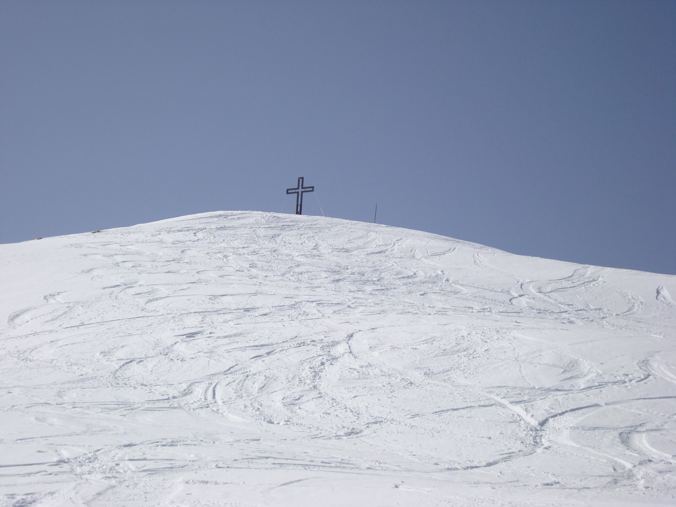 Auf dem Gipfel wurden wir mit einer traumhaften Sicht auf die umliegenden Berge belohnt. Die angenehme Temperatur bei einem nur lauen Lüftchen lud zum längeren Verweilen ein. Mit Sicht auf die Schneeverhältnisse in der Abfahrt mussten wir dieses Angebot leider zeitlich kürzen. Wir sind ca. 11.30 Uhr abgefahren, dies ist im nachhinein betrachtet, ehrlicherweise etwas zu spät gewesen. Für die steilen Hänge bis zum Wandfuss in etwas schweren Pulver top. Sehr schön zum abfahren. In dem eher flacheren und kuppierten Gelände unterhalb, dann eher zäh und manchmal leicht bremsend.
