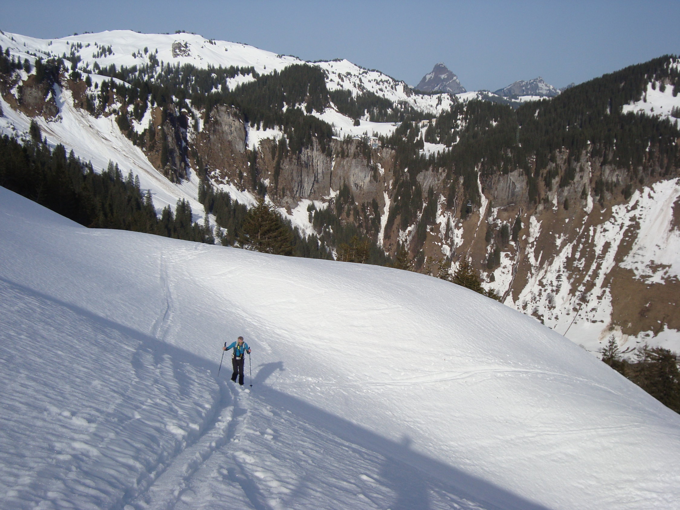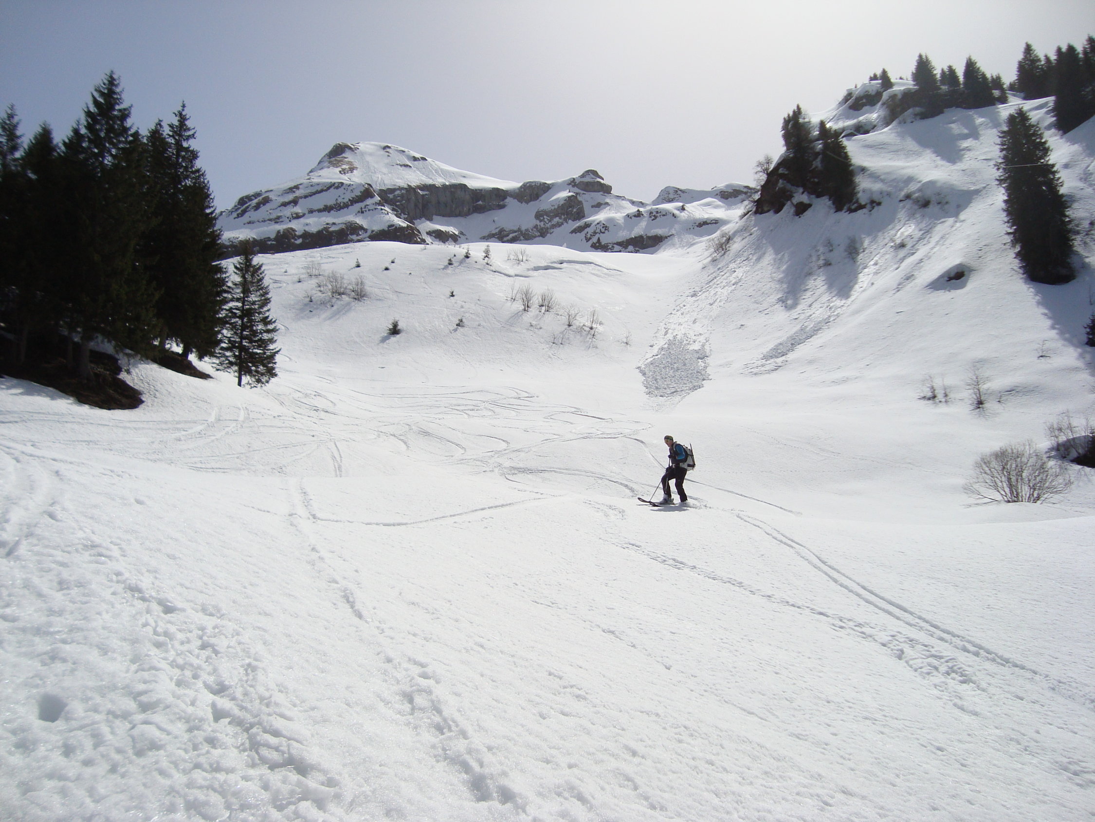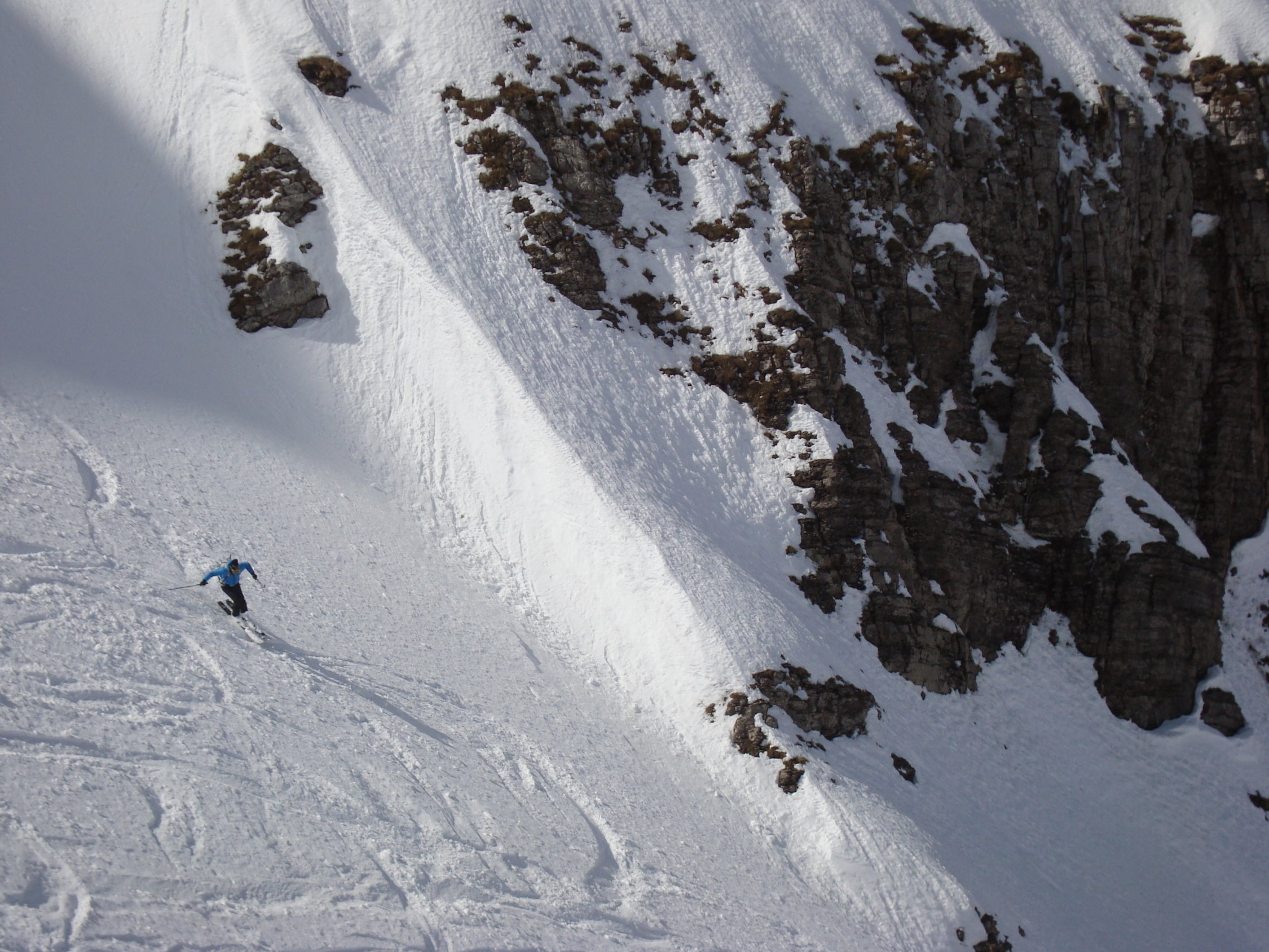 Die letzten sonnenabgewanden 150hm vor der Piste dann recht feuchter Sulz, gut drehend.