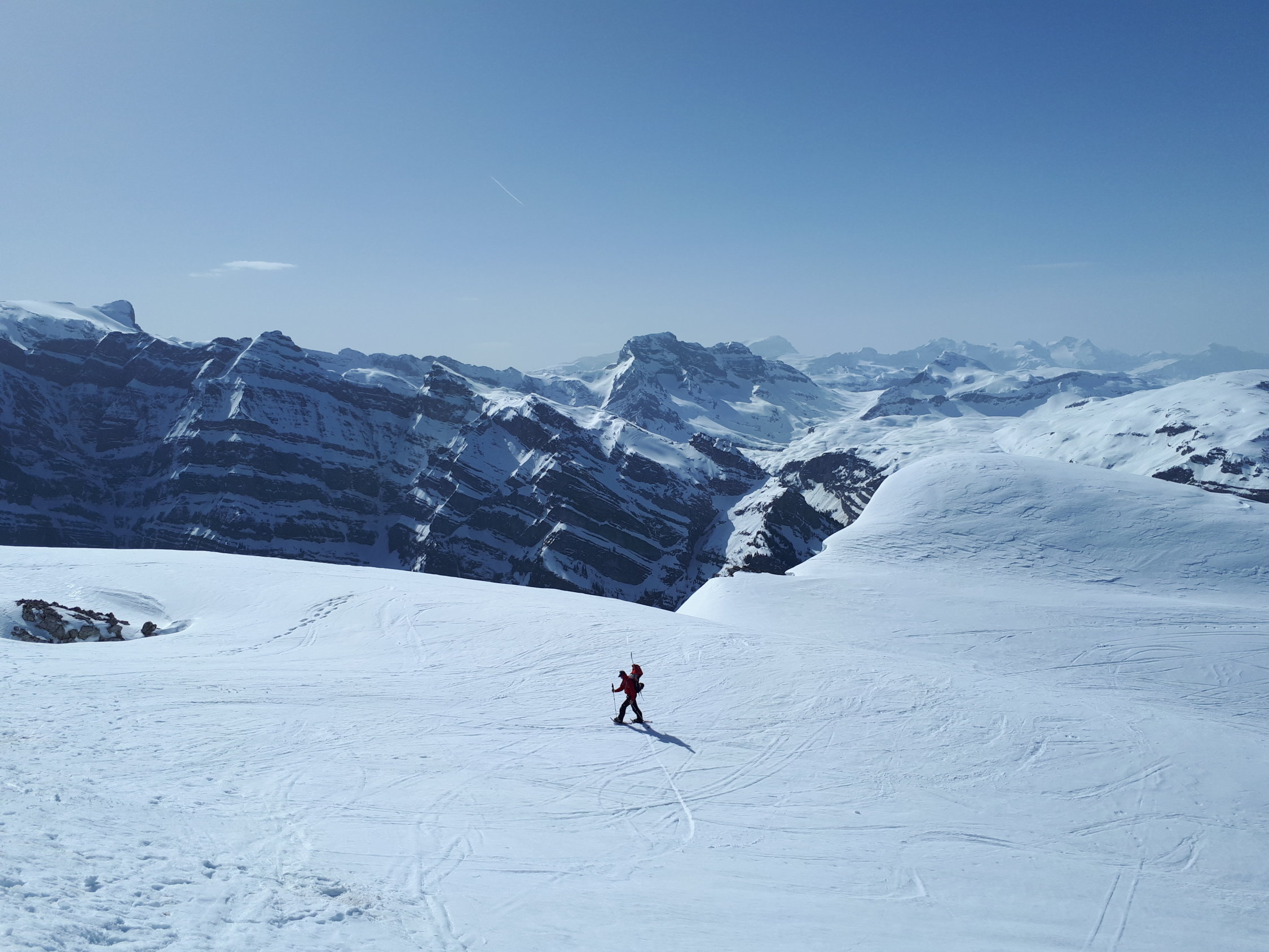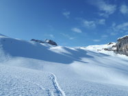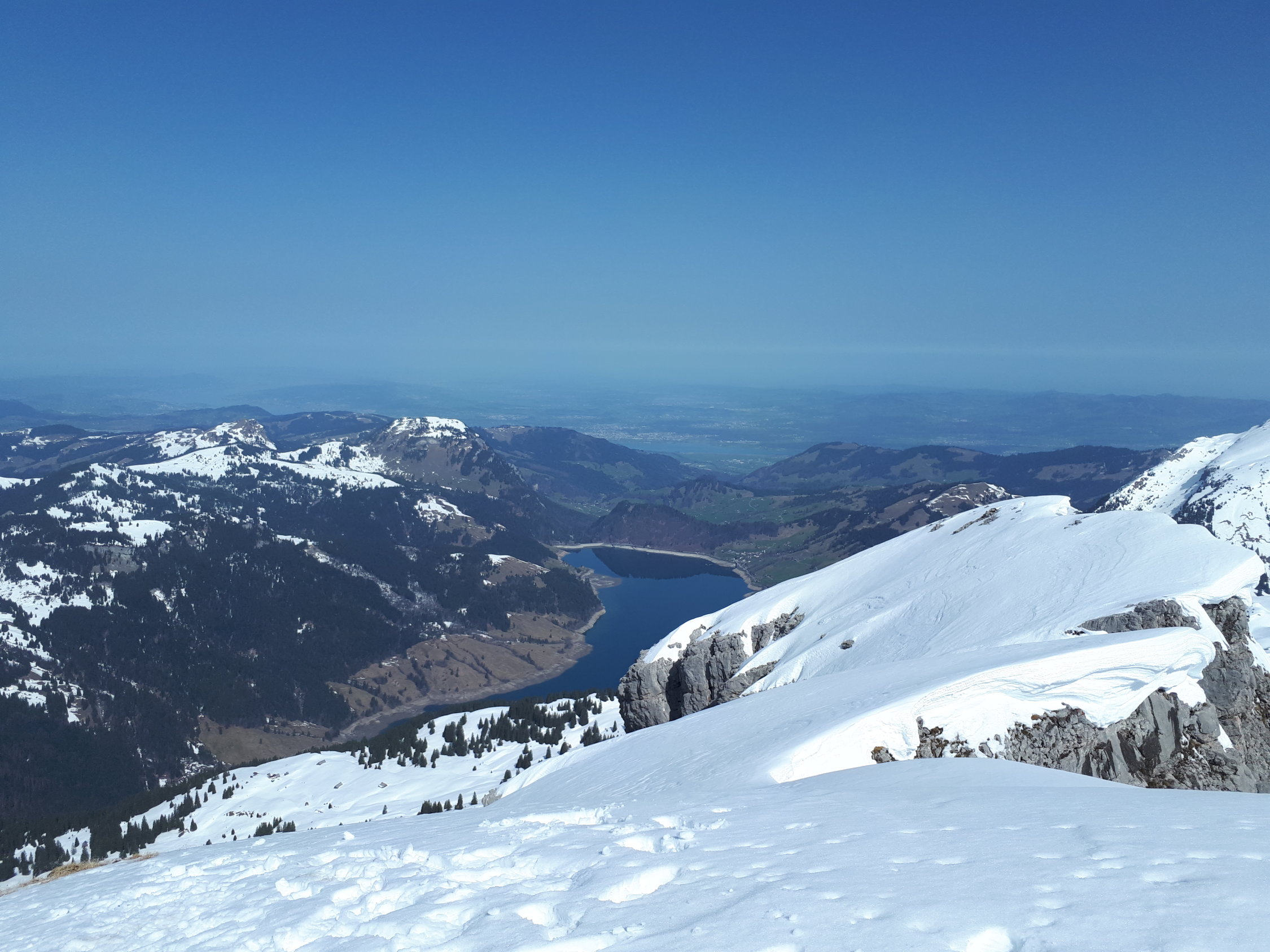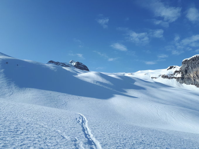 Schnee ab Ende Wägitalersee eher knapp. Erstes Teilstück Wald daher nicht durchgängig begeh-/fahrbar. Ist aber nicht weiter tragisch. Nach 10min hat es genug Schnee. Spur ist super, bis nach ganz oben und war auch mit dem Splitboard toll. Heute war es sehr warm, ein früher Start lohnt sich bei den Verhältnissen. Abfahrt bis ca. 12.30 Uhr ist empfehlenswert, anschliessend wird es sehr nass.