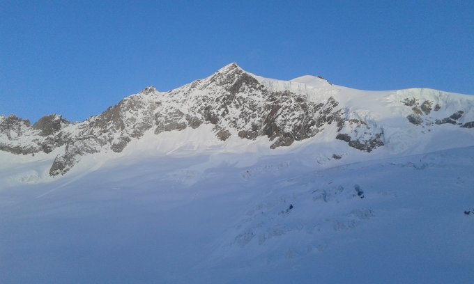 Am nächsten Morgen Abfahrt von Hollandiahütte über grossen Aletschfirn und grossen Aletschgletscher ca. zu Punkt 2200 sehr gut mit wenigen Schiebepassagen. Aufstieg über Mittelaletschgletscher zu Mittelaletschbiwak (P.3013) sehr gut eingeschneit, Spur vorhanden, Nassschneelawinenkegel säumen ein wenig die Spur. Aufstieg Mittelaletschbiwak zu Aletschjoch auf gutem Firn, Gratübergang zu Punkt 3718 einfach, gute Trittspur vorhanden. Weiter Ri Punkt 4087 im oberen Bereich eher mühsam (blank), sind bei ca. 3910m über die Felsrippe ausgewichen und dann zu Skidepot auf ca. 4120m im Pulver hochgespurt. Gipfelgrat gut zu begehen, 2-3 heikle Stellen. Steigeisen und Pickel ein Muss.