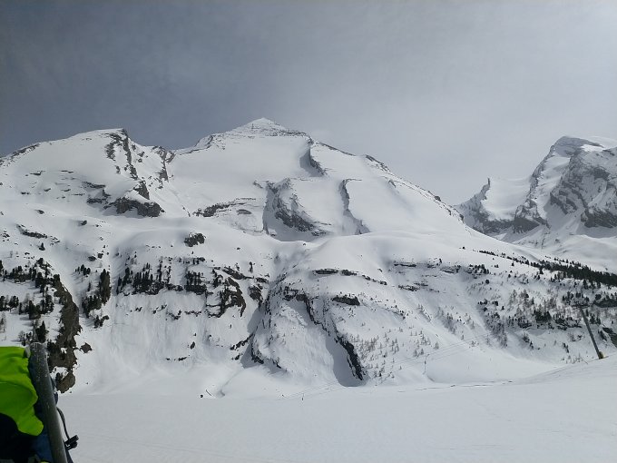 Abfahrt im mittleren Wandbereich verspurt aber im schattigen Bereich an der Felsrippe noch pulvrig. Weiter unten dann gegen 13 Uhr aufgefirnt.