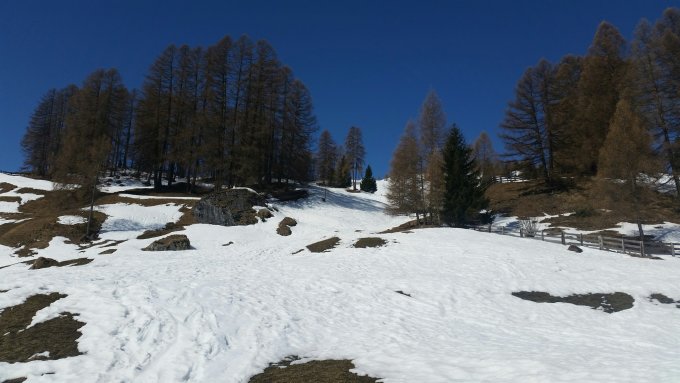 Bei Wergenstein Dorf wird der Schnee langsam knapp, ab Dumagns noch sehr lange machbar.