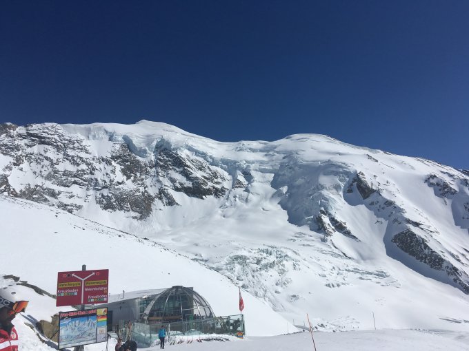 Ich hatte mich gewundert, warum es diesen Winter keine Einträge zur Weissmies Normalroute gibt. Also bin ich mit der Seilbahn auf die Hohsass gefahren, um mir ein Bild zu machen. Während alle umliegenden Gipfel in Saas-Fee wie Autobahnen eingespurt sind, findet sich am Weissmies Normalweg keine einzige Spur. Die Steilflanke zwischen 3300-3500m ist sehr spaltig, steil und sieht derzeit nicht machbar aus (siehe Foto).