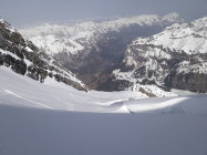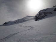 Schneefrei bis Undere Biberg, ab hier eine fast durchgehend geschlossene Schneedecke. Ab Obere Biberg dann perfekte Bedingungen: griffiger Firn bis zur Rinne auf 2800, ab hier dann Pulver/Presspulver bis kurz vorm Gipfel. Der Gipfelhang ist abgeblasen, geht aber ok ohne Harscheisen. Die Steilstufe im Gletscher kann zur Zeit problemlos rechts überwunden werden.