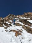 Viel Schnee beim Aufstieg. Firnpassage unterhalb Gipfelhang. Stangen bei Abstieg auf SW-Rippe schauen alle aus Schnee heraus.