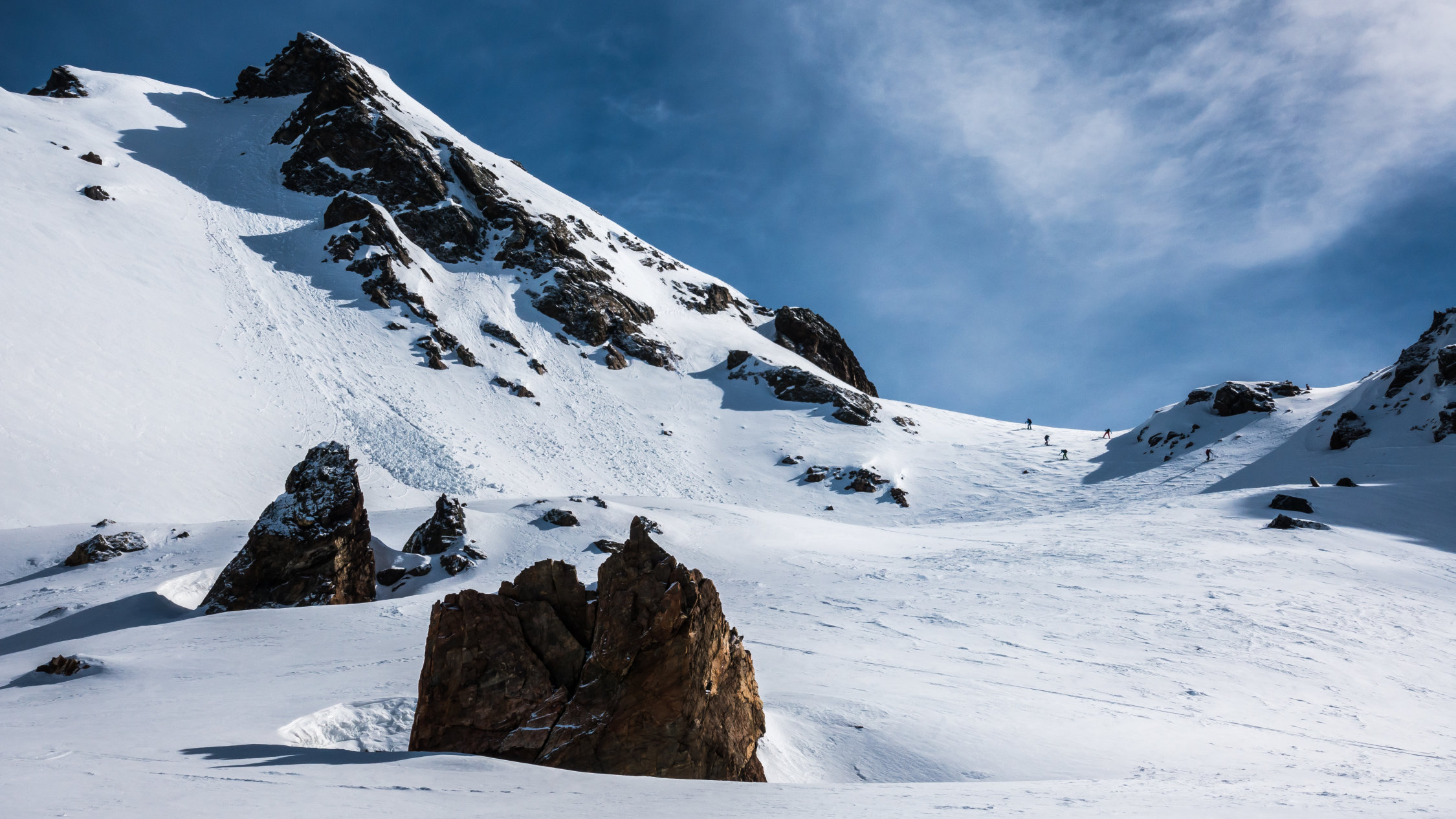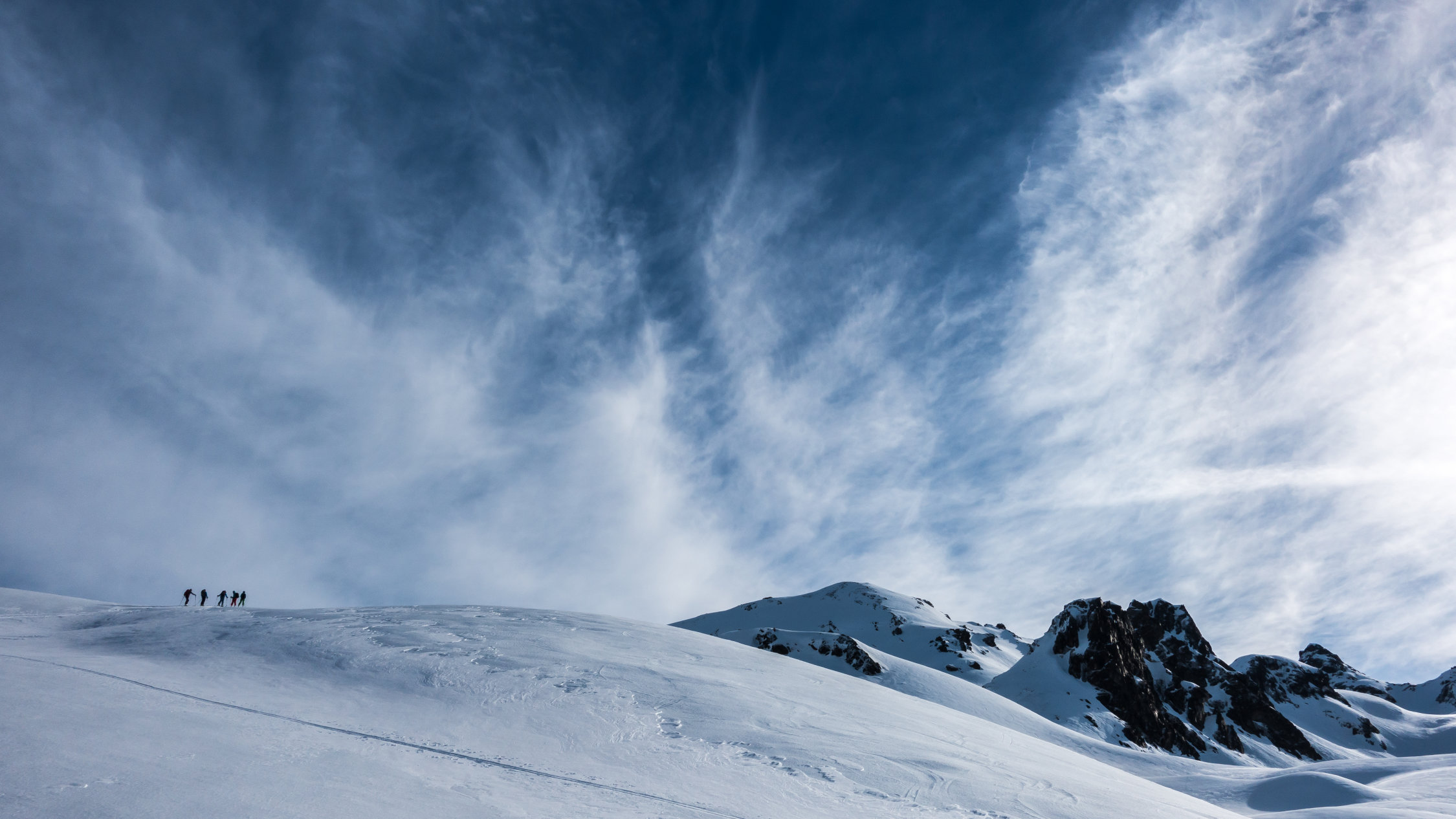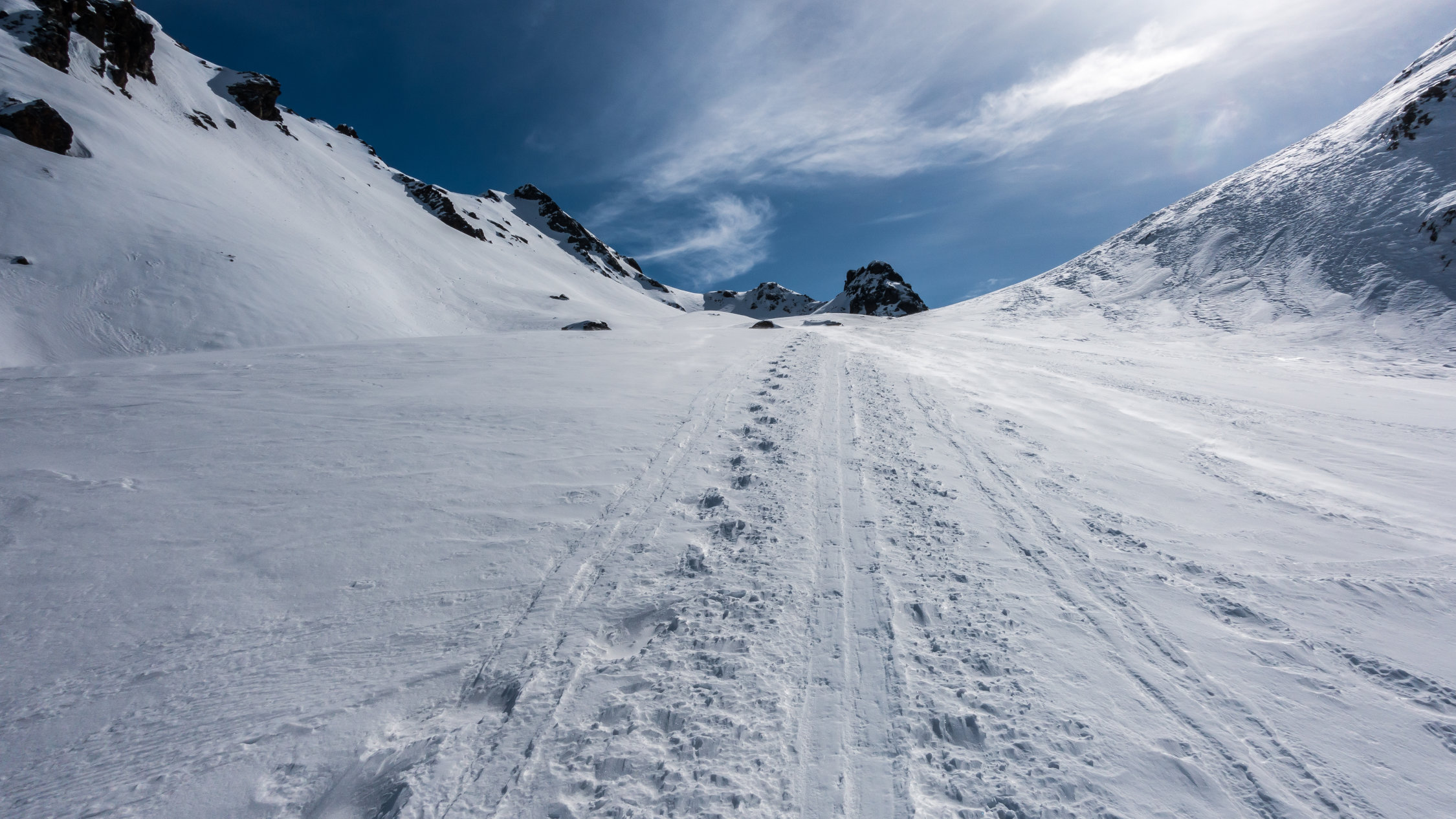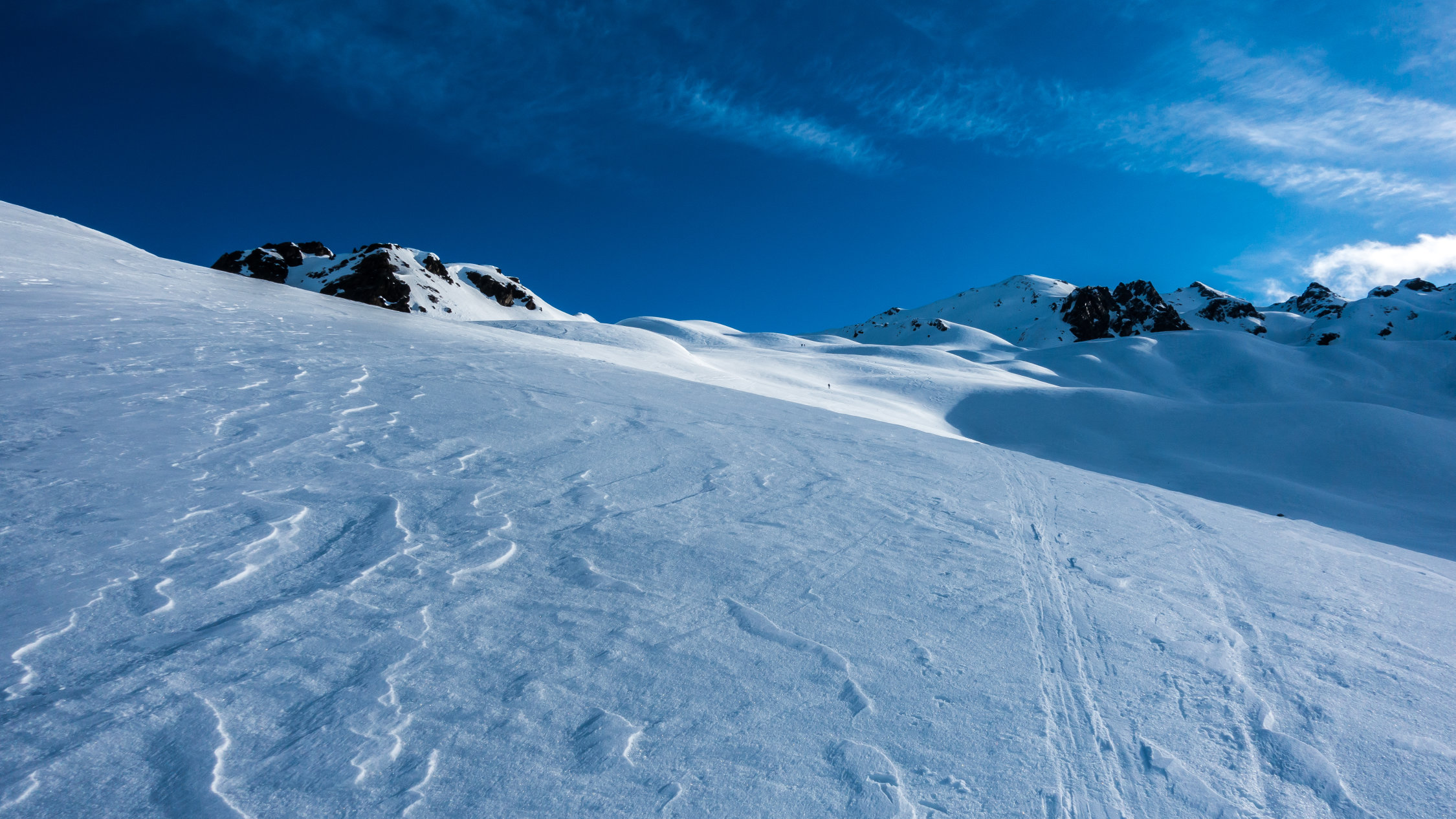 Start bei wolkenlosem Himmel, -3° und kaltem Südwind um 8 Uhr ab Parkplatz Tschuggen. Das war heute zu früh. Durch den kalten Wind und die zeitweise hohen Wolkenfelder brauchte es heute Geduld bis der Traumsulz bereit war für die Abfahrt. Langsamer Aufstieg und warten war also angesagt. Problemloser Aufstieg (ohne Harscheisen) bis zum Skidepot, heute ab dort zu Fuss zum Gipfel auf sehr gutem Trittschnee. Man hätte noch bis zur Mitte mit Ski gehen können. Abfahrt um 12 Uhr über pickelharten Gipfelhang und um die Wartezeit auf Sulz todzuschlagen, nochmals anfellen und Aufstieg zum Gipfel (2838m) südlich des Isenfürggli. Abfahrt von hier um 13 Uhr war perfekt, traumhafter, gleichmässiger Sulzschnee vom Gipfel bis zum Parkplatz.
