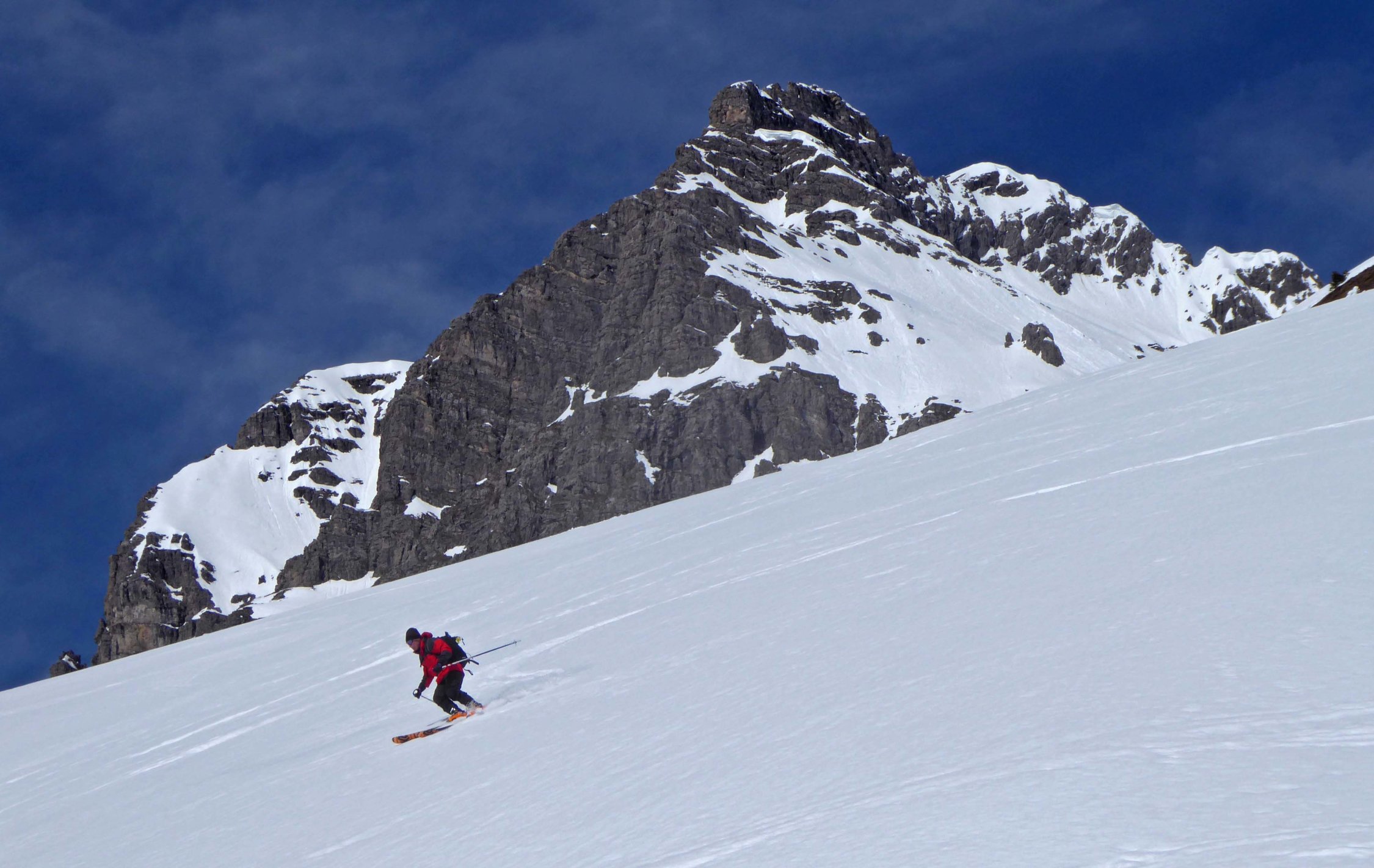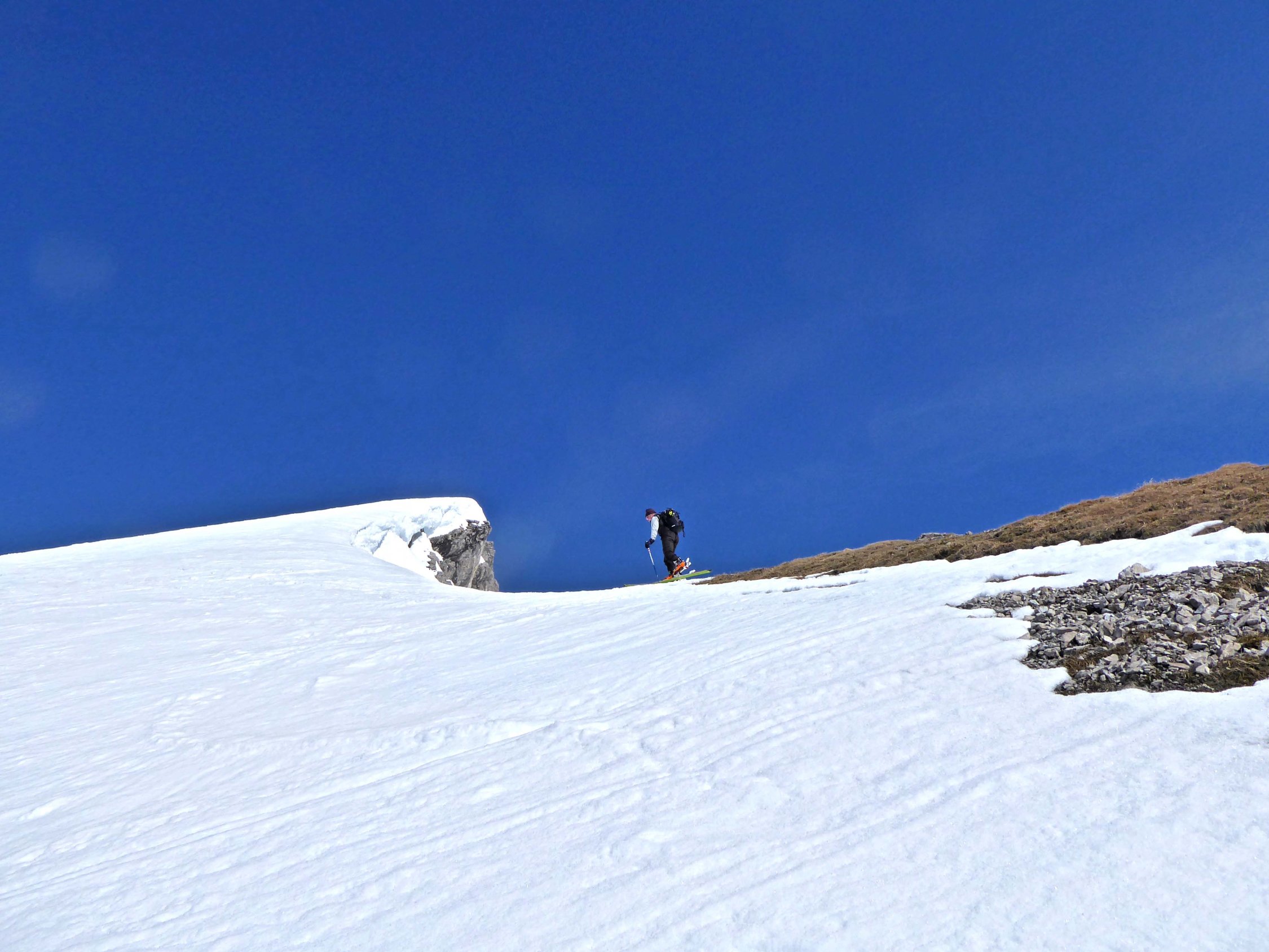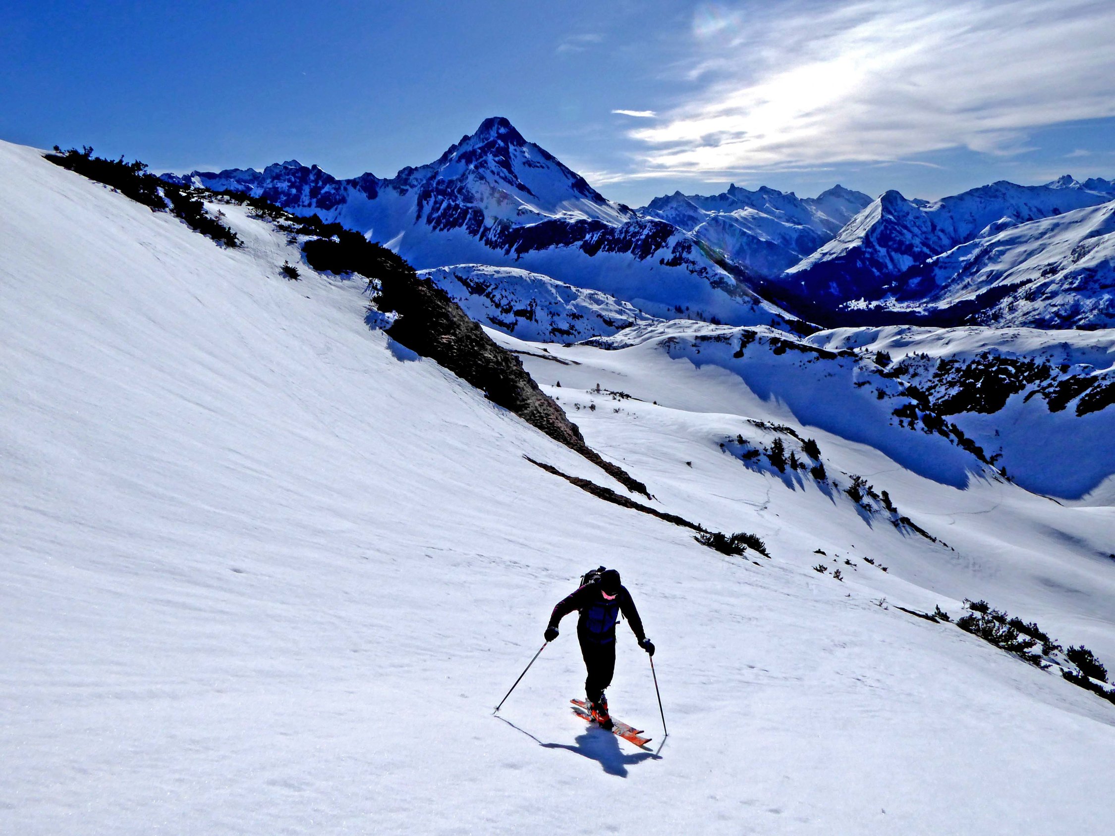 Start 7:45Uhr. Der Schnee war hart gefroren. Harscheisen waren dringend erforderlich. Abfahrt 11:15Uhr. SO-Hänge waren gut angetaut. Bei der Abfahrt zur Gemstelalpe befährt man W- bis N-Hänge. Diese waren noch hart. Nach dem Aufstieg zum Gemstelpass, war die Abfahrt zum Hochtannbergpass zunächst gut. Je tiefer wir kamen, desto weicher wurde der Schnee. Inzwischen war es fast 13Uhr. Das war für diese steilen S-Hänge zu spät!