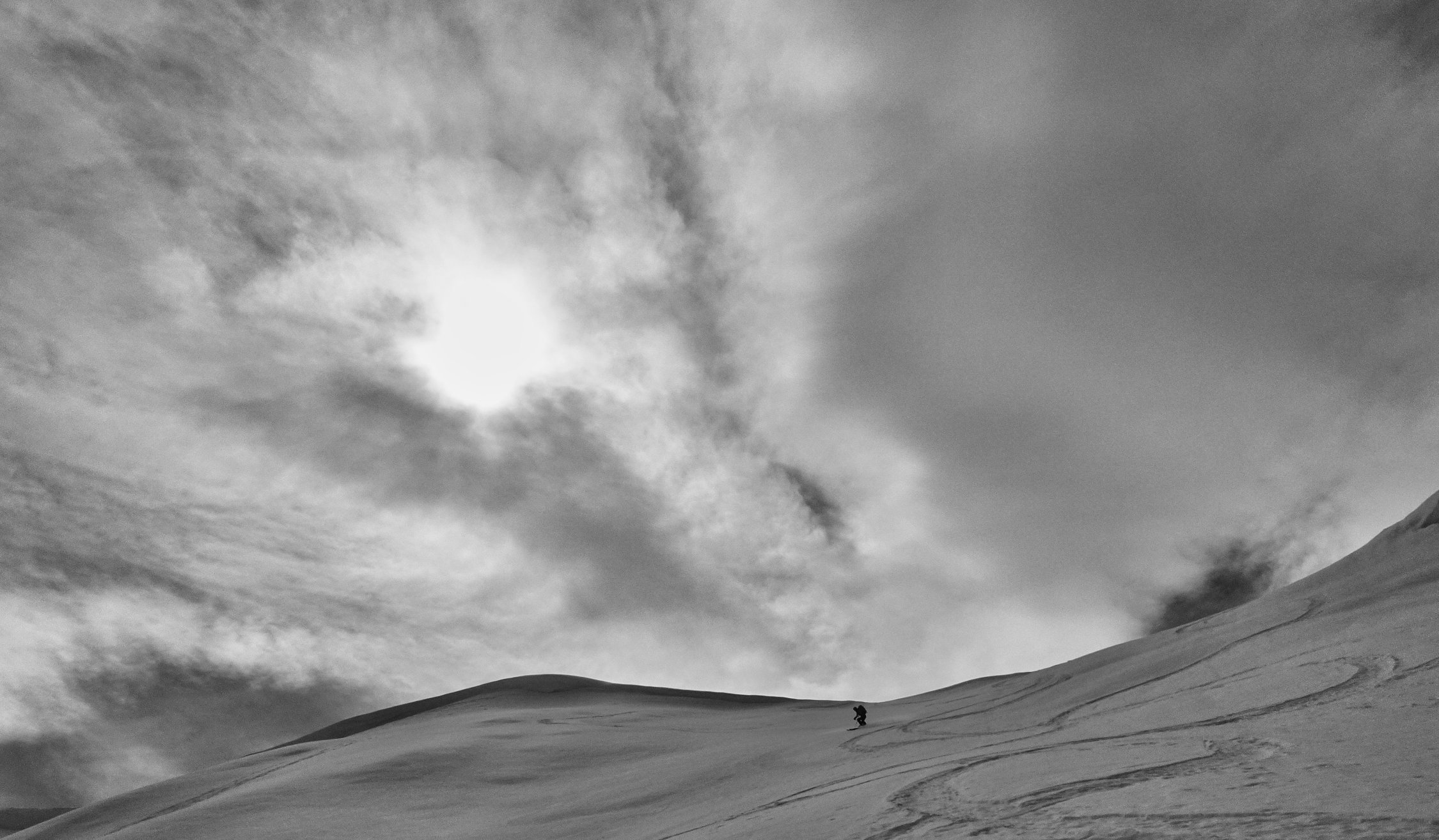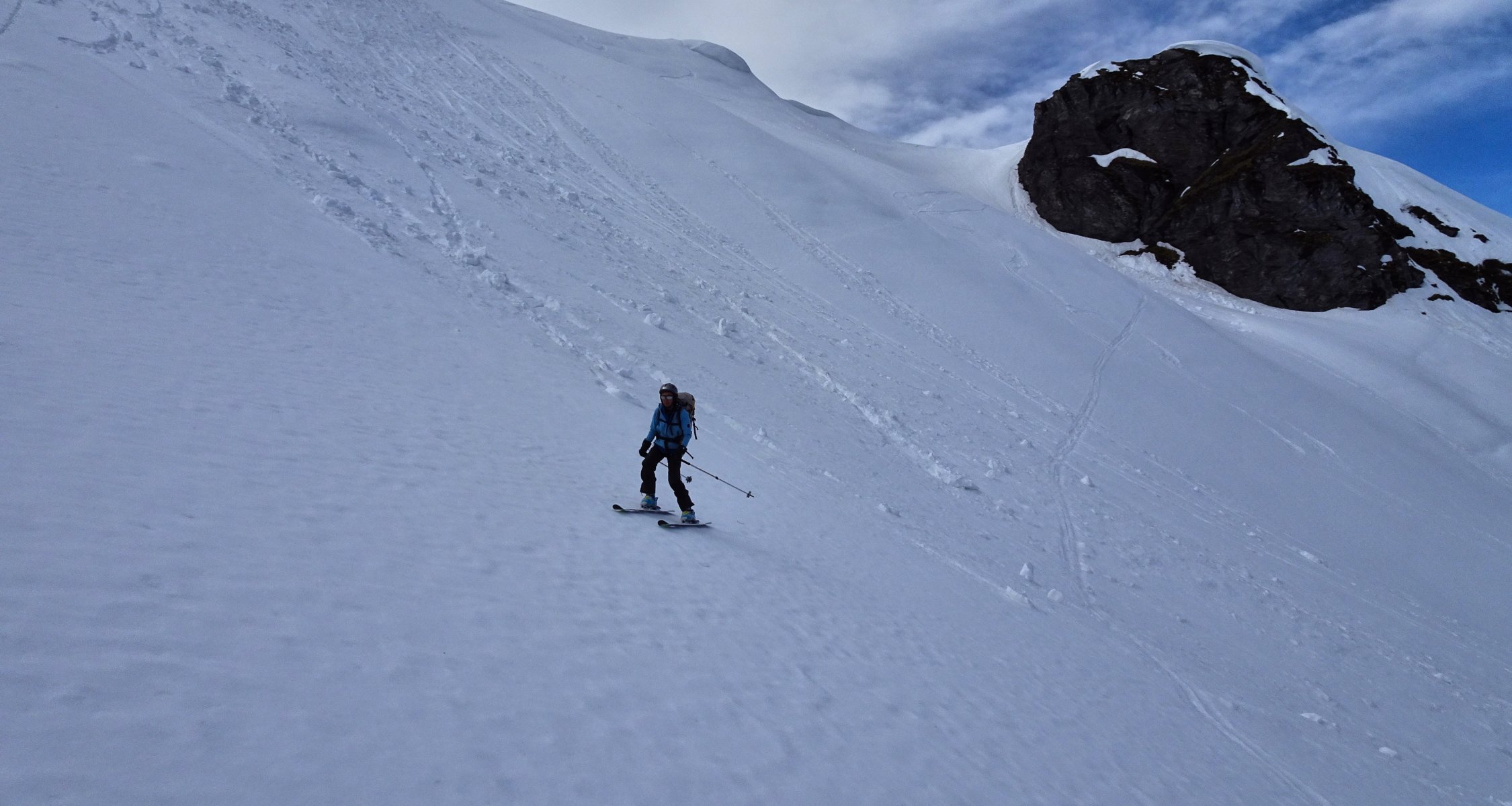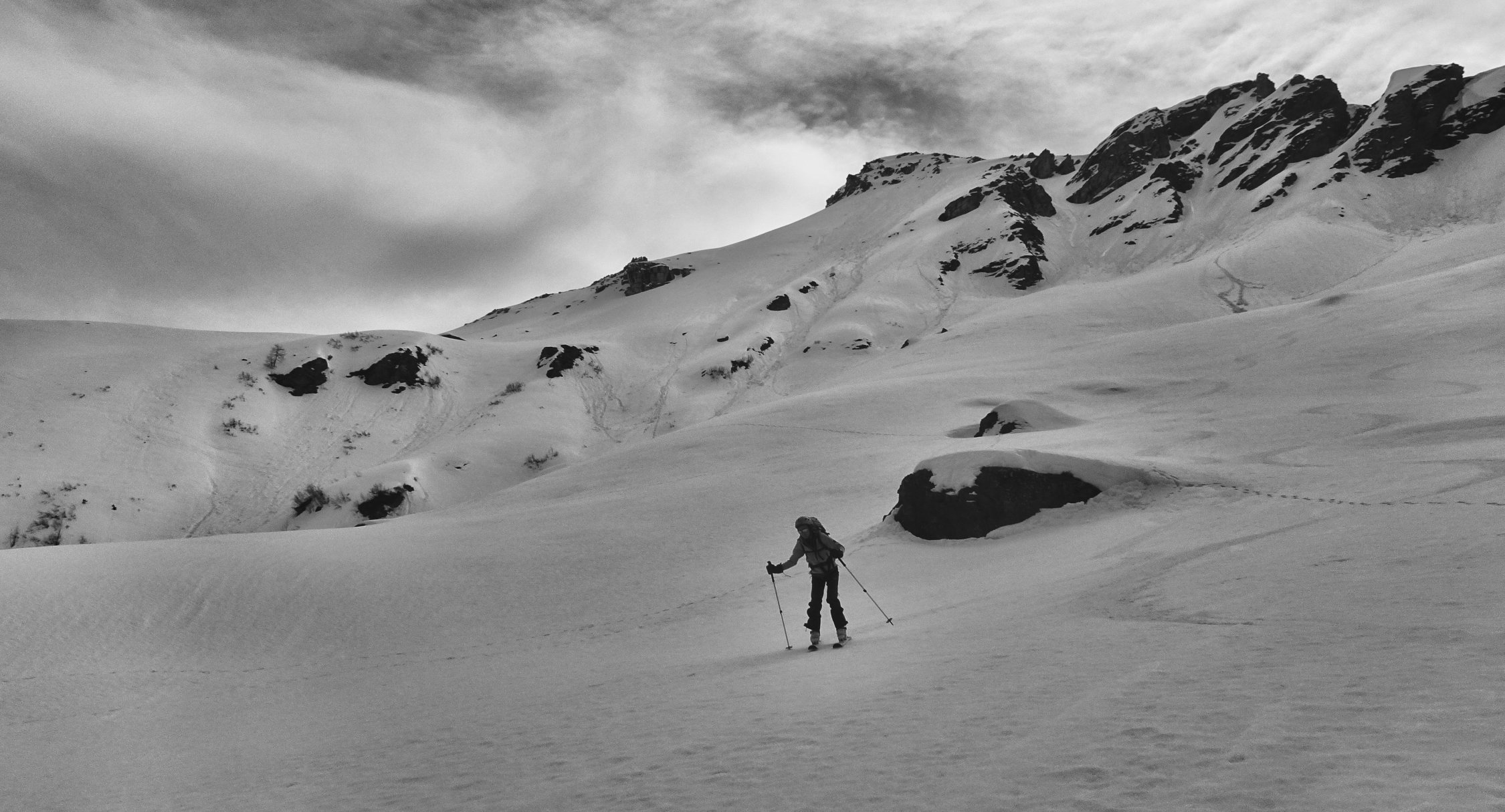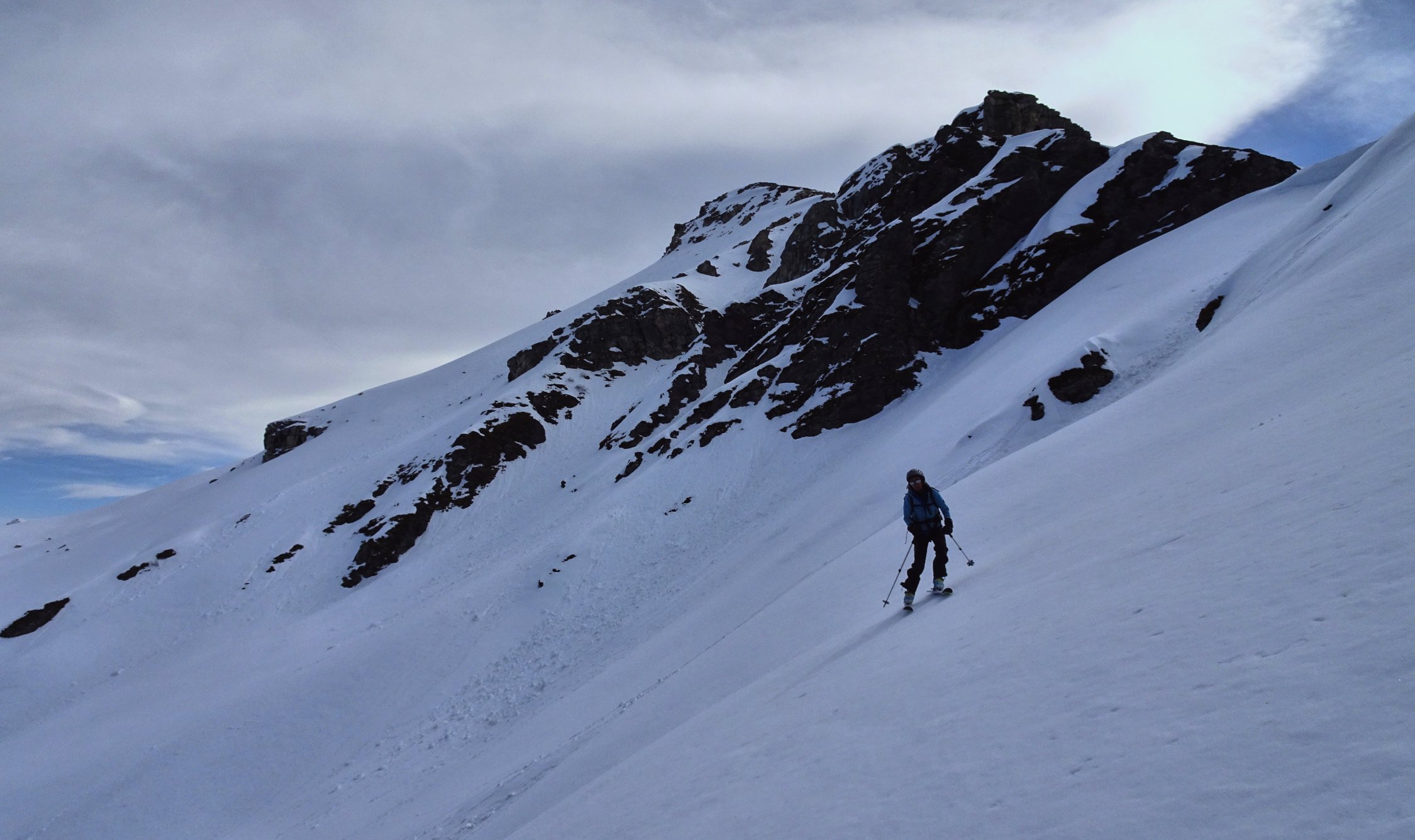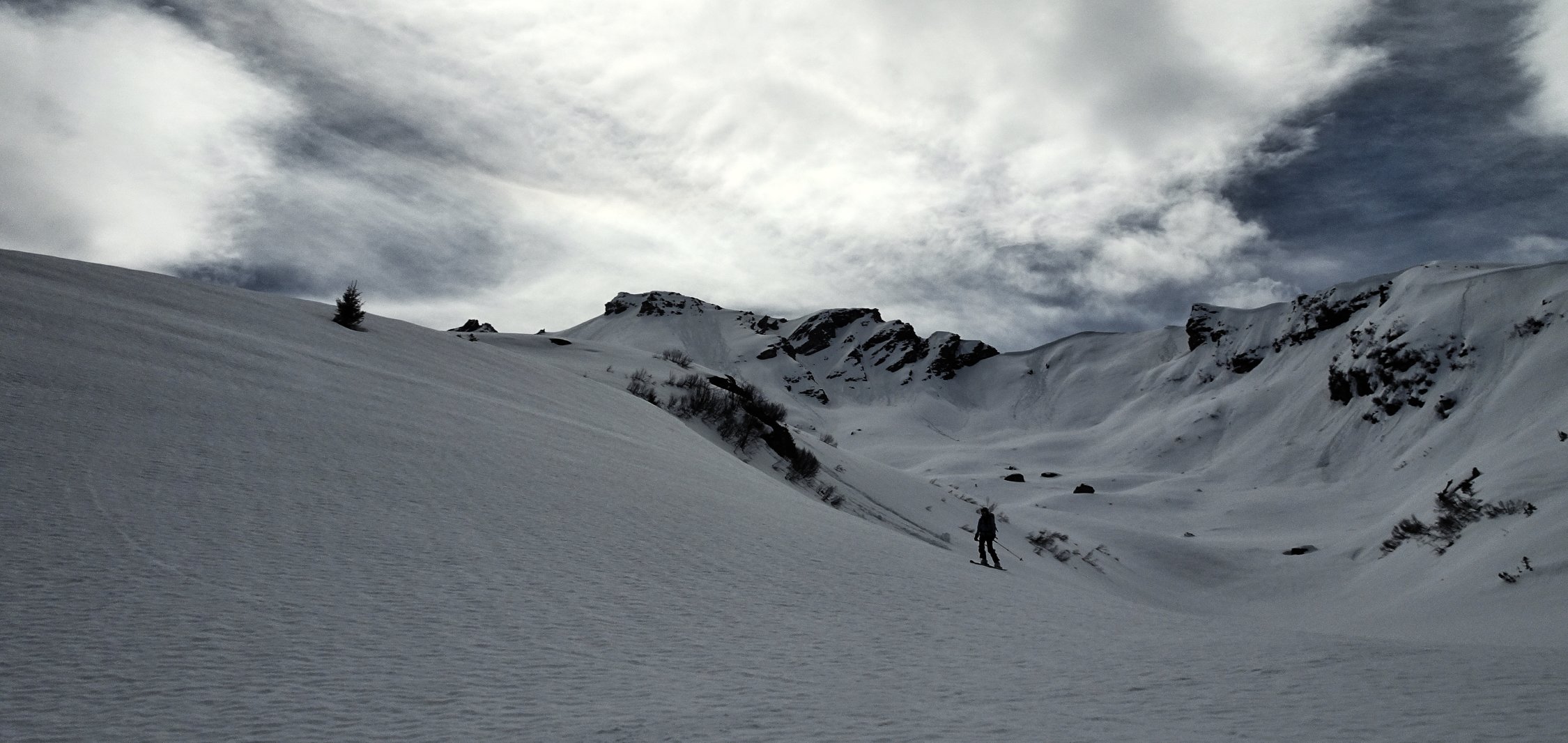 ... nach der Autofahrt zur Mittelstation der Pizolbahn geht's durch das verlassene Skigebiet hinauf zur Pizolhütte und weiter auf der üblichen Route zum Gamidaur. Heute herrschen anspruchsvolle Verhältnisse. Die Schneedecke ist hart gefroren und verlangt ein sicheres Aufsteigen und Abfahren.