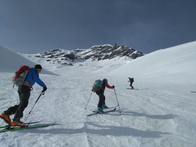 Der Übergang (Punkt 2'597m) zum Gipfelschlusshang ist momentan auf Skis gehend bewältigbar (Harscheisen!), einige Skitourengänger haben dort eine kurze Skitrage-Passage eingelegt.