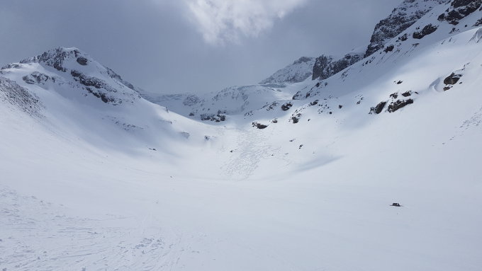 Aufgrund des südföhn und fehlender Sonne, Abfahrt grösstenteils Bruchharsch. Aufstiegsroute ab skidepot mit bestem Trittschnee.