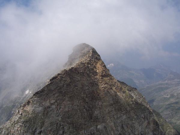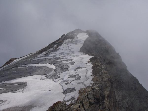 Verhältnisse infolge Gletscherrückgangs problematisch: Grauhorngletscher und Vadrecc di Casletto blank und kaum begehbar, NNW-Grat teilweise in die Flanken gestürzt.