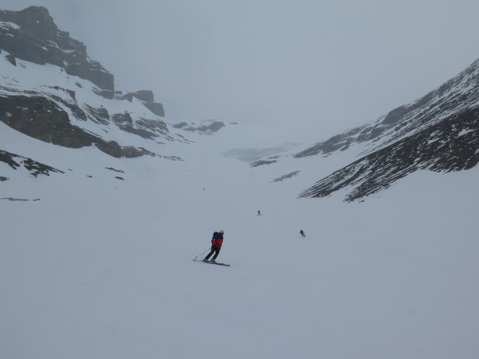 Wegen den Wolken, ist das Schnee im oberen Teil sehr hart geblieben, deswegen war dieses abfahrt Teil sehr anstrengend und schwierig heute. Untere Hälfte in Sulzschnee war dagegen sehr angenehm.
