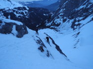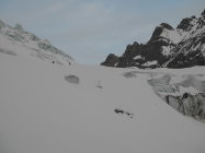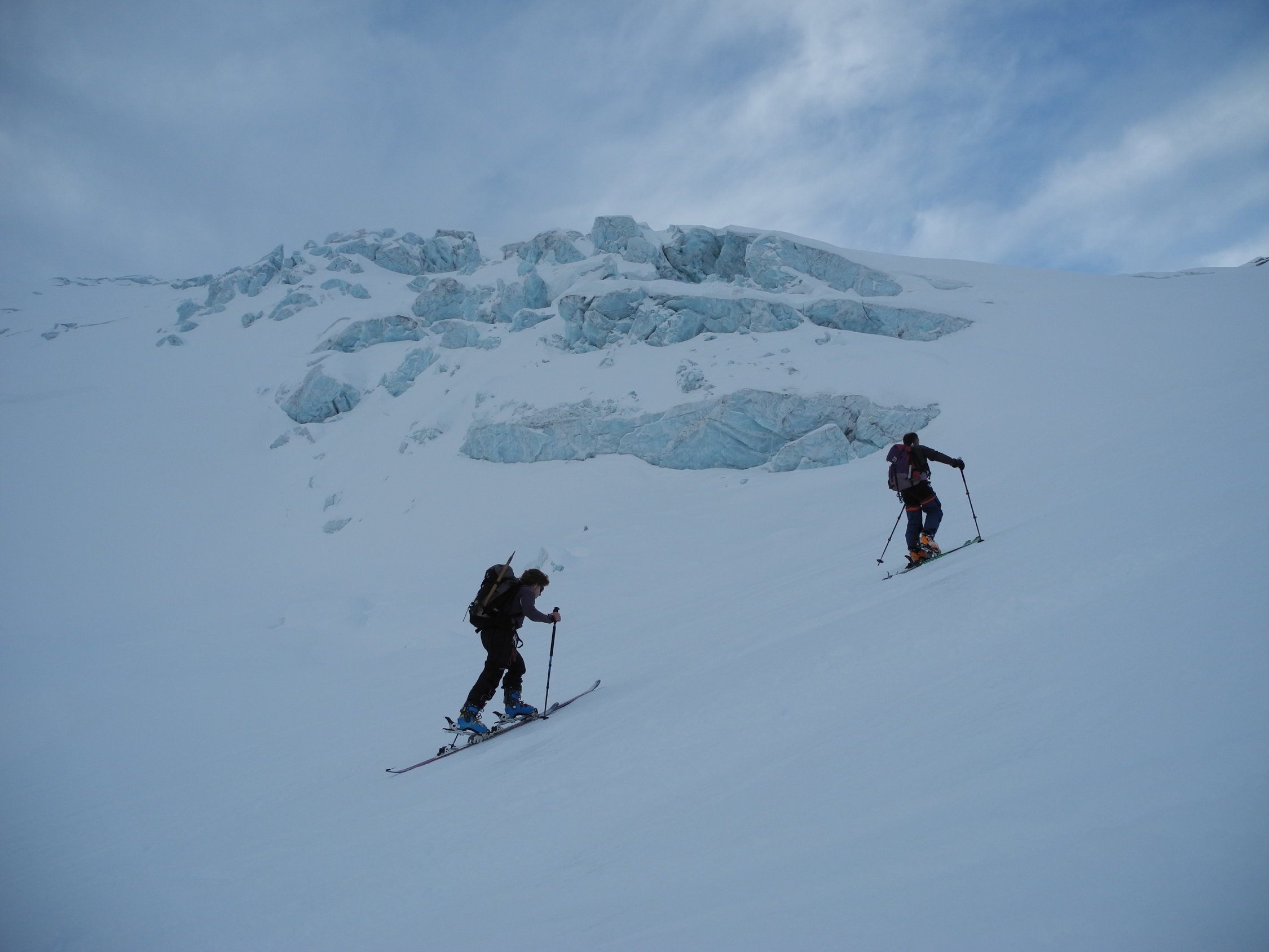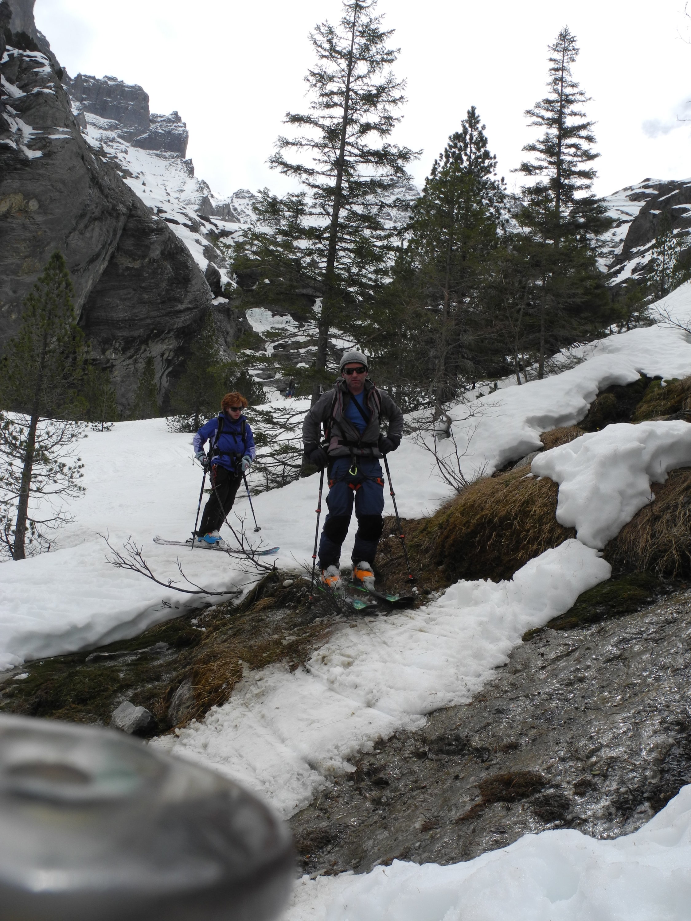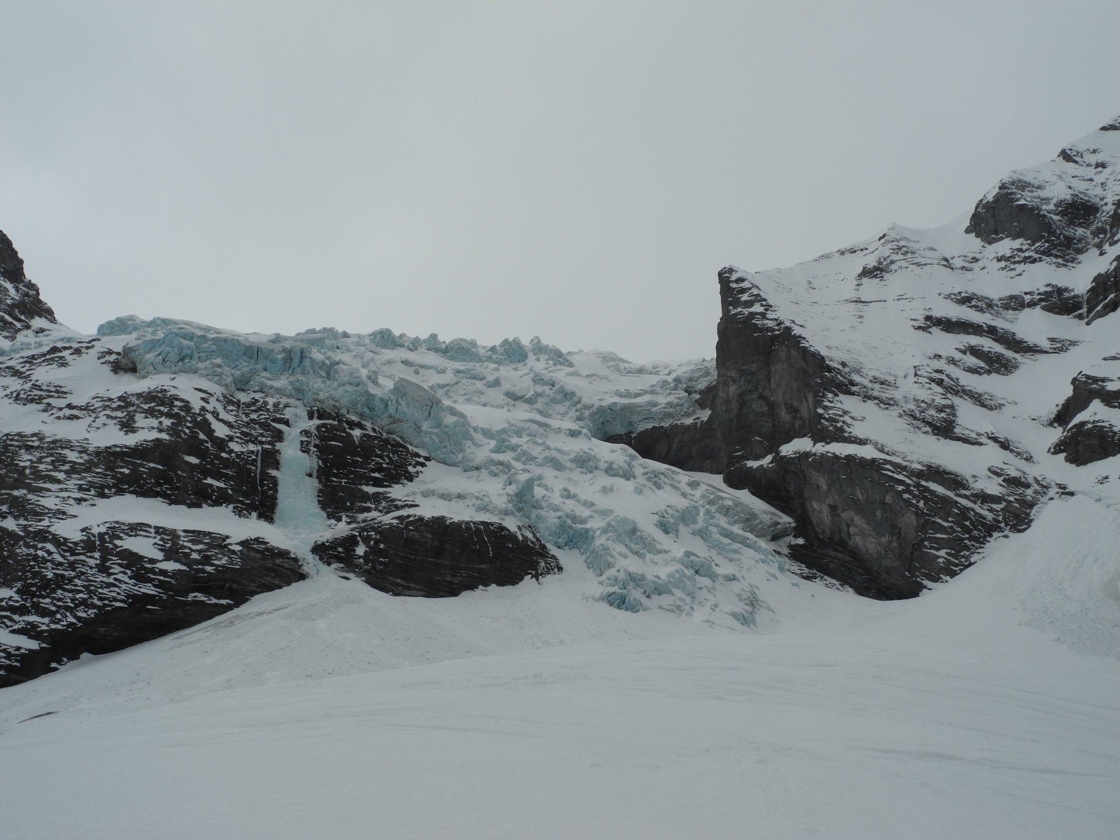 Die Route über den Dossenweg ist nach dem Brüggli immer wieder durch mächtige Lawinenkegel unterbrochen. Es empfiehlt sich beim Brüggli 1487 auf der Abfhartsroute östlich des Wellhorns aufzusteigen. Ab Rosenlauibiwak ist der Gletscher z.Z. noch sehr gut eingeschneit. Beim Wetterhornsattel kommt das Eis bereits zum Vorschein. Der Gipfelaufstieg ist mit Steigeisen problemlos. Bei der Abfahrt vom Wetterhornsattel lohnt es sich zur Westflanke des Dossen zu fahren um so direkt Richtung Biwak abzufahren (schöner). Die Abfahrt auf der Ostseite des Wellhorns ist bis auf zwei Stellen durchgehend.