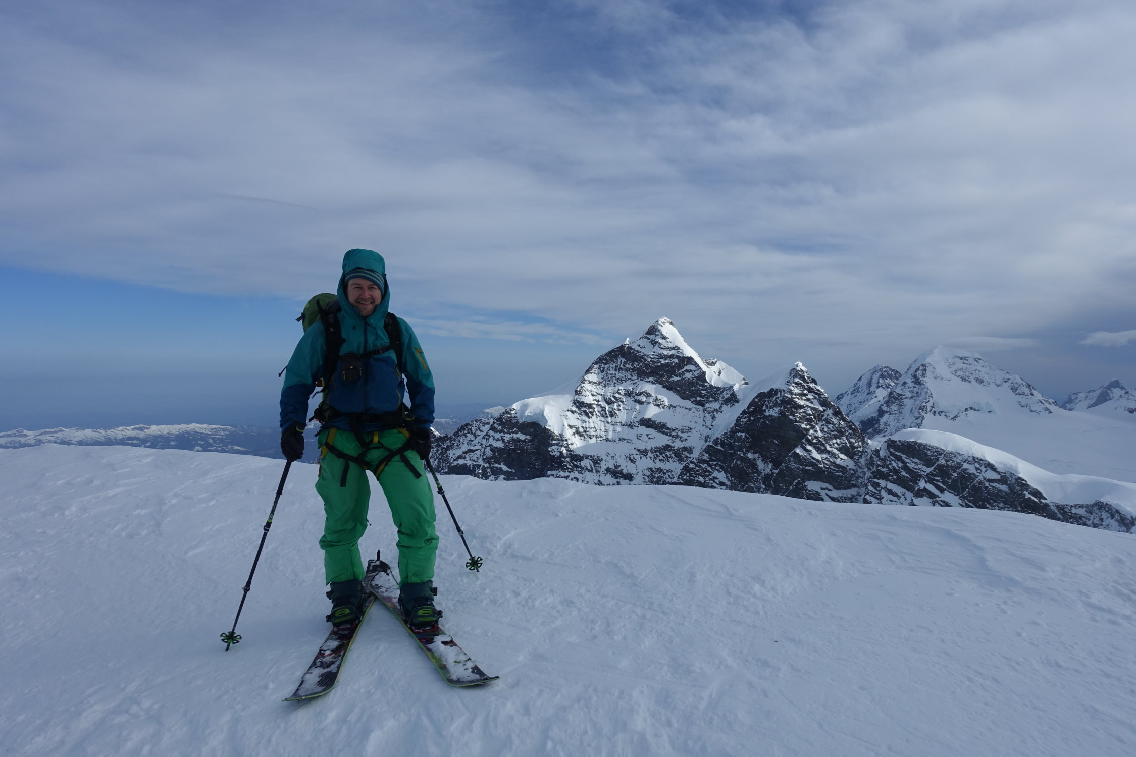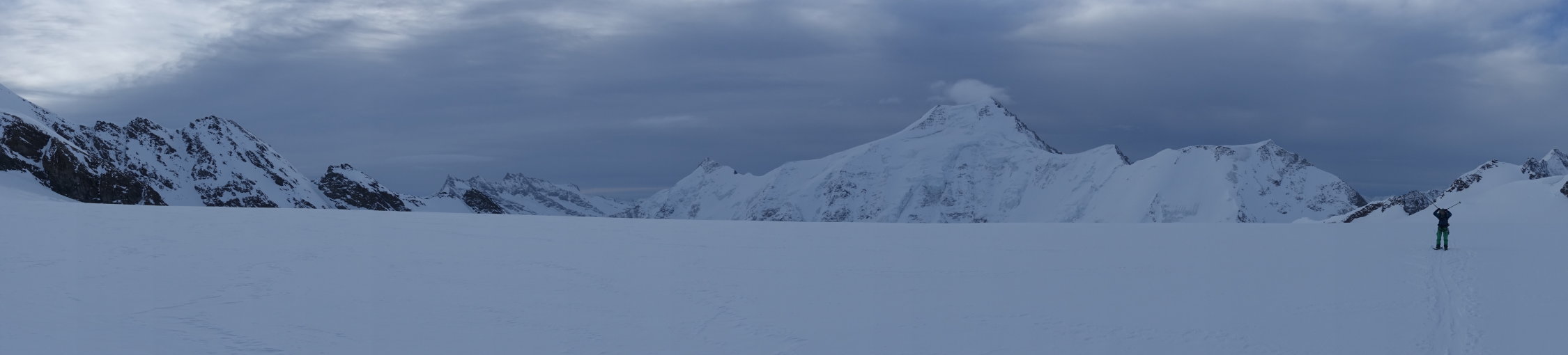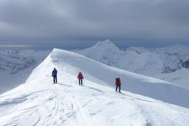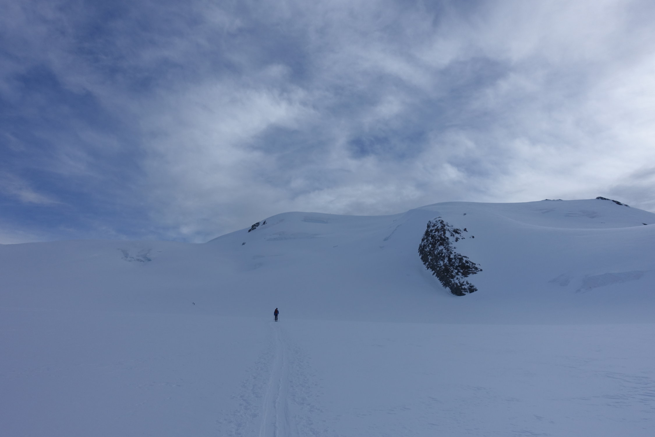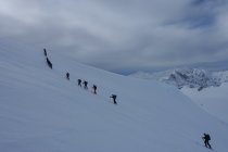 Auftsieg auf guter Spur über die Gletscherebene zum Gipfelhang. Es waren ca. 50 Personen gestern im Aufstieg nach uns, darunter auch Riesengruppen die alle Seilfrei unterwegs waren. Aufstieg im Hang auf guter Spur, Abfahrt windbearbeiteter Presspulver.Gestern recht kalt. Waren ca.6:45 Abmarsch Hütte, 9:00 am Gipfel