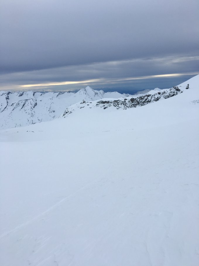 Ein Blick hinüber zum Strahlhorn liess vermuten, dass dort ebenfalls gute Bedingungen herrschen, mehr als 50 Tourengänger haben wir auf der Route zu diesem Gipfel gezählt. Und das ist bei weitem nicht der einzige Grund, weshalb man eine Besteigung des Rimpfischhornes vorziehen sollte.