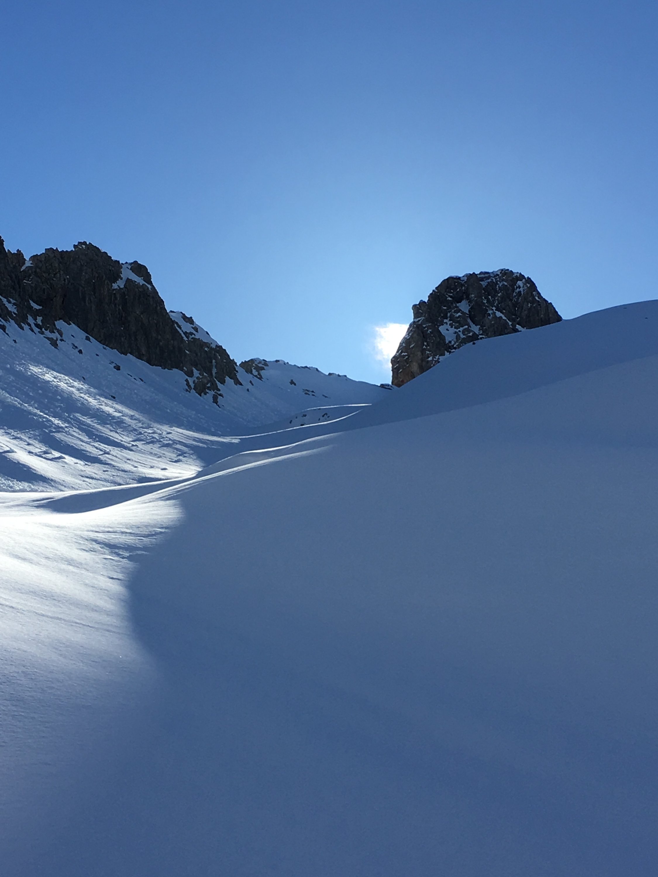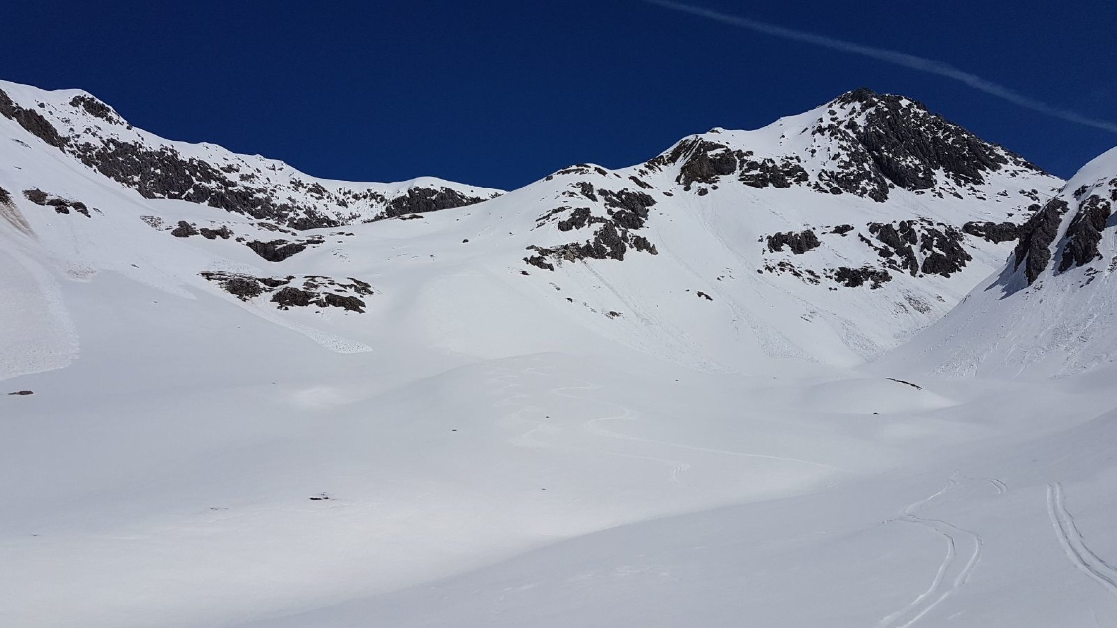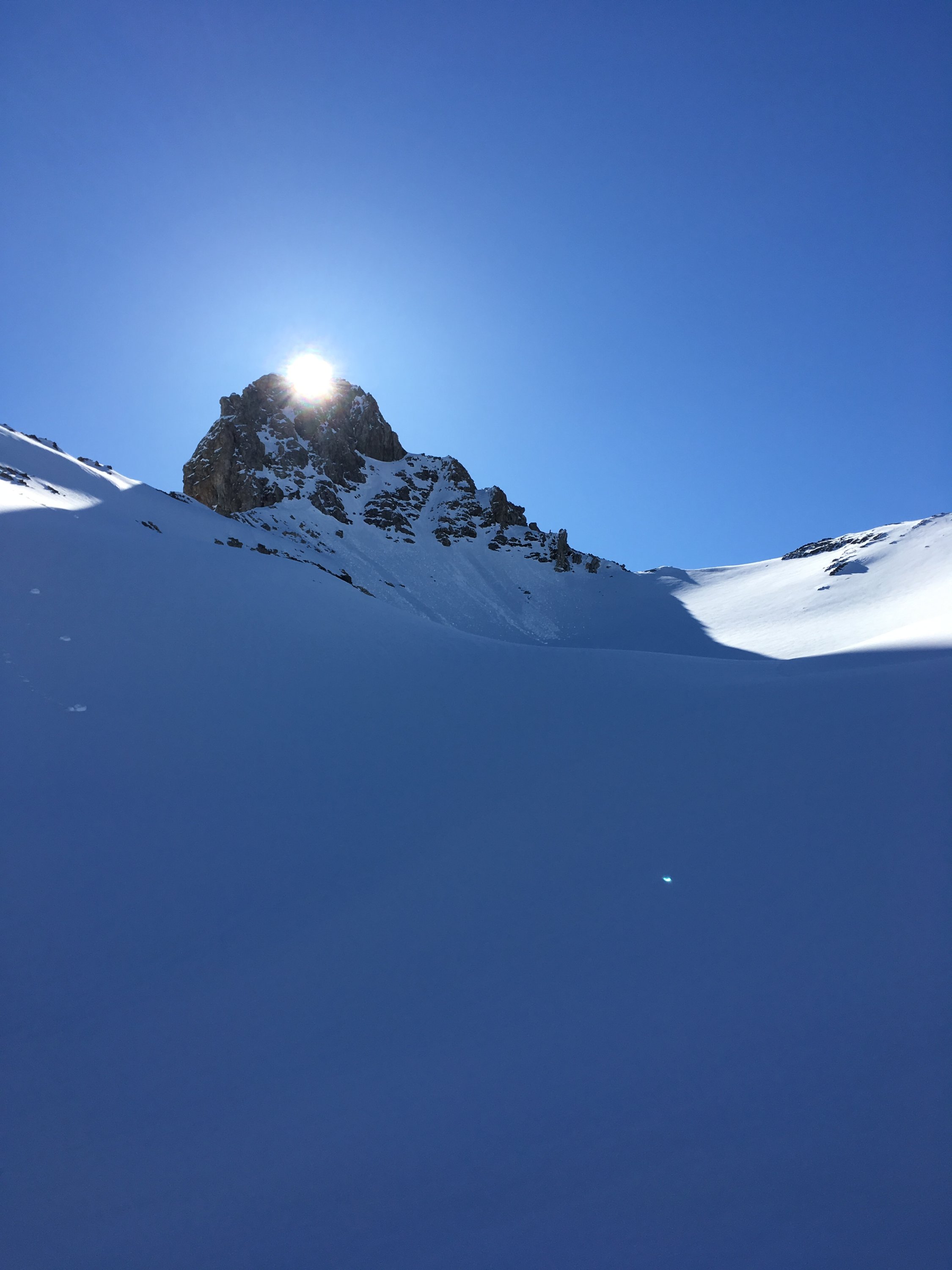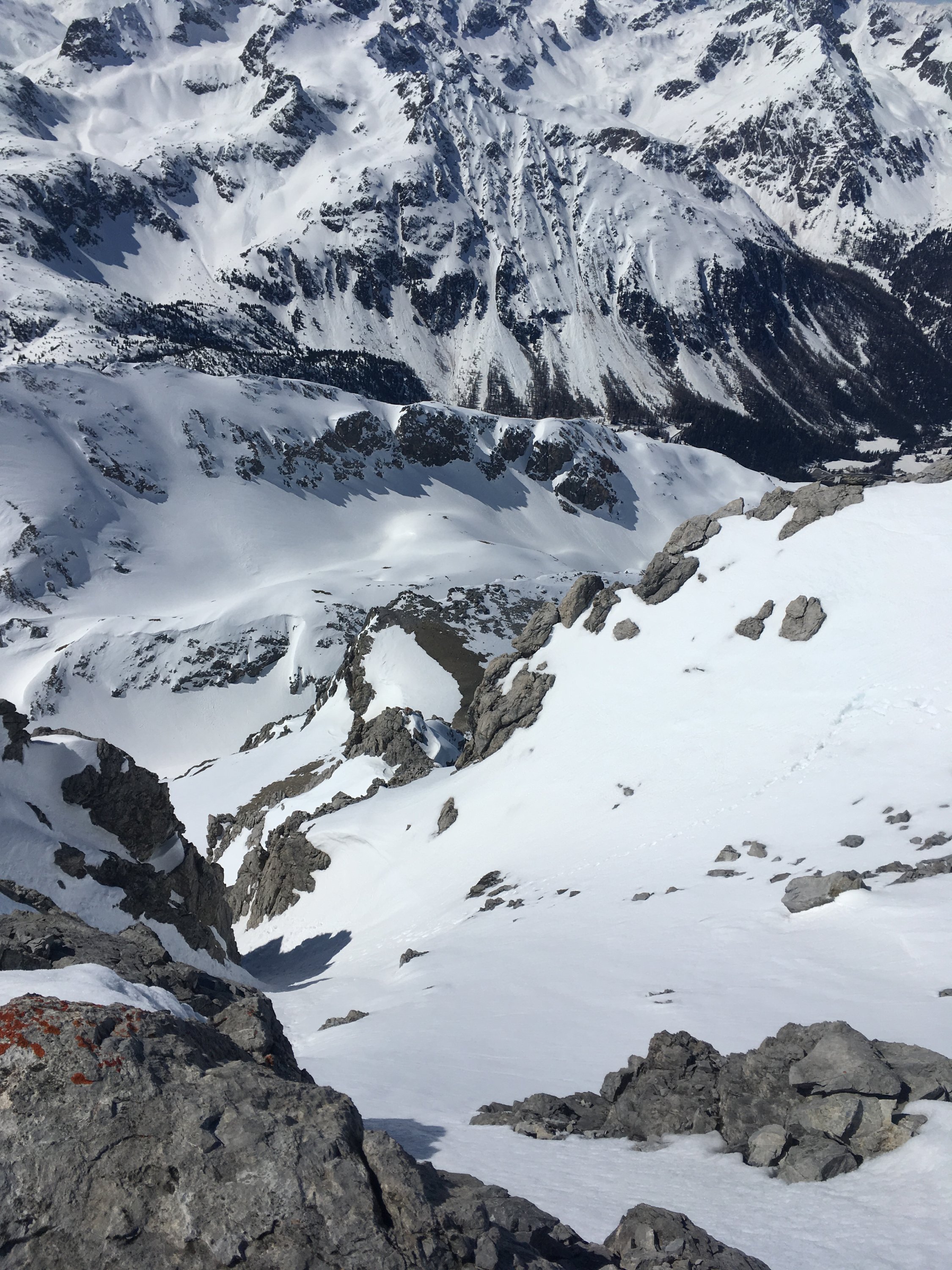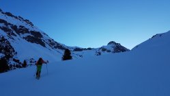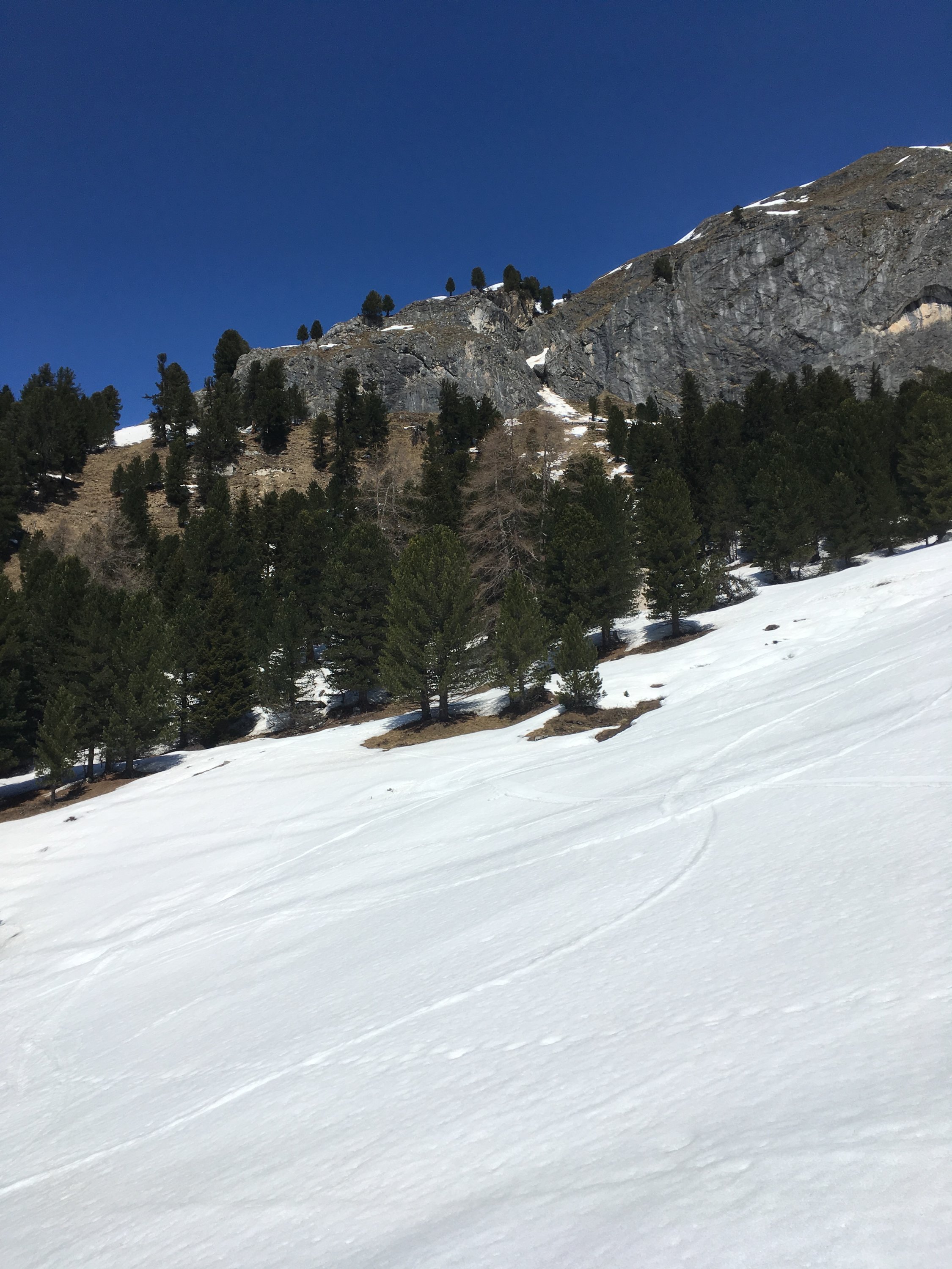 Start um 06.15, minus 2 Grad und etwas Nordwind. Im Wald etwas ruppig aber genügend Schnee für Aufstieg. Ab Cuziranch harter Firn und schöner Aufstieg im Schatten bis Sattel 2900 m. Im Couloir guter Trittschnee, Pickel und Steigeisen obligatorisch. Abfahrt bis P. 2138 im schön weichen Firn. Ab 2100 m kurze apere Stelle auf 100 Höhenmeter, weiter unten fahrbarer Sulzschnee.