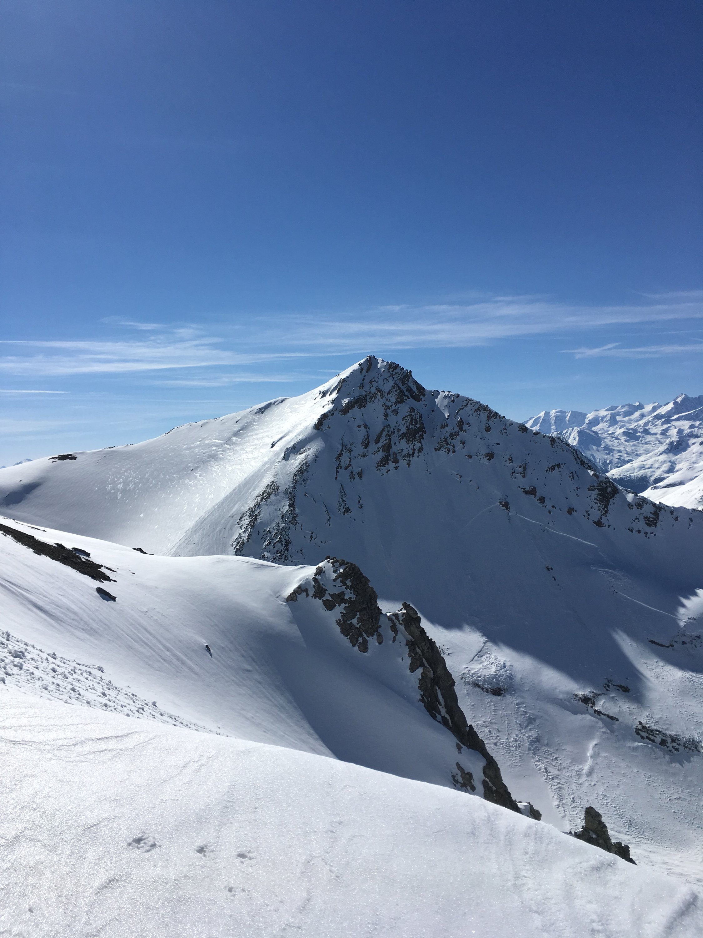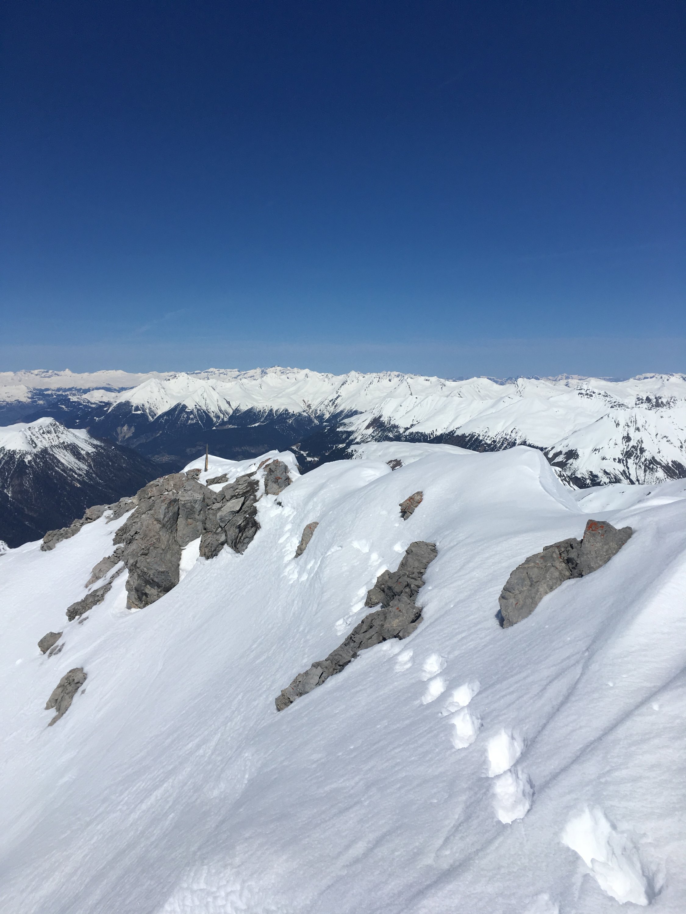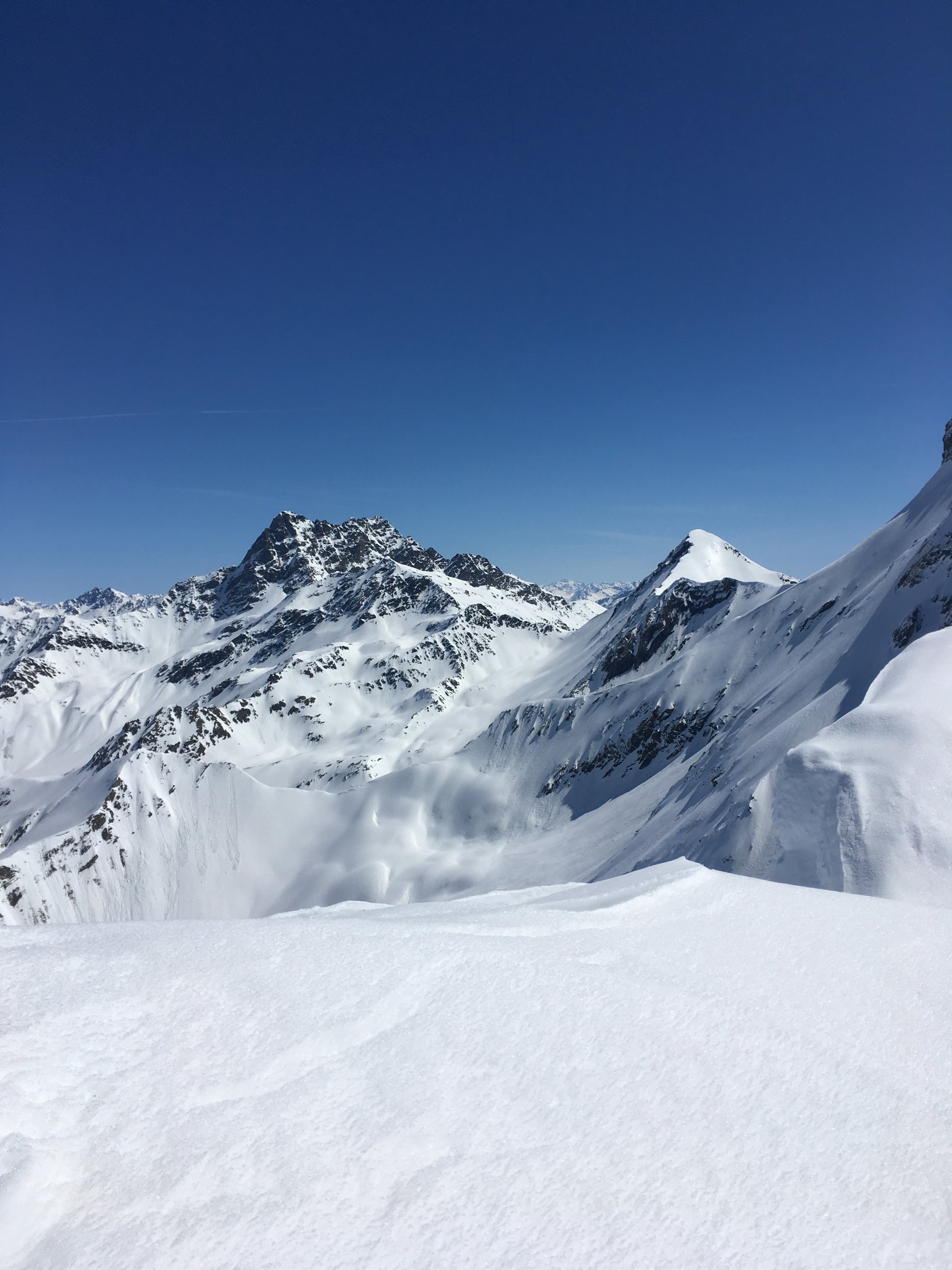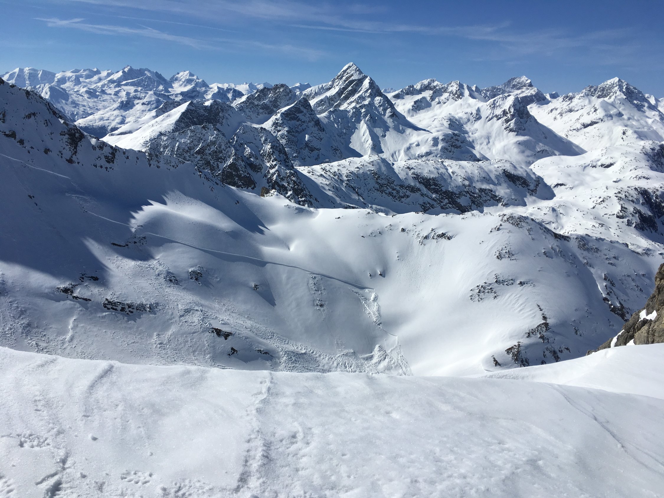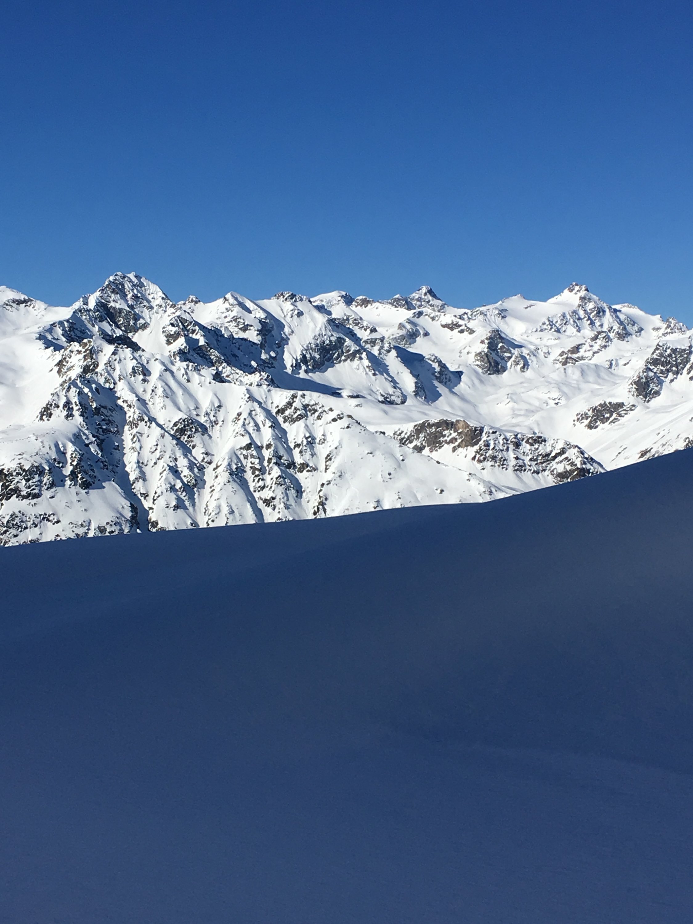 Start um 06.15, minus 2 Grad und etwas Nordwind. Im Wald etwas ruppig aber genügend Schnee für Aufstieg. Ab Cuziranch harter Firn und schöner Aufstieg im Schatten bis Sattel 2900 m. Im Couloir guter Trittschnee, Pickel und Steigeisen obligatorisch. Abfahrt bis P. 2138 im schön weichen Firn. Ab 2100 m kurze apere Stelle auf 100 Höhenmeter, weiter unten fahrbarer Sulzschnee.