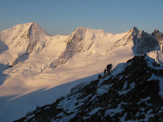 Die Verhältnisse sind momentan ausgezeichnet. Es liegt sehr viel Schnee im Gebiet. Die Tragepassage oberhalb des Frühstücksplatz beträgt momentan max. 50m. Kein Eis und guter Trittschnee am Grat. Die Abfahrt nach Blatten wird noch länger möglich sein.