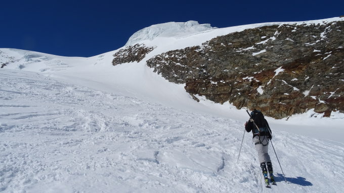 Die Gletscher sind alle noch extrem gut verschneit und man konnte keine einzige Spalte erkennen. Wir haben das Seil nicht verwendet. Der Schlussaufstieg zum Gipfel erschien uns trotz der späten Stunde noch zu hart für eine schöne Abfahrt, deshalb sind wir die letzten 200 hm mit Steigeisen aufgestiegen. Abfahrt zur Täschhütte mehrheitlich feinster dünner Firn auf festem Untergrund. Die Abfahrt nach Täsch unterhalb Otavan ist zur Zeit sehr mühsam, da die Strasse von Lawinen verschüttet ist. Rechts am Hang machbar doch recht sportlich durch den Wald mit kurzen Tragstrecken. Gemäss Hüttenwart ist die Abfahrt nur am Vormittag zu empfehlen.