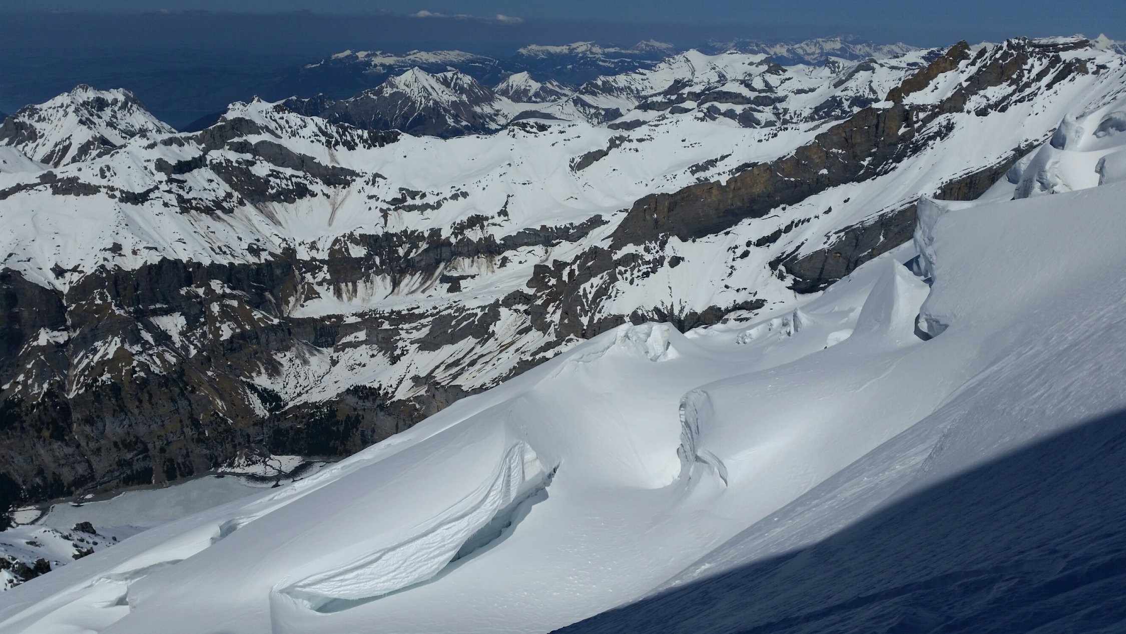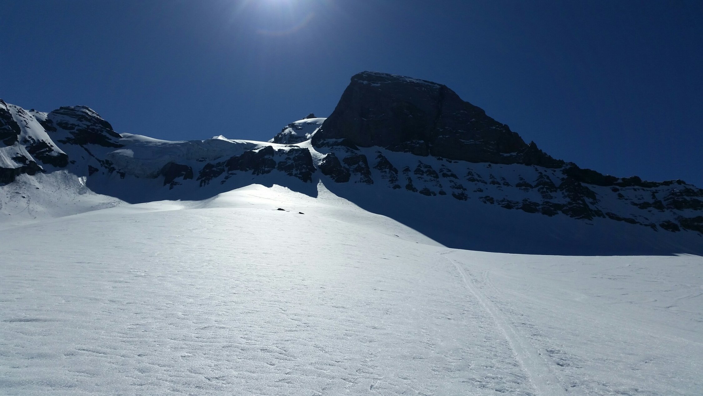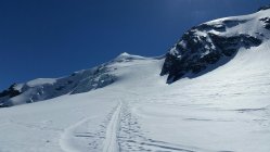Der Gletscher wird rechts problemlos umgangen. Oben gute Spur bis zum Gipfel.