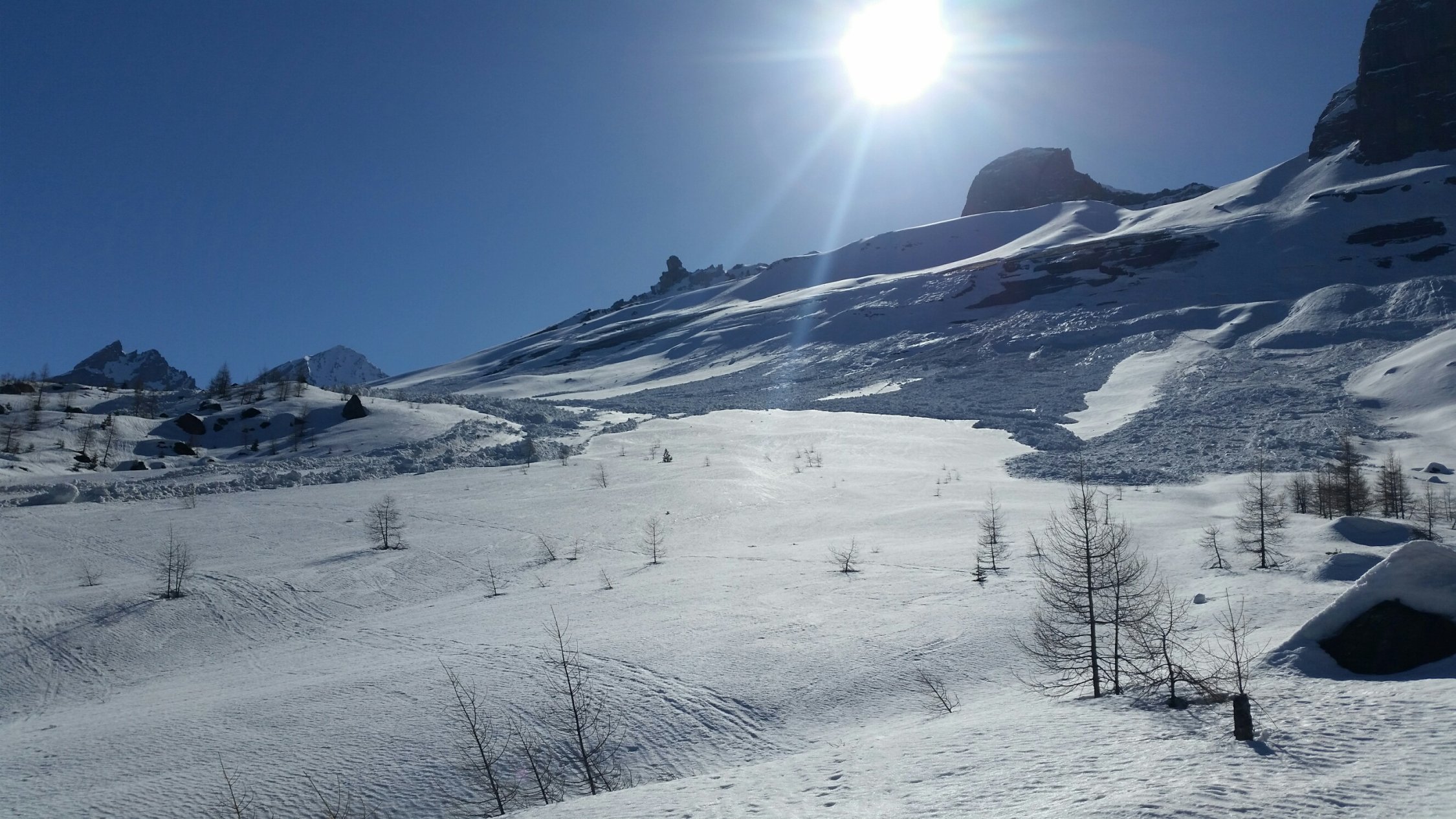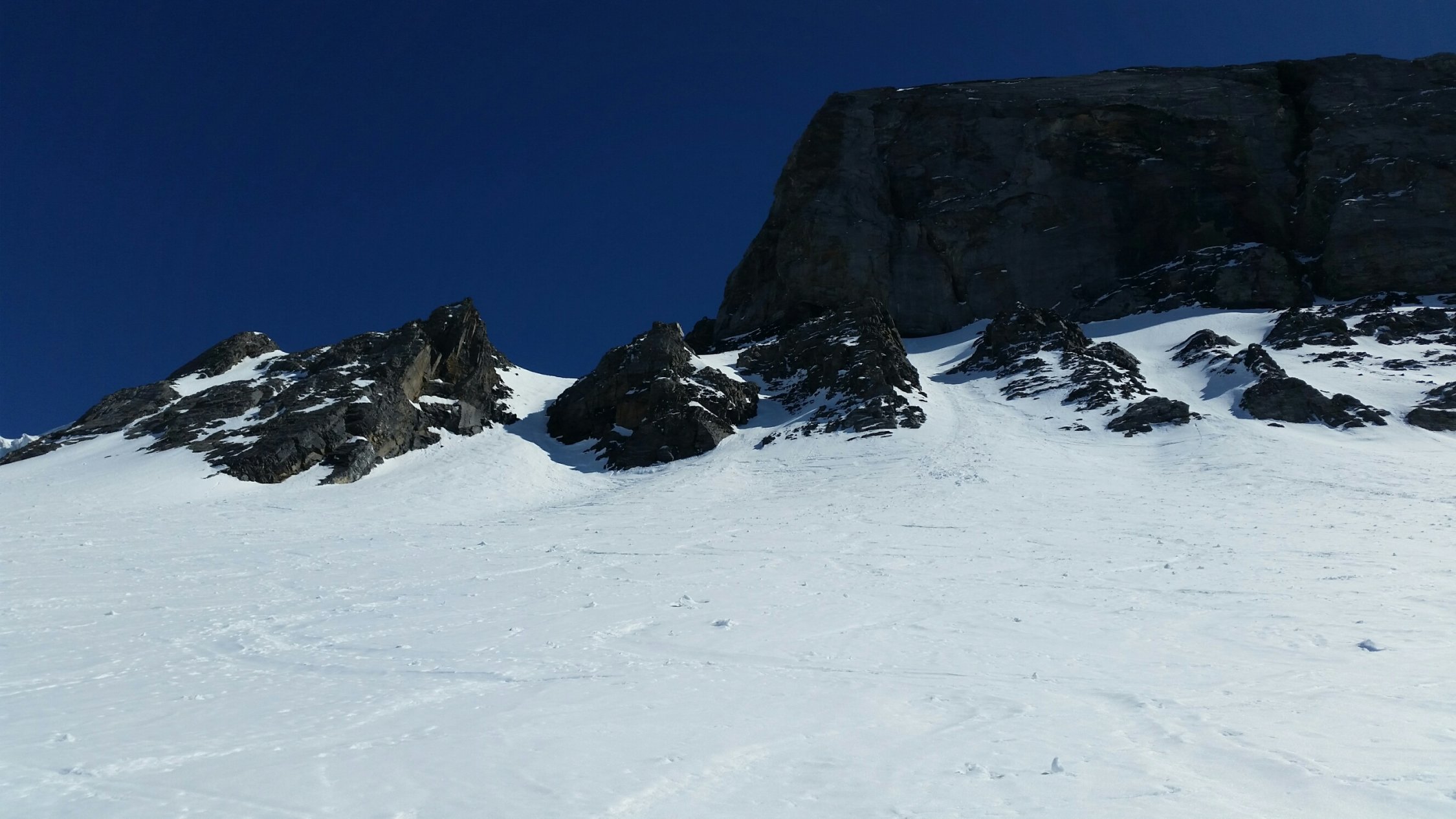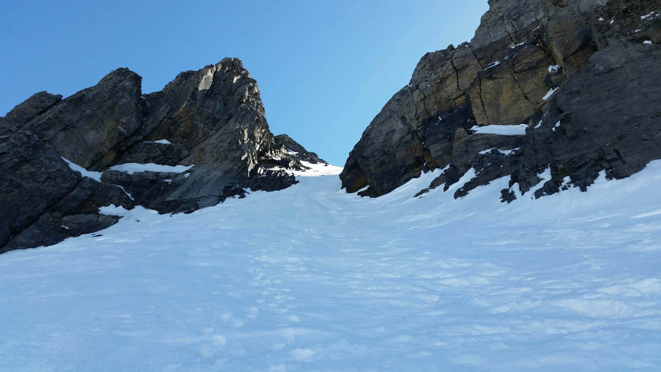 Der Couloir kann ohne Steigeisen gemacht werden. Bei der Abfahrt bin ich ihn abgerutscht (nichts für Anfänger)! Habe jedoch erst nach der Couloir-Abfahrt gesehen, dass daneben ein etwas weniger steiles Couloir lag.