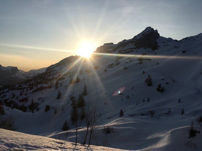 Bei diesem ausgesprochen warmen Wetter mag der Schnee nicht mehr gefrieren. Das heisst, dass schon am Start teilweise Nassschneeverhältnisse anzutreffen waren. Im Bereich Hälmisbiel dann die steilen Hänge gemieden und eher "flach" gelaufen. Die östlichen Hänge haben sich schon ordentlich entladen.