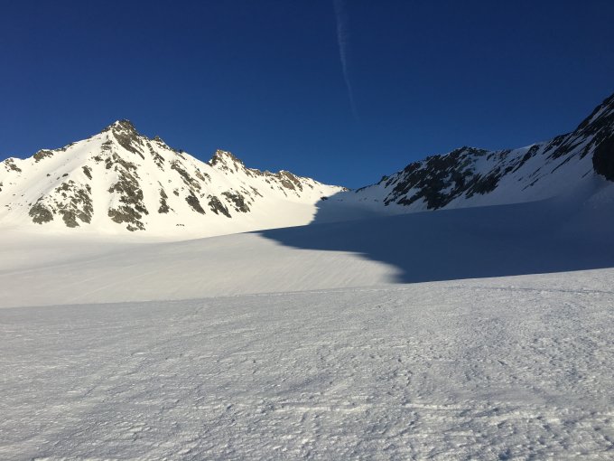 Corbassieregletscher meterdick eingeschneit, praktisch alle Spalten zu. Beim Start um 6:00 tragend gefroren, Temperatur etwa 0 Grad. Hänge unterhalb col de Corbassière haben aufgrund Südost-Expo ab 7:00 bereits Sonne, frühe Abfahrt daher sinnvoll. Letzte 80 m auf Gipfel mit steigeisen. Retour erst am col de Corbassière abgefellt, geniale Firnabfahrt um 9:45 ab Col. Hänge bis zur Hängebrücke unterhalb der Pannossiere Hütte sind wie gigantische Skipiste, genial zu fahren. Der folgende Abschnitt durch die enge Gletscherschlucht war dann der Oberhammer! Gegenanstieg zu P 2128 um 10:15 weich aber noch nicht durchbrechend. Später als 12:00 würde ich diese Hänge bei den momentanen Temperaturen- und der frühen sonneneinstrahlung - unbedingt meiden. Auf schönen Sulzhängrn bis zum Wald. Letzte 500 Hm steile Waldabfahrt, weniger schlimm als befürchtet, aber man kann darauf verzichten..